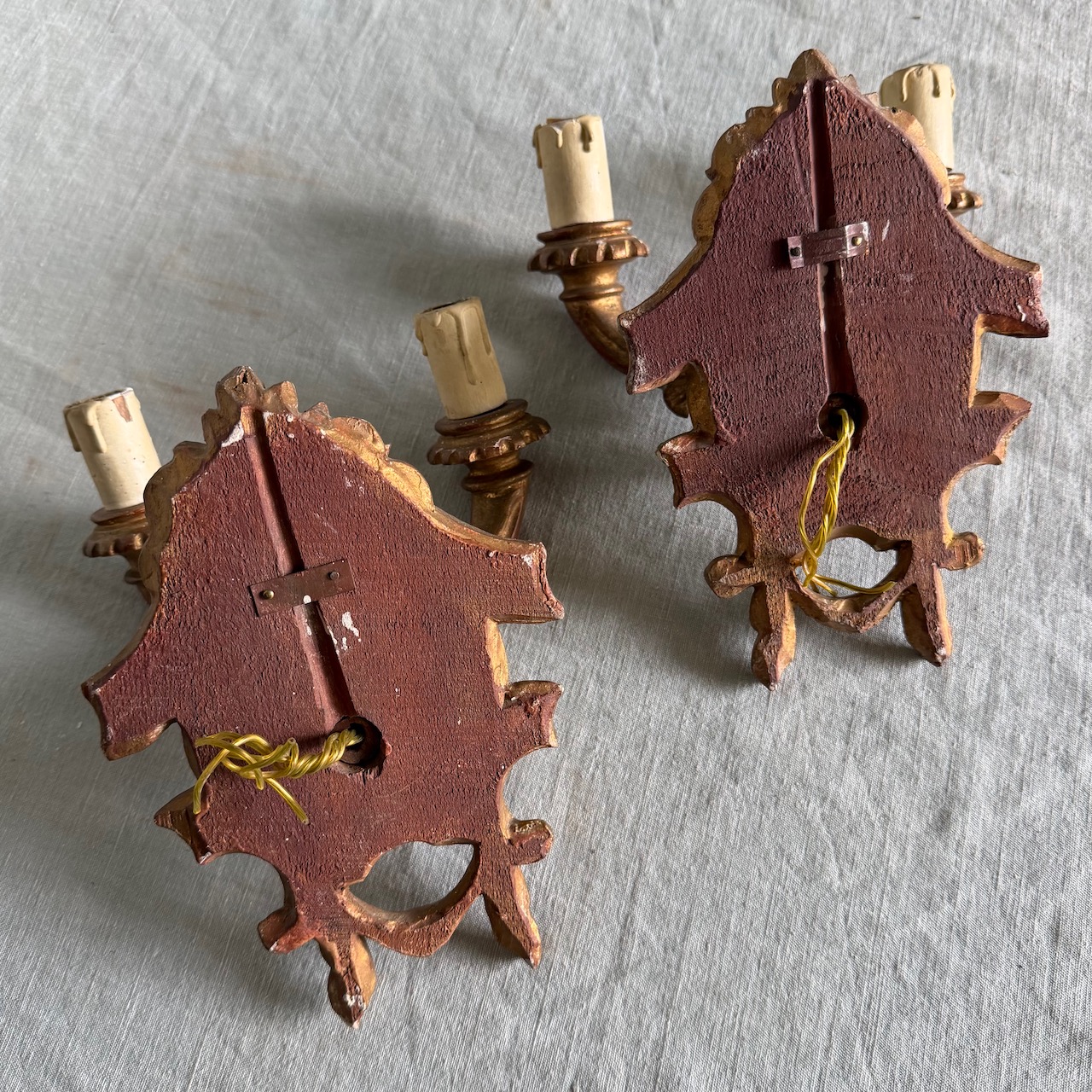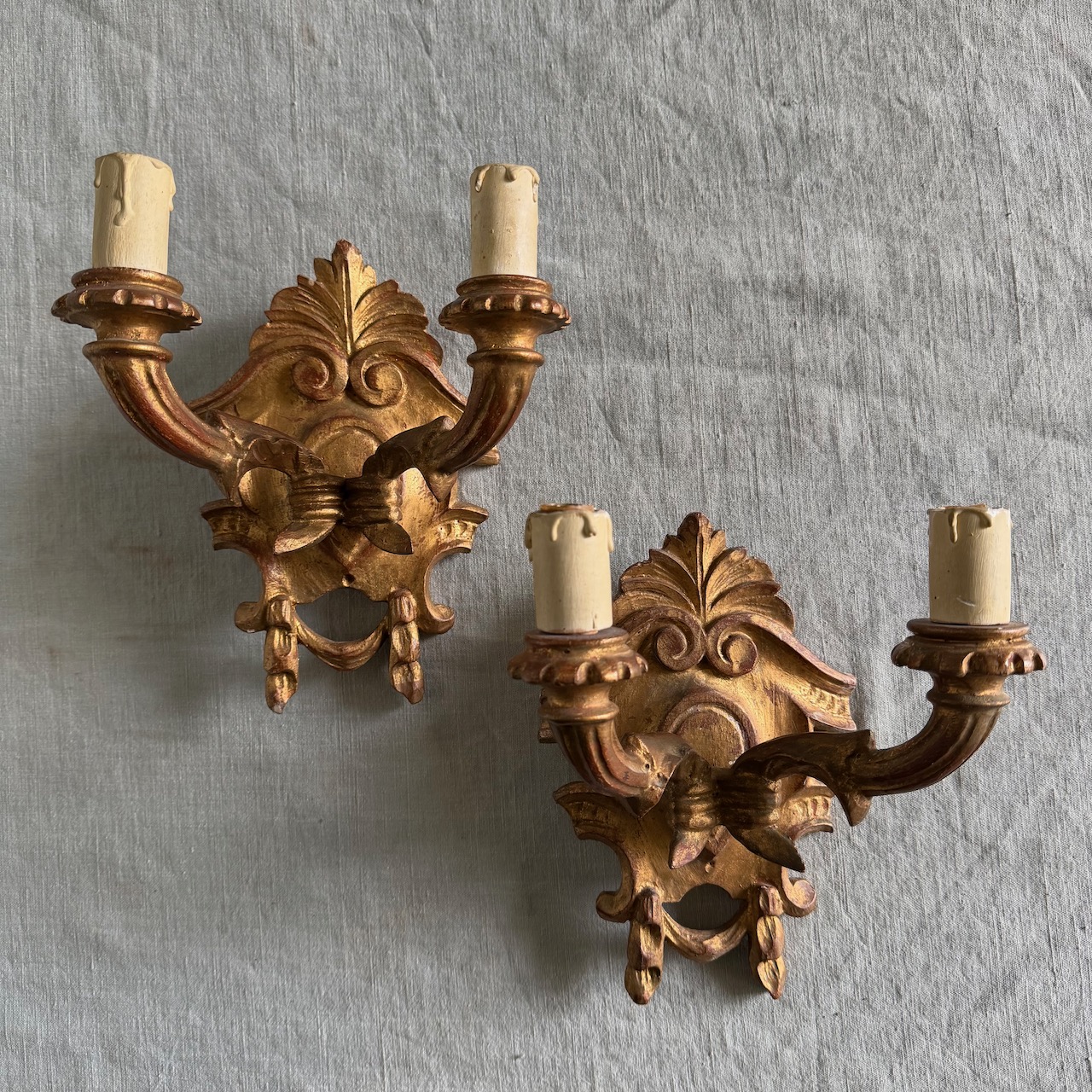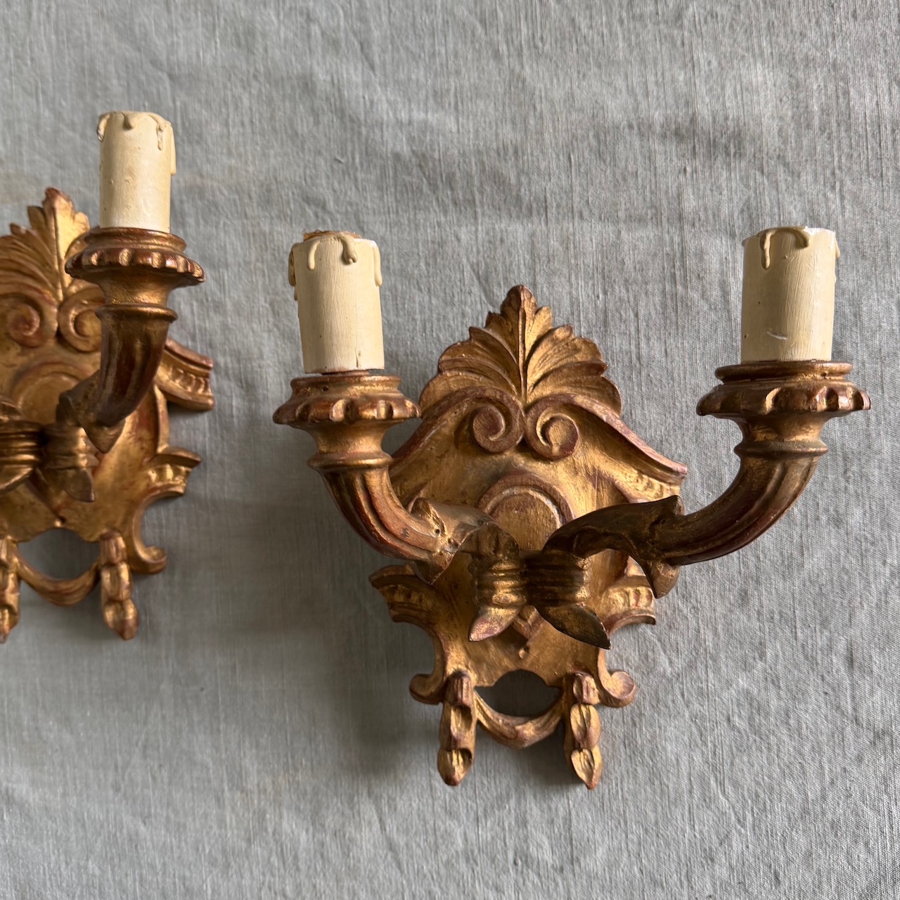 Coppia di appliques in legno scolpito e dorato su bolo rosso d Armenia a due luci. Firenze, inizio sec. XX