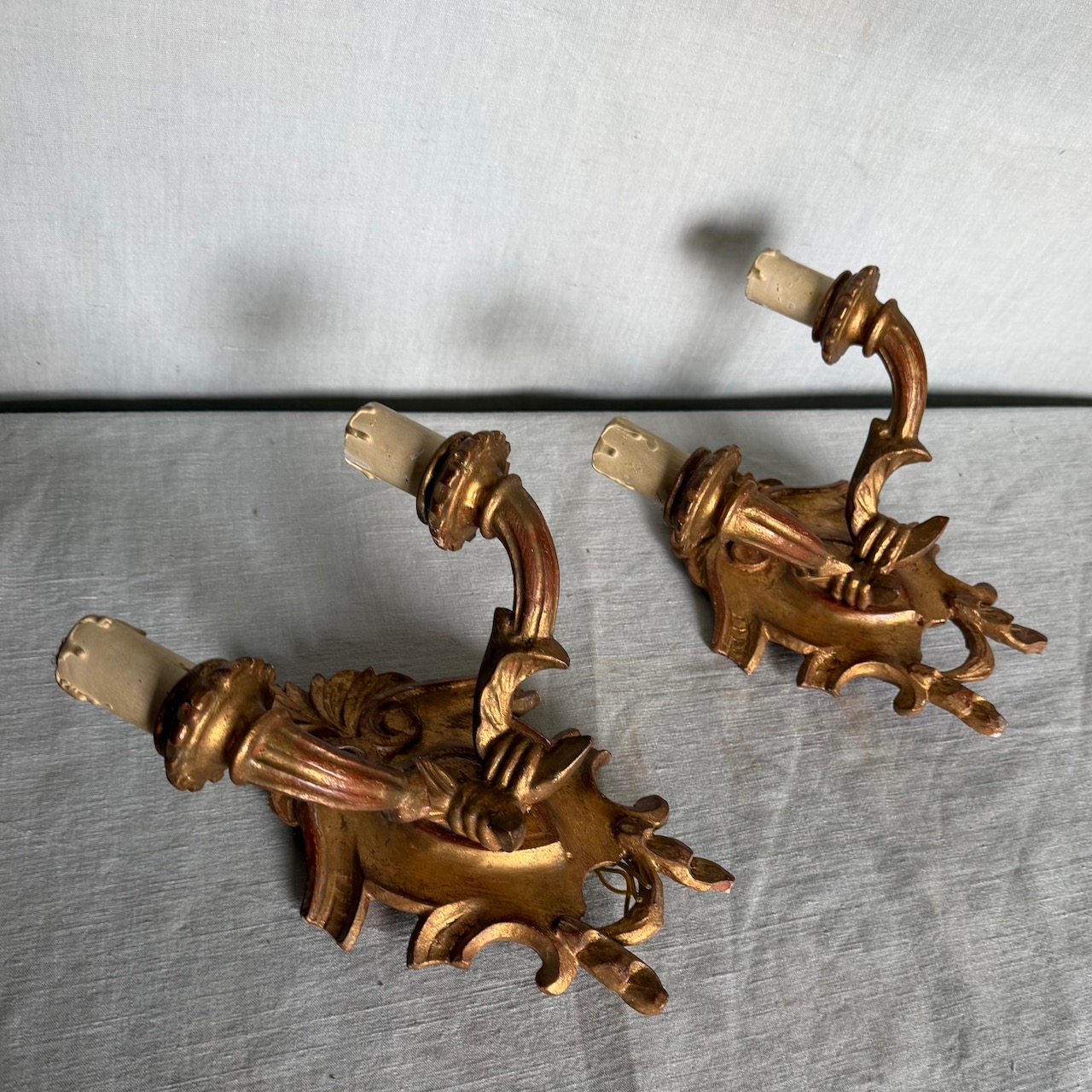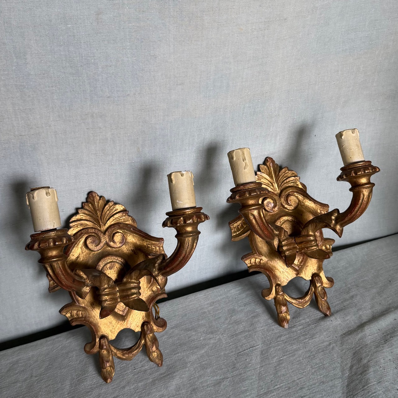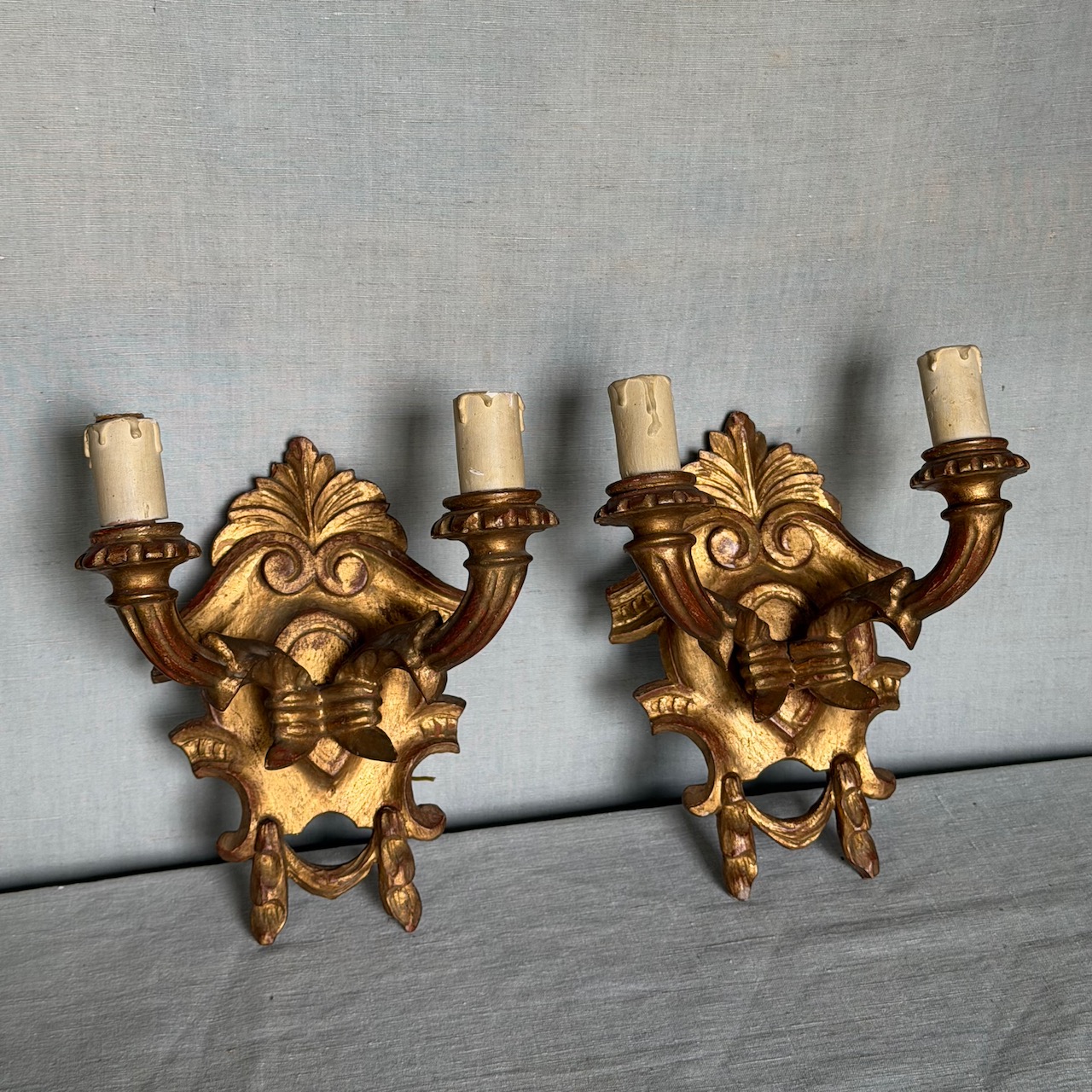 Coppia di appliques in legno scolpito e dorato su bolo rosso d Armenia a due luci. Firenze, inizio sec. XX