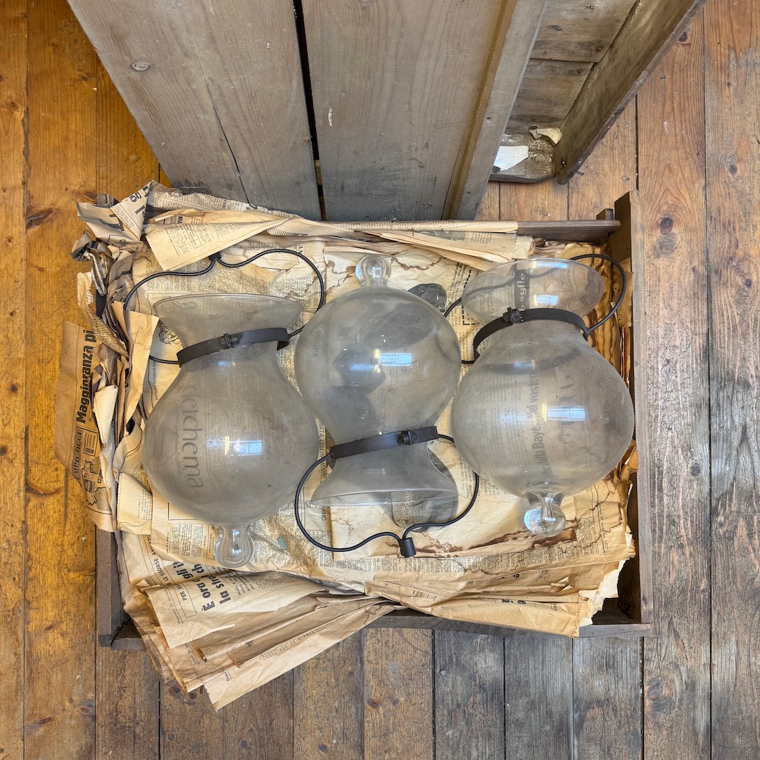 Tre grandi lucerna a goccia fiorentina in cristallo a soffio libero, con supporto in ferro. Italia, sec. XX