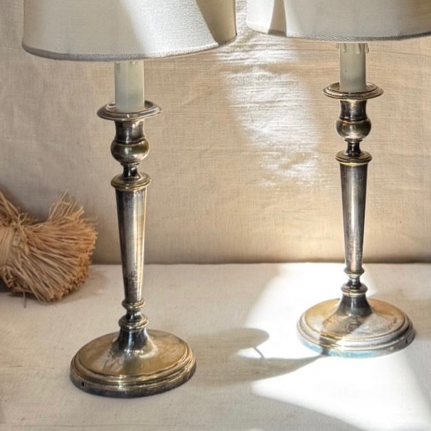Coppia di lampade da tavolo in argento su rame, ventole avorio con bordino. Italia sec. XX PARALUME NOLEGGIATO / VENDUTO SEPARATAMENTE