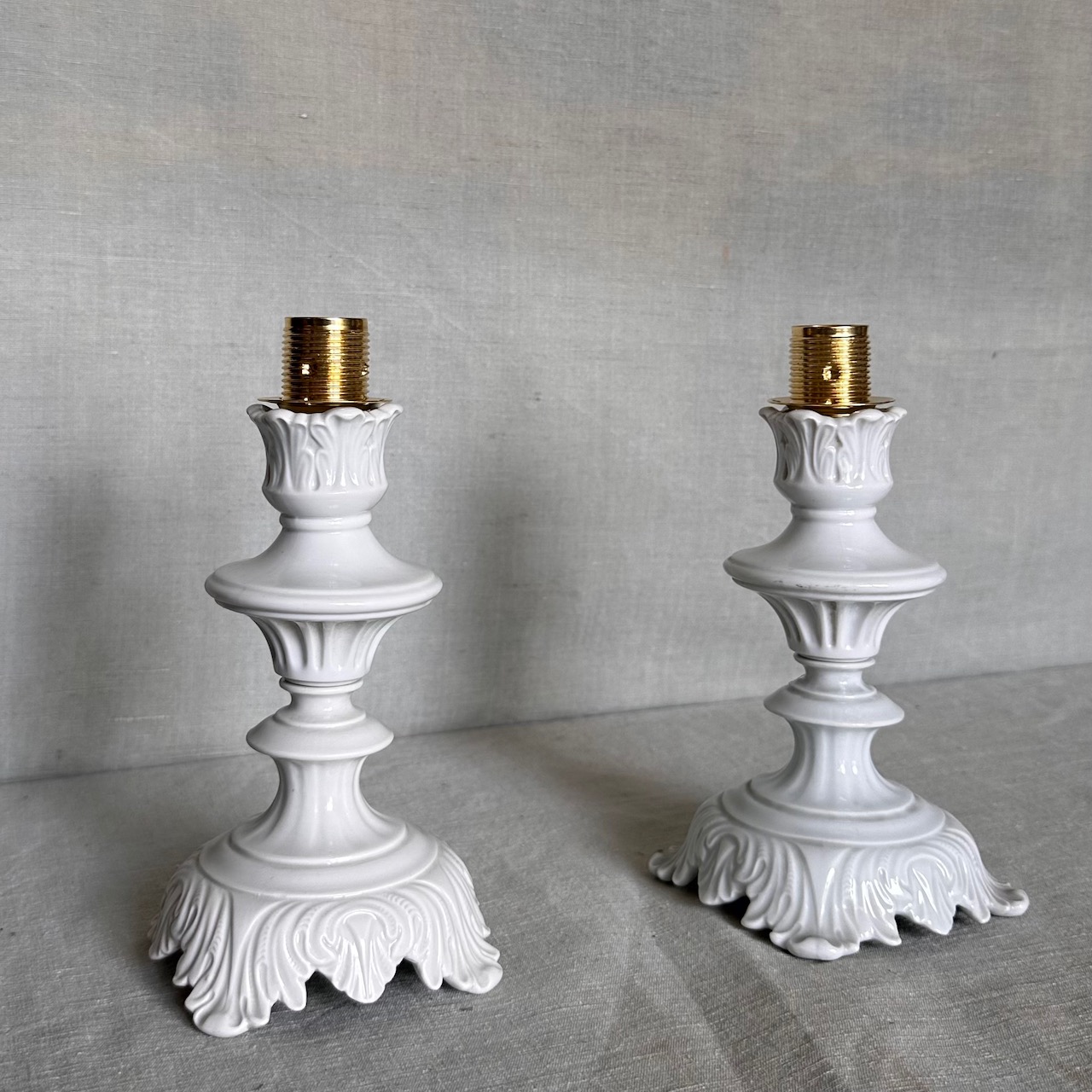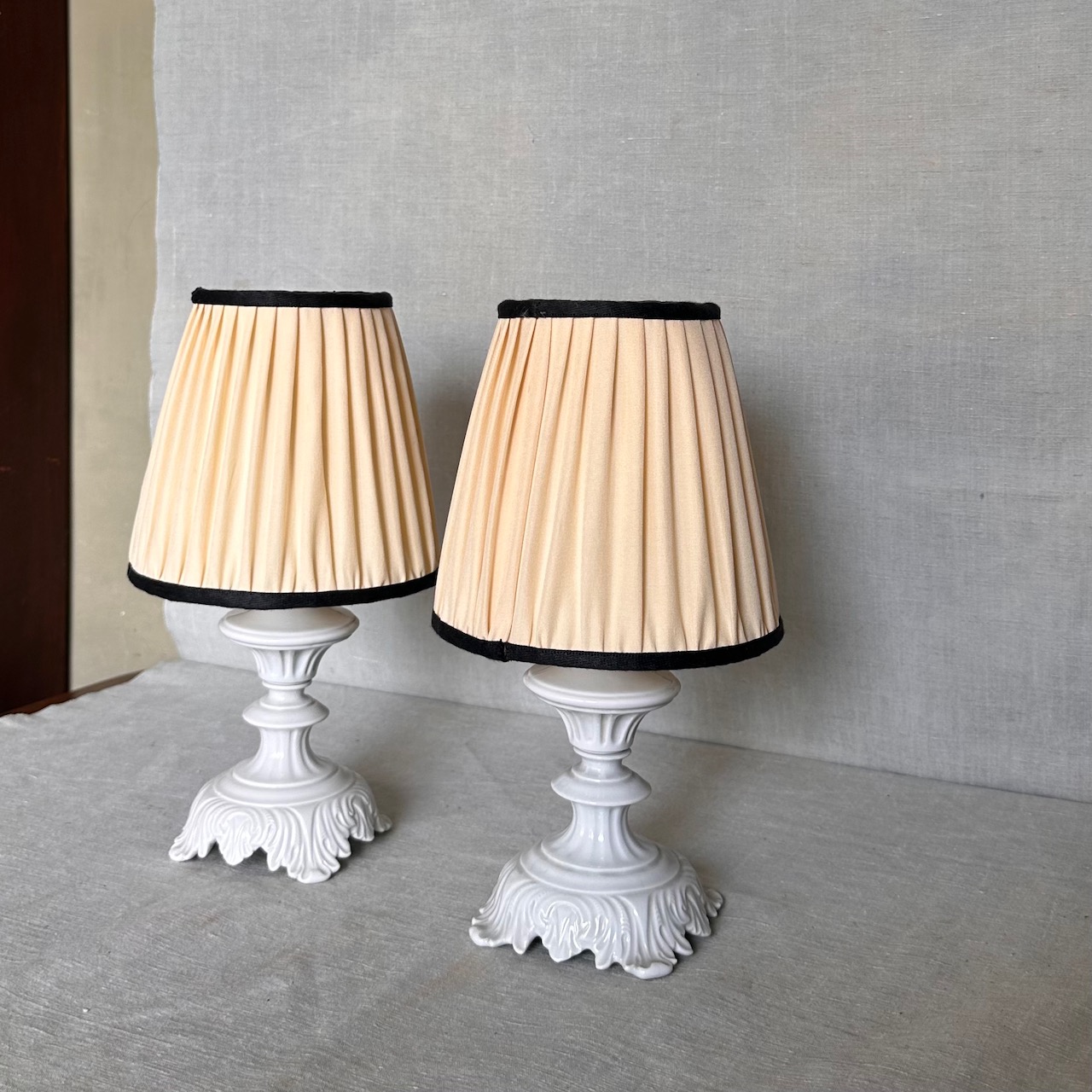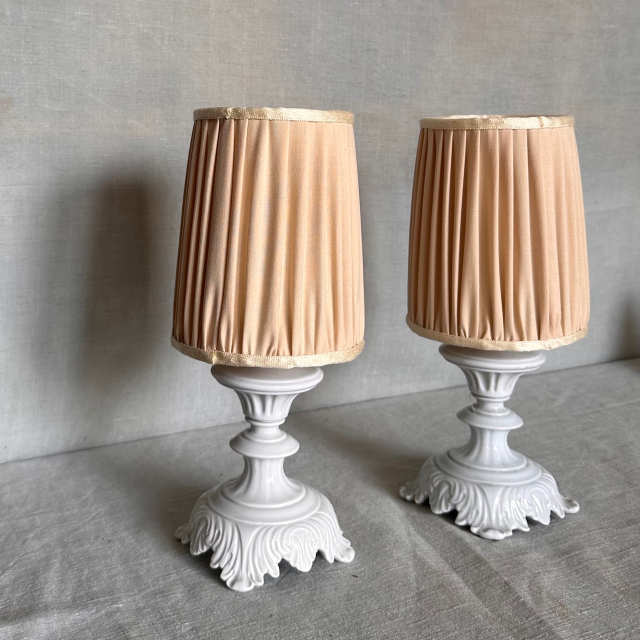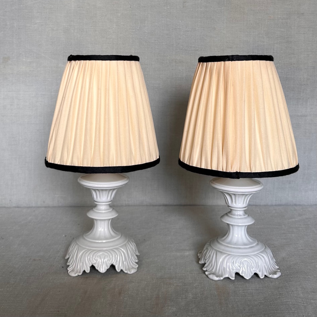 Coppia abat-jour porcellana smaltata bianca, paralumi seta avorio e bordino in tono. Italia, sec. XX
