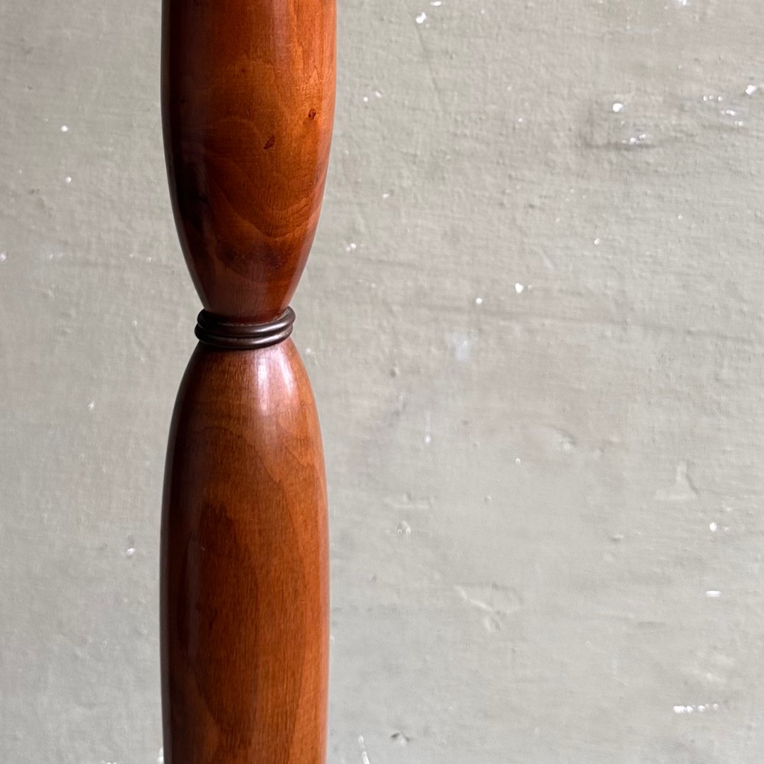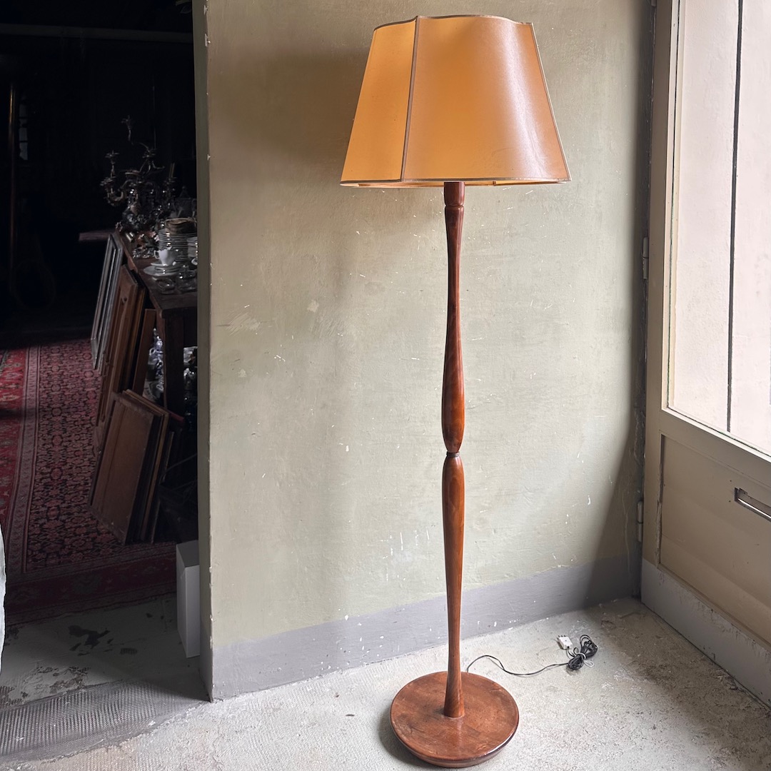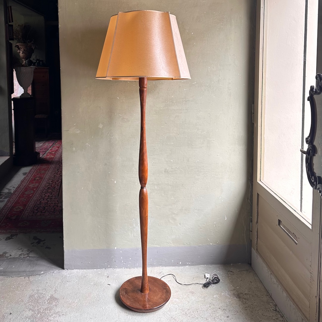 Lume da terra in noce, fusto bombato e riunito, paralume sagomato in pergamena. Italia, sec. XIX PARALUME NOLEGGIATO / VENDUTO SEPARATAMENTE