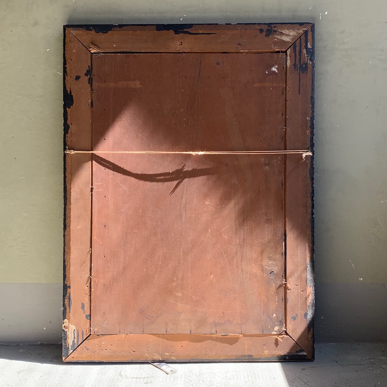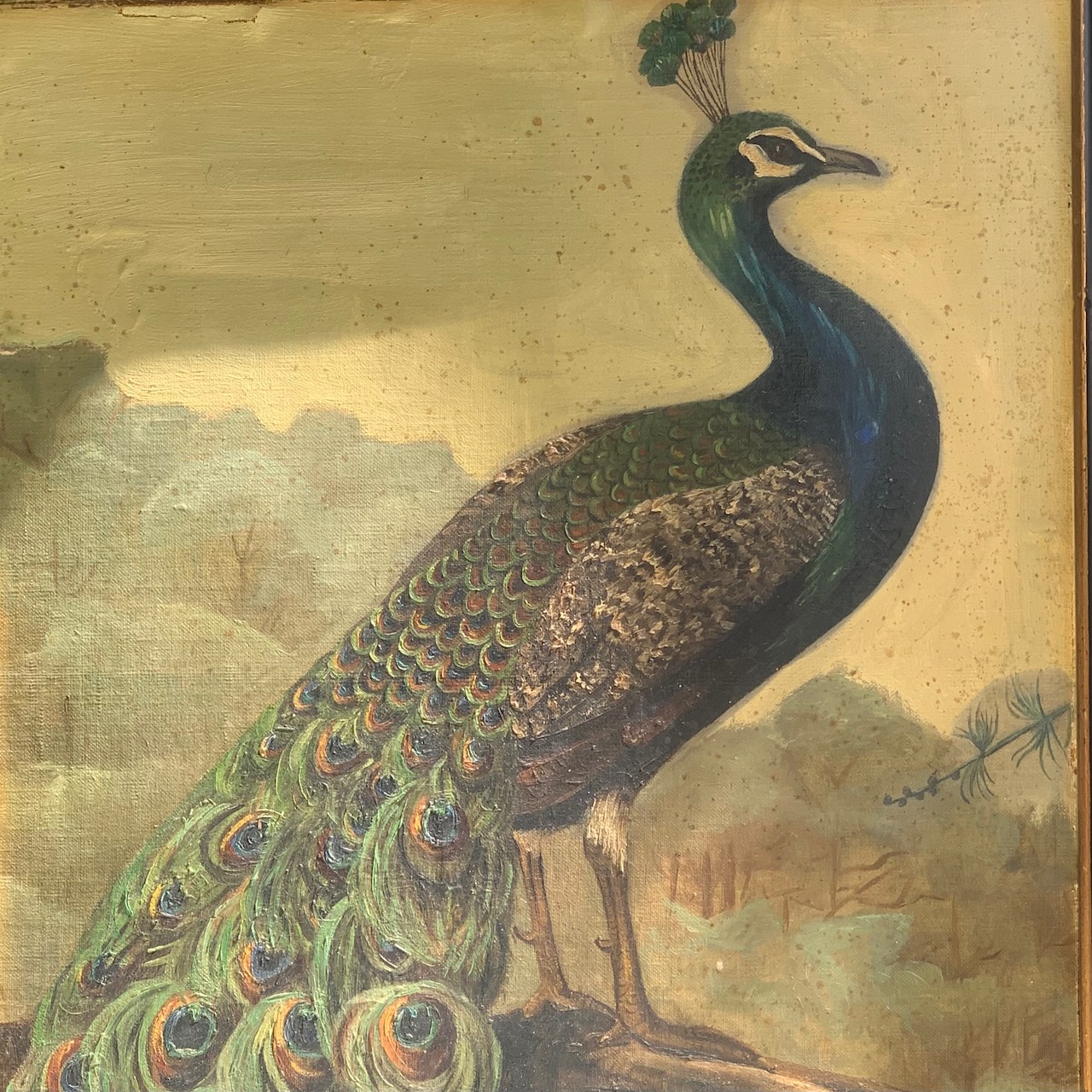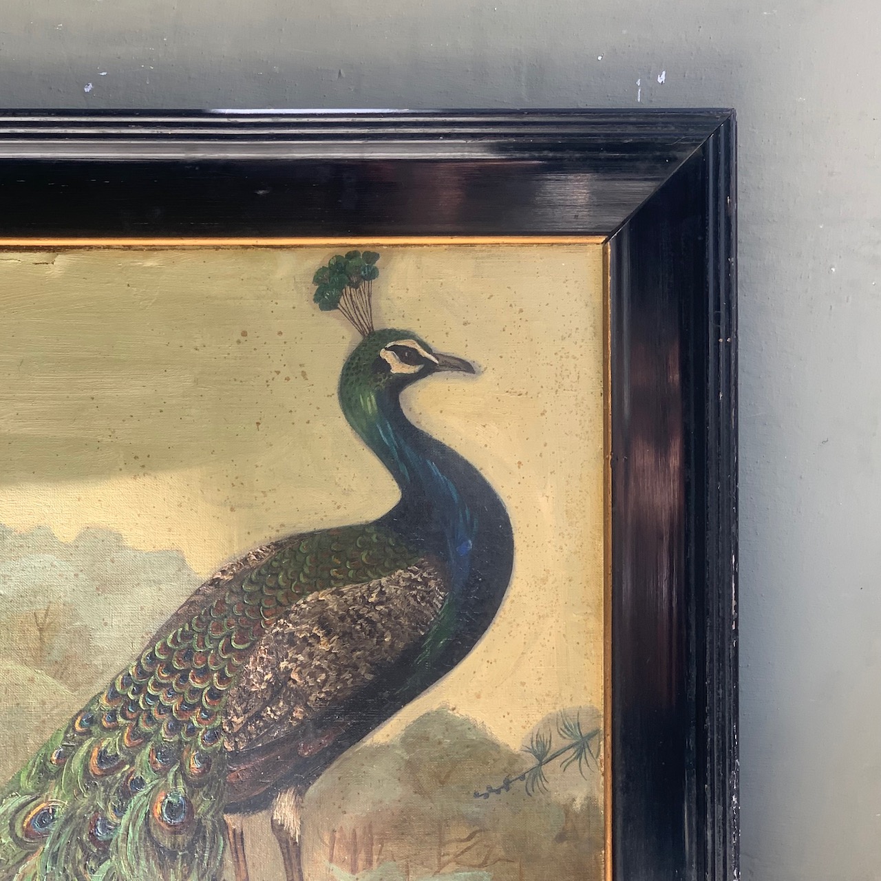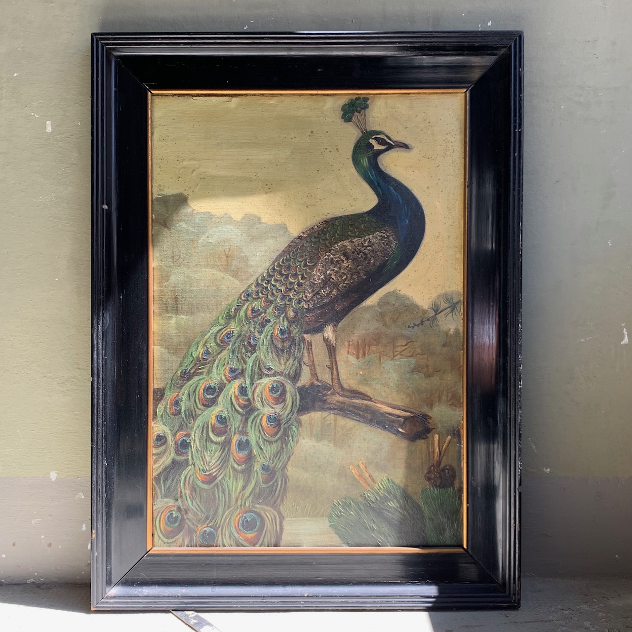 Pavone in paesaggio mediteraneo, dipinto olio su tavola in cornice coeva ebanizzata. Italia, 1920 circa NONDISPONIBILE