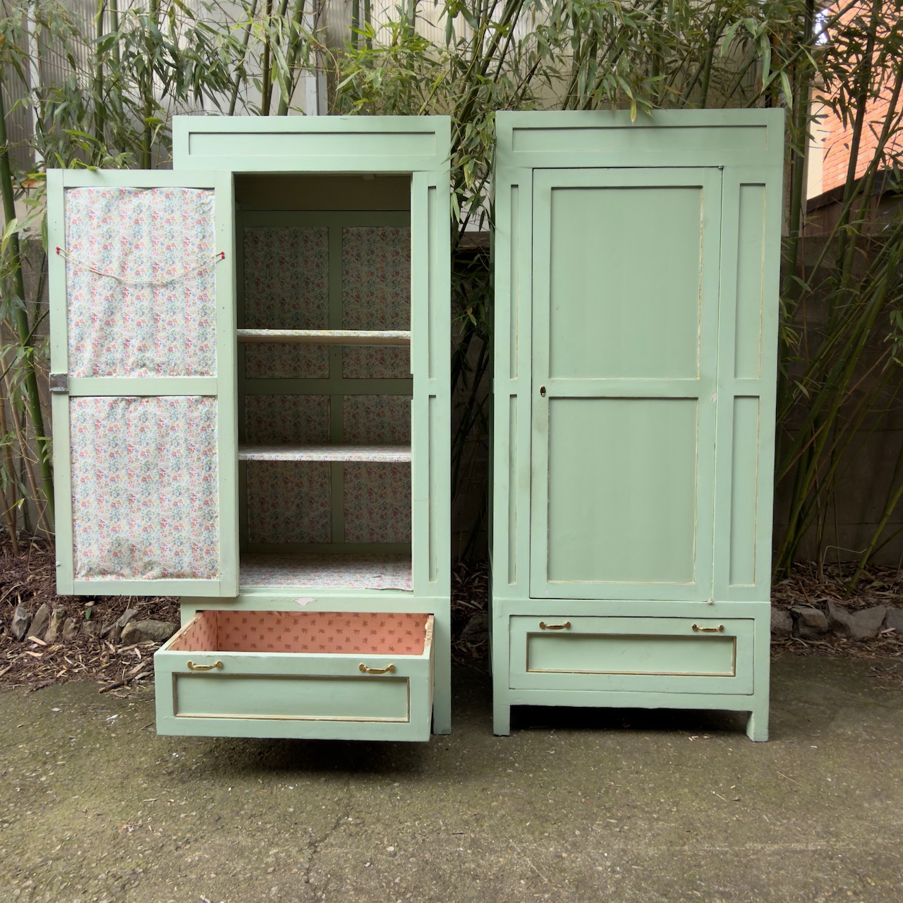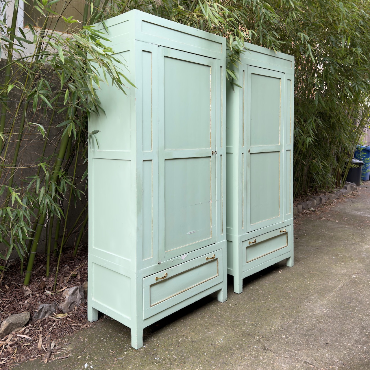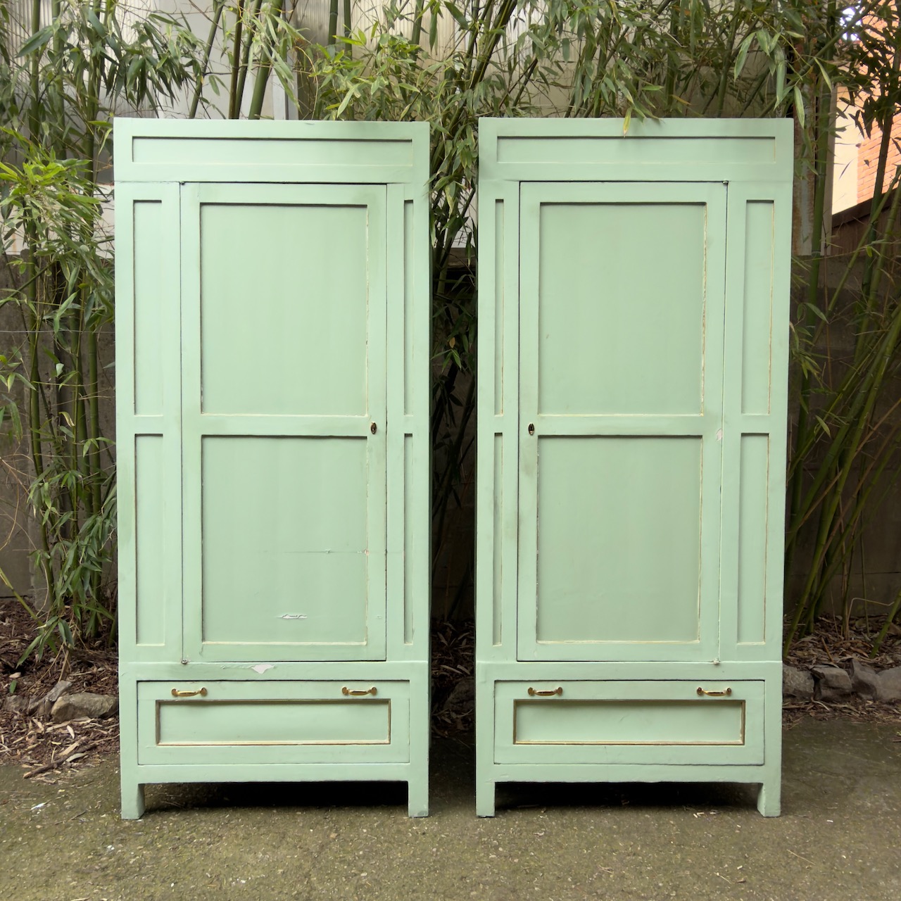 Coppia armadi guardaroba a colonna, in gattice laccato verde mente, uno sportello e un cassetto. Italia, sec. XX