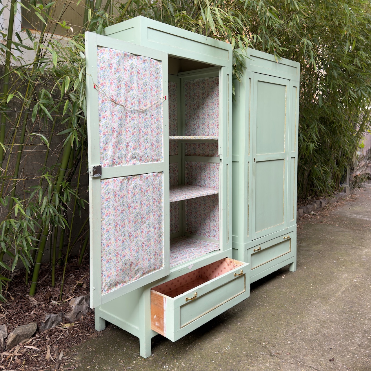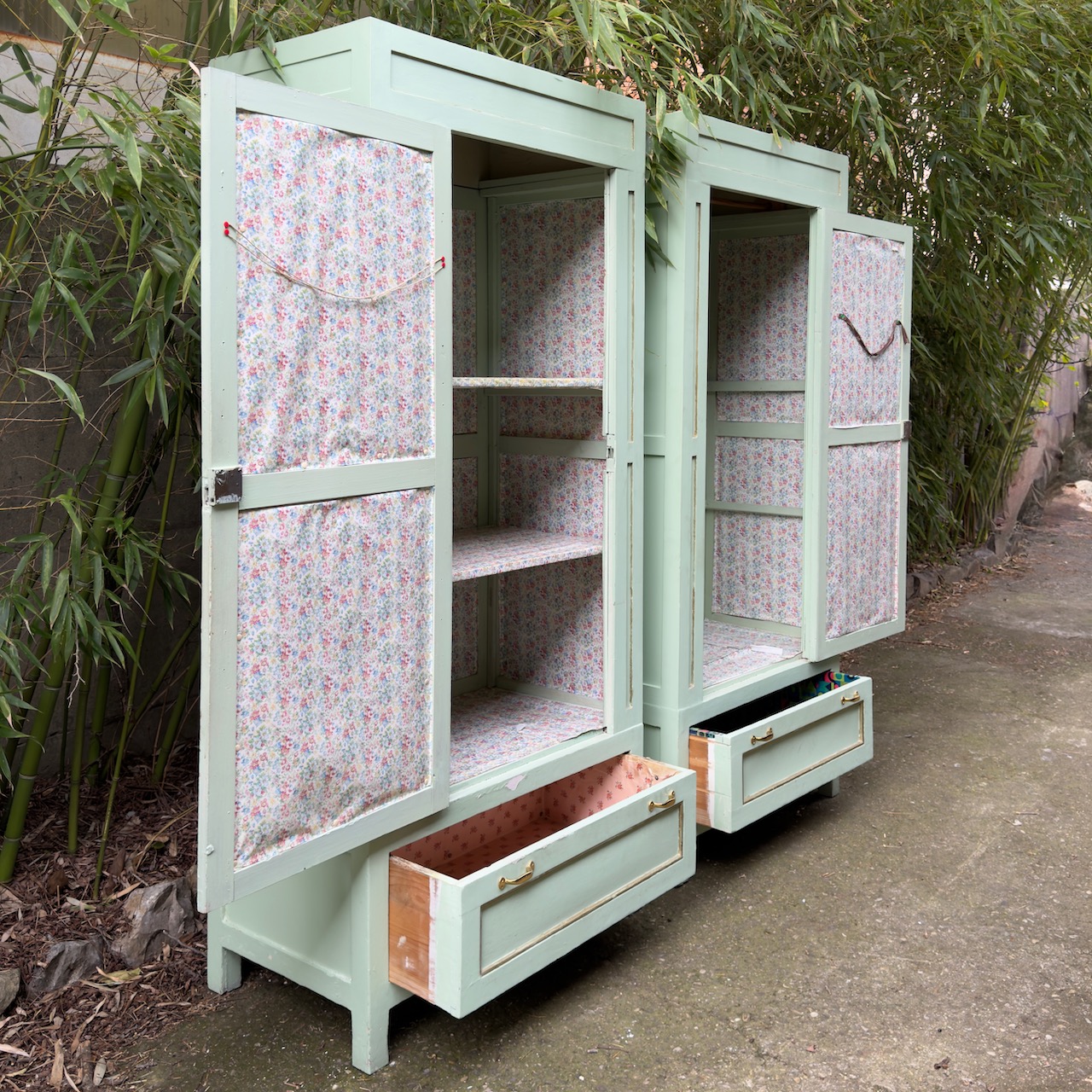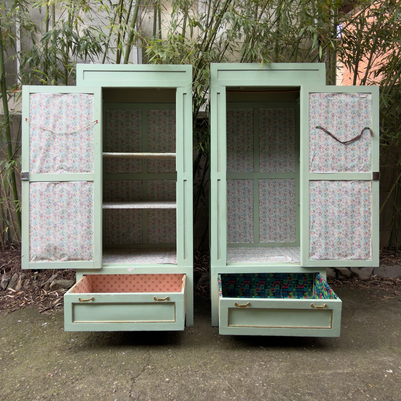 Coppia armadi guardaroba a colonna, in gattice laccato verde mente, uno sportello e un cassetto. Italia, sec. XX