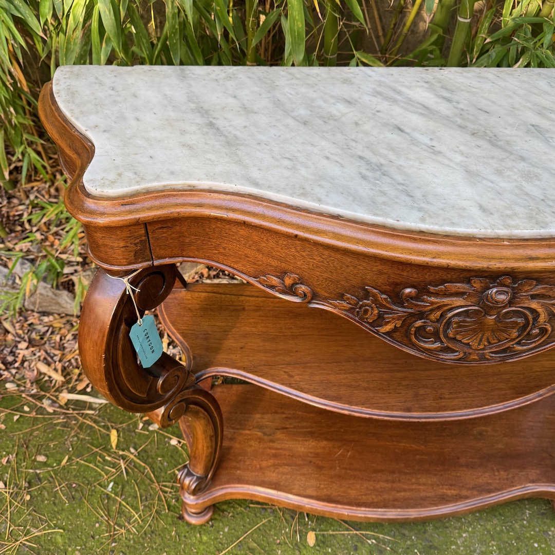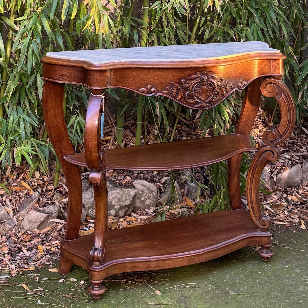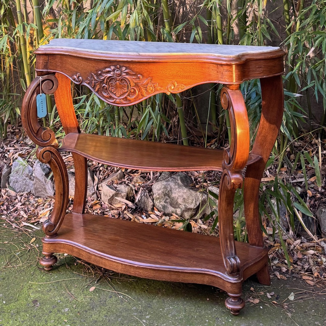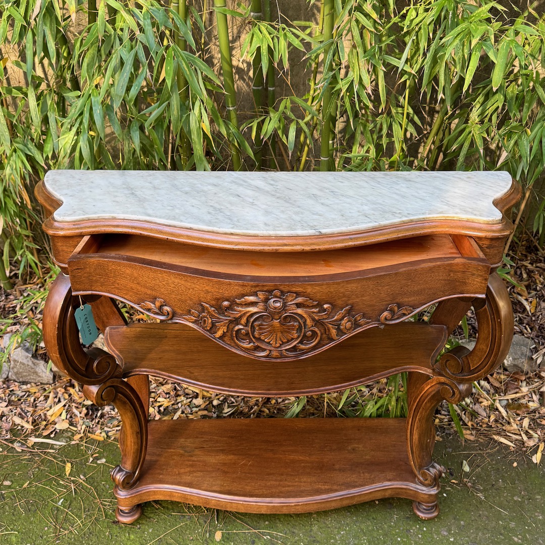 Consolle Luigi Filippo in mogano biondo, piano in marmo Carrara sagomato inserito nel piano, cassetto segreto sul grembiale, due sottopiani. Toscana, metà sec. XIX