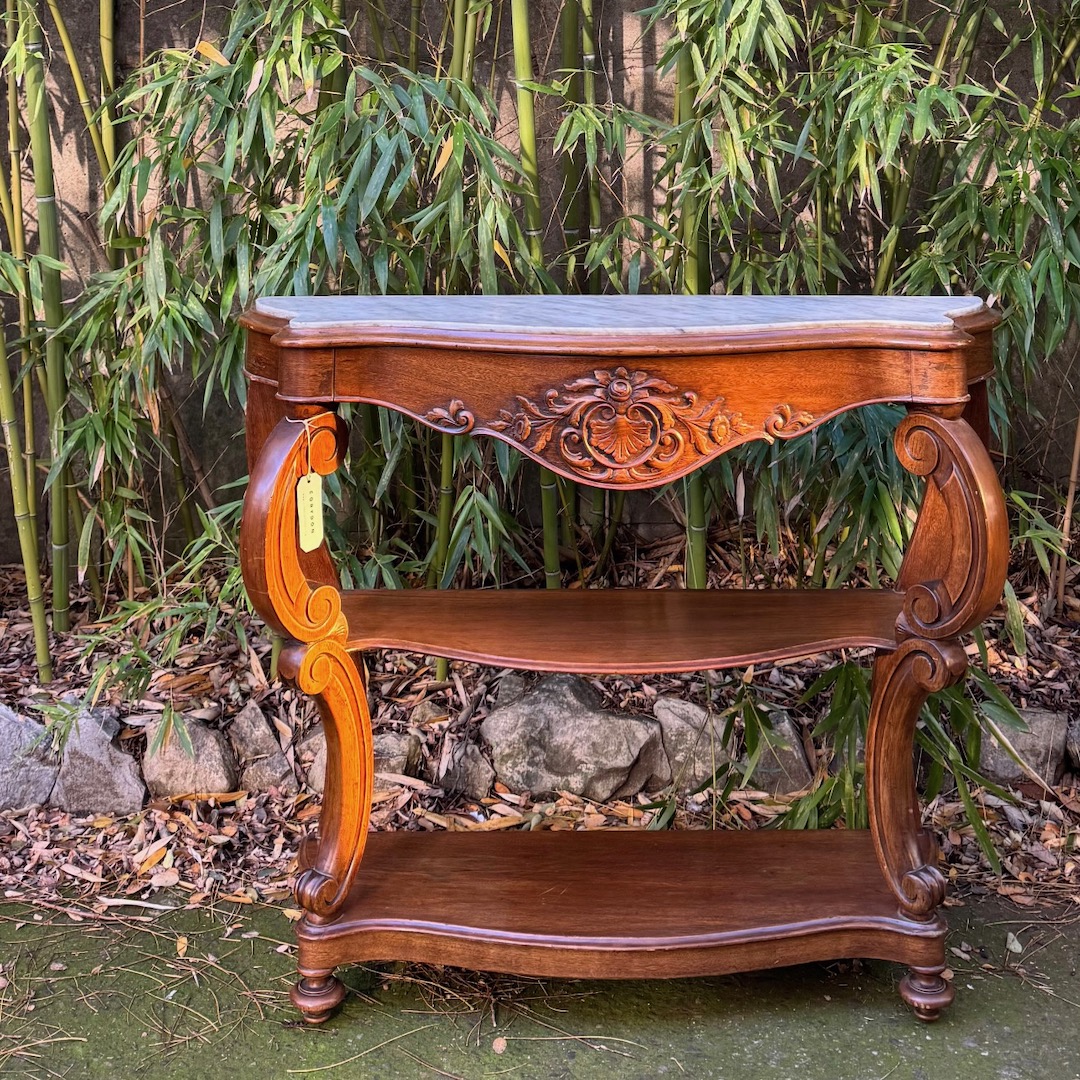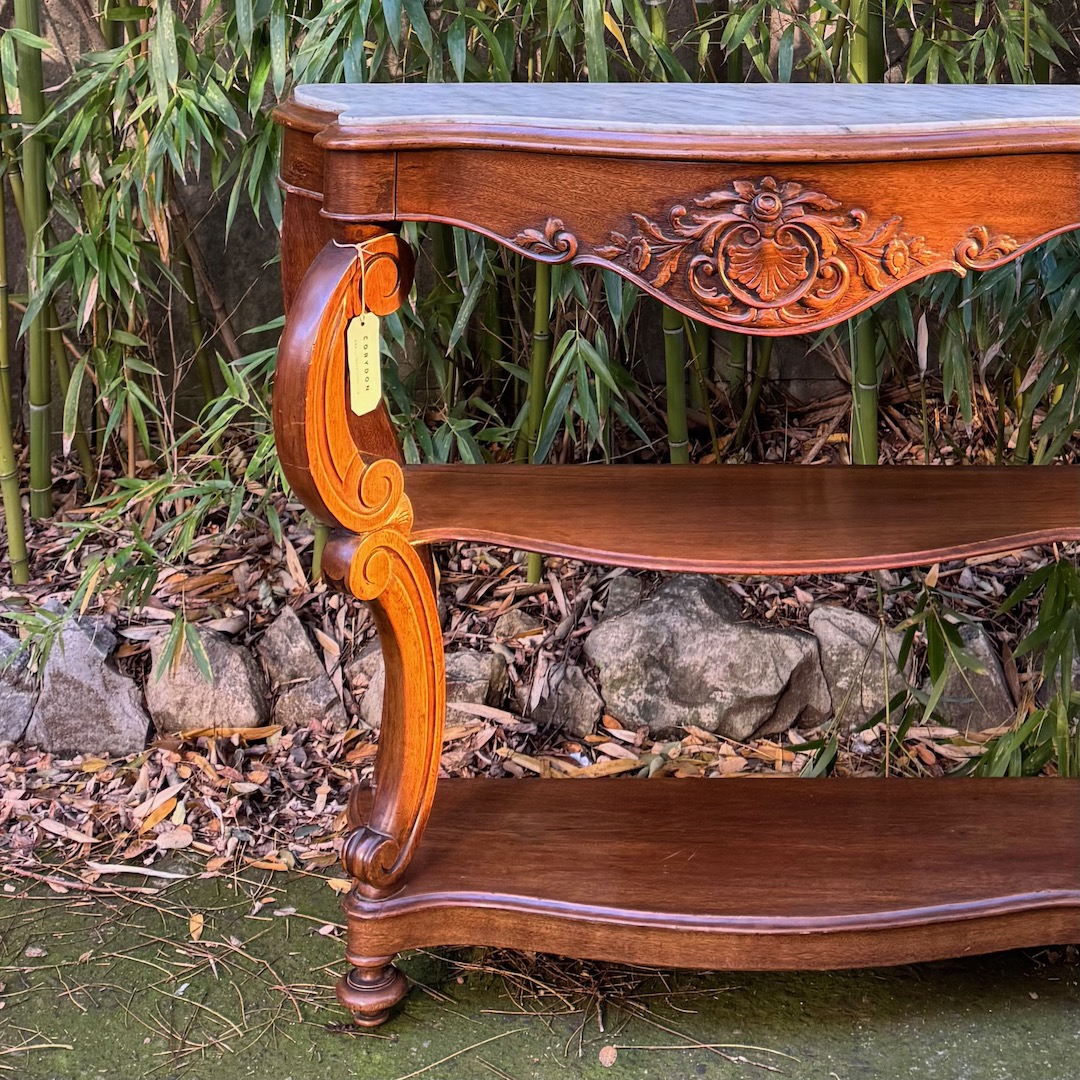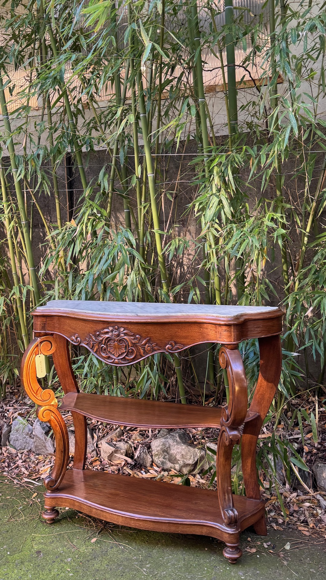 Consolle Luigi Filippo in mogano biondo, piano in marmo Carrara sagomato inserito nel piano, cassetto segreto sul grembiale, due sottopiani. Toscana, metà sec. XIX
