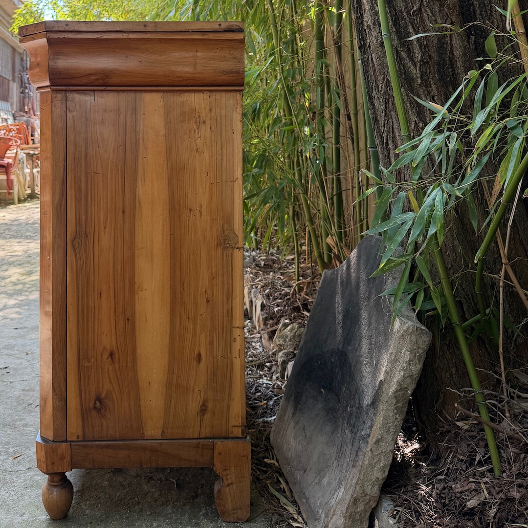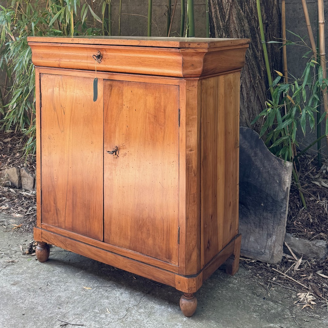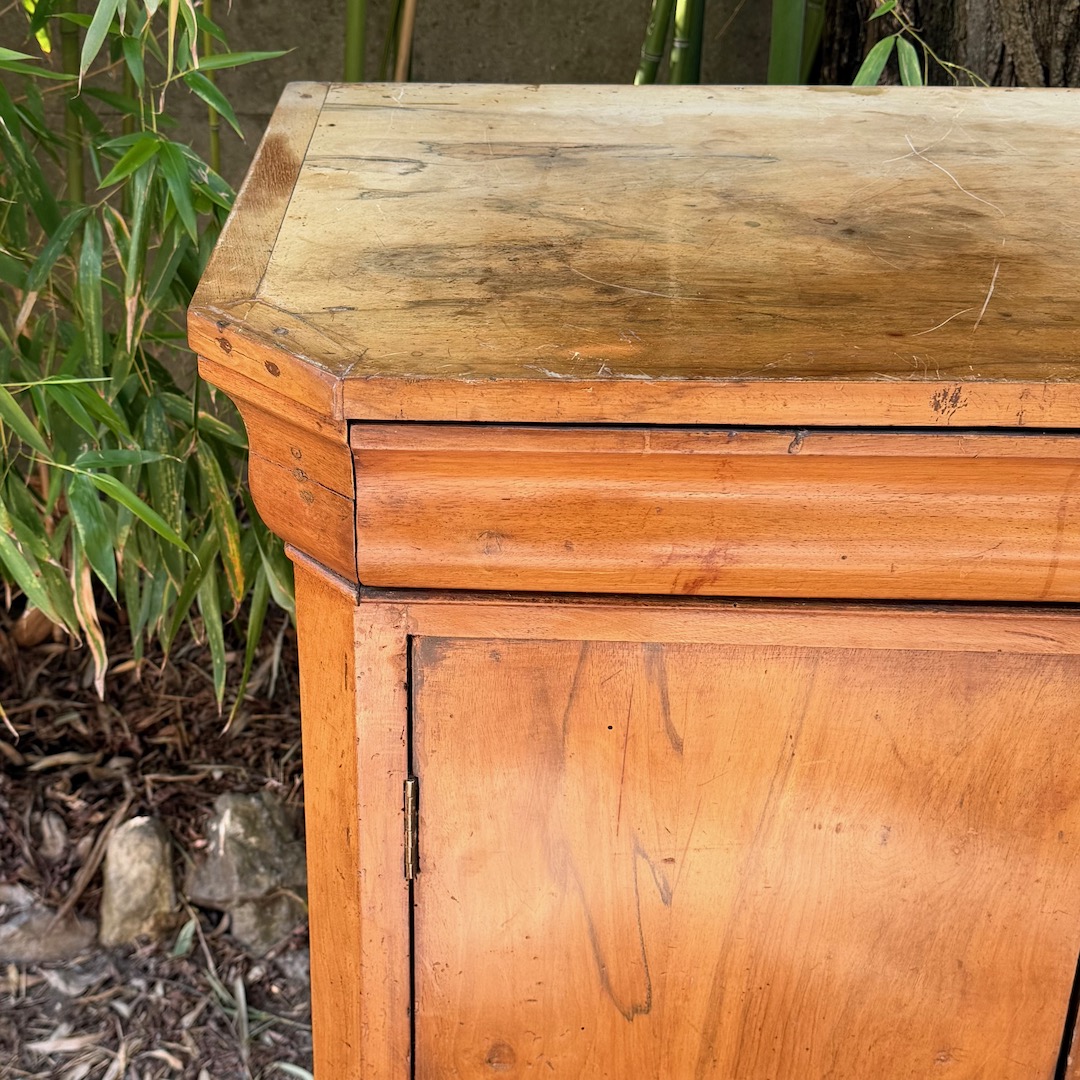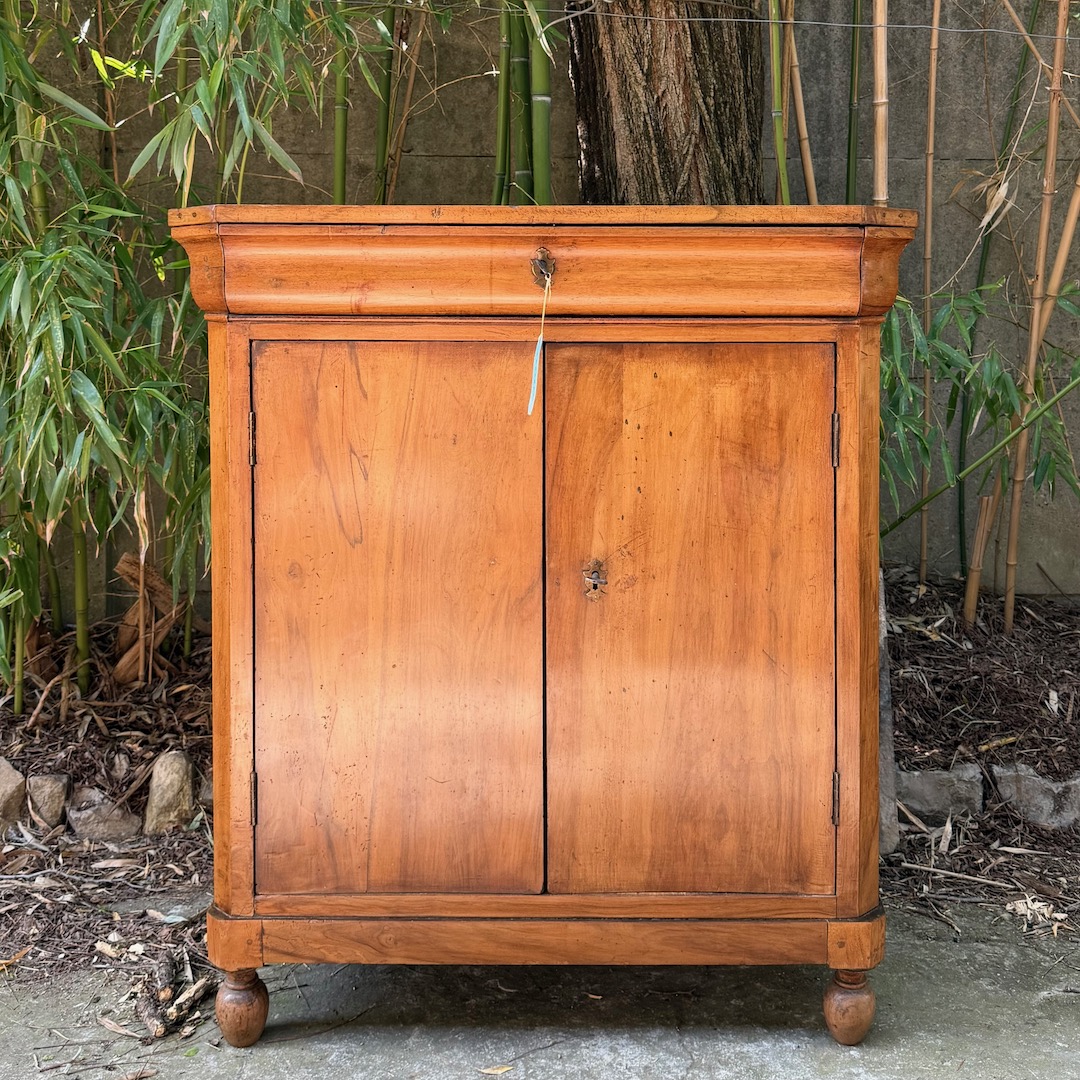 Credenza Cappuccina Carlo X in noce biondo fiammato a due sportelli ed un cassetto sulla fascia sottopiano. Piano in noce, piedi a trottola. Piemonte, inizio sec. XIX