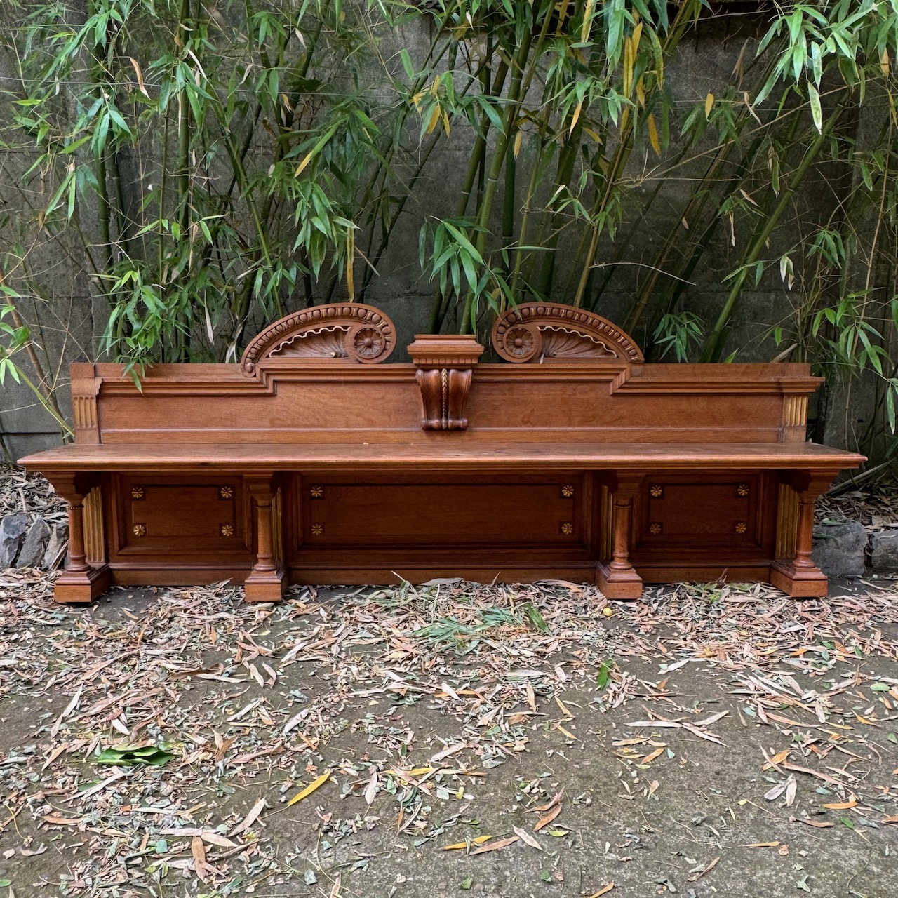 Sala da pranzo in rovere chiaro, con paraste scanalate e dorate, Toscana fine sec. XIX. Completa di credenza con alzata, a quattro cassetti e quattro sportelli, vetrina analoga, due sportelli e un cassetto basso, credenza con alzata a due cassetti e due sportelli, tavolo apribile con due prolunghe e otto sedie rivestite in pelle