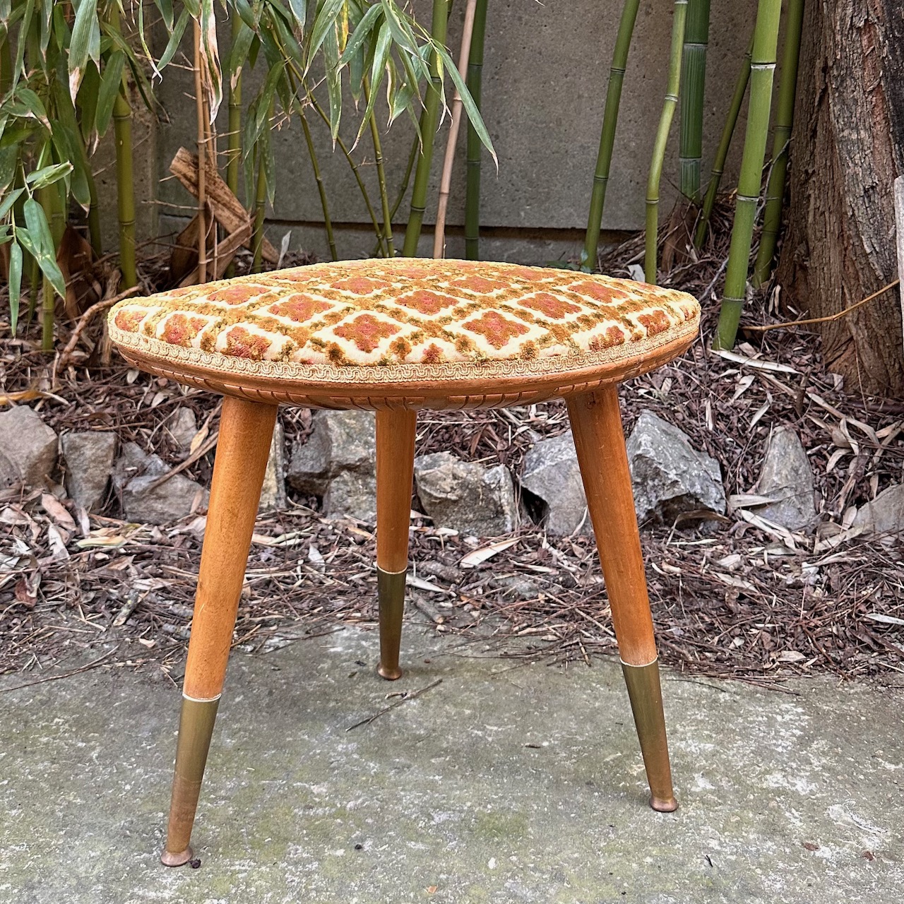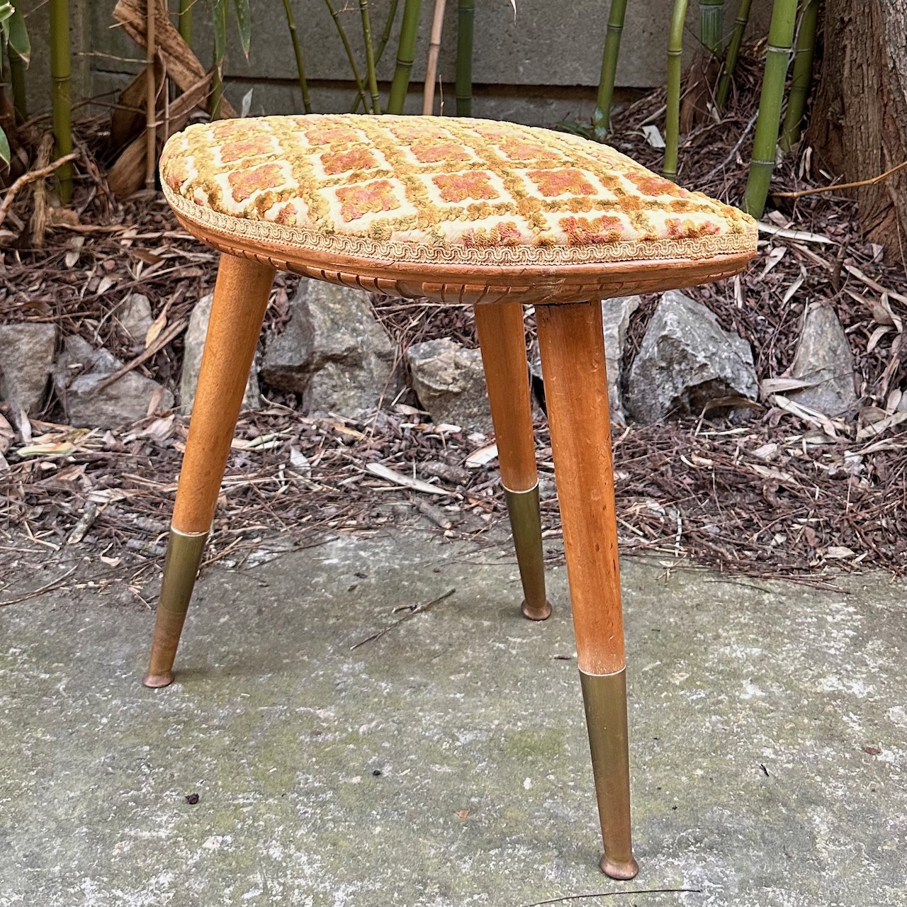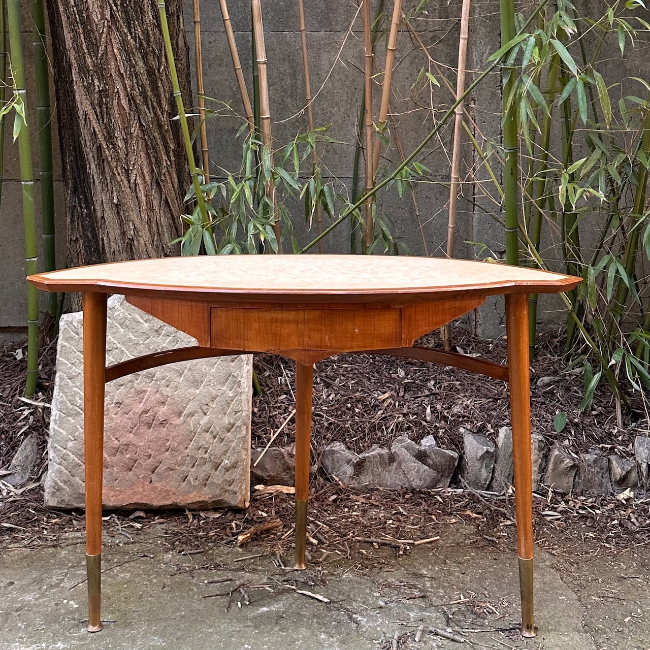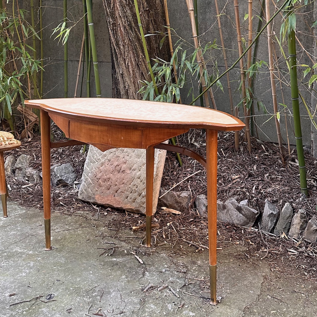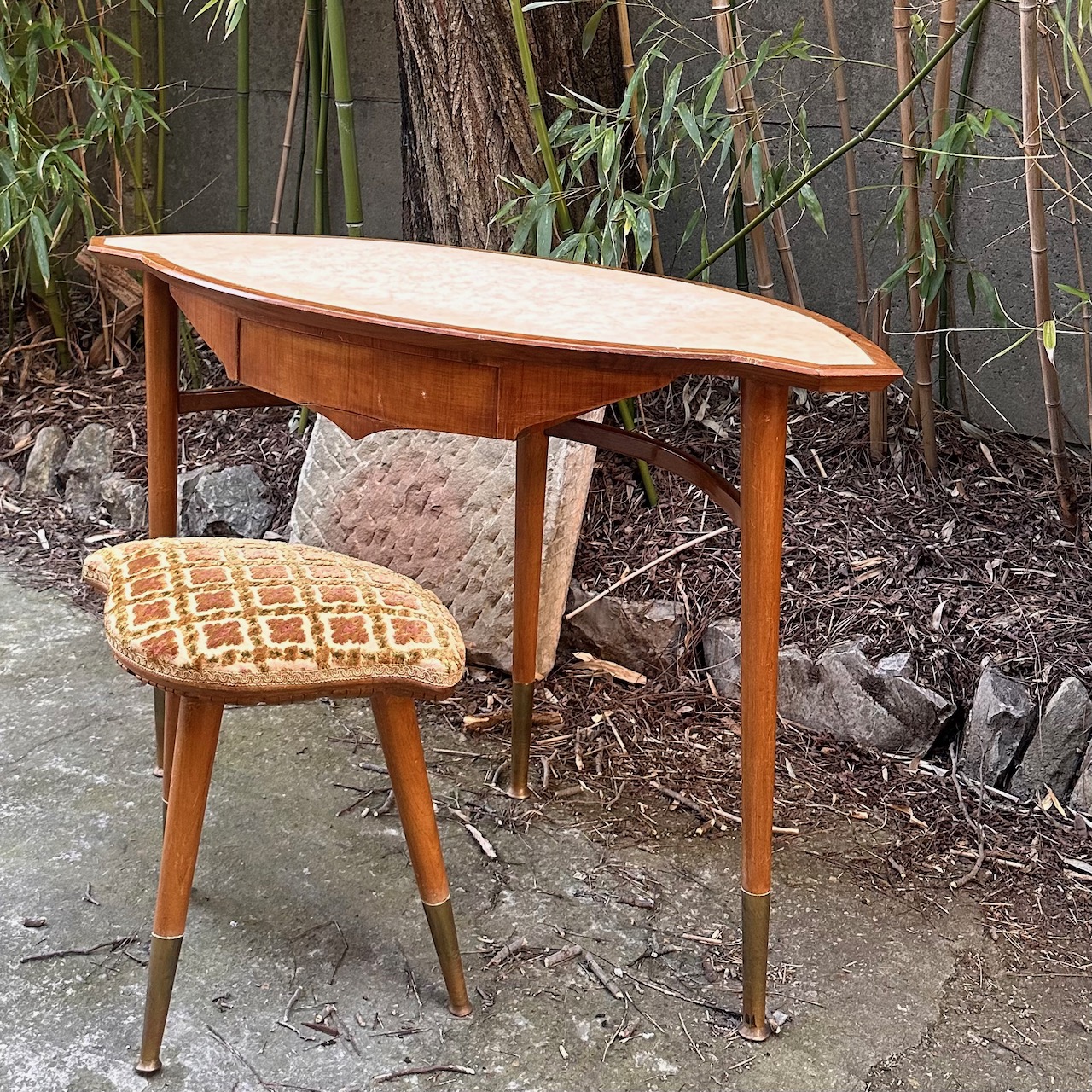 Toilette a fagiolo in satinwood, piano sagomato in laminato avorio, cassetto nella fascia, gambe a spillo con estremità in ottone, e sgabello con seduta imbottita rivestita in tela broccato. Italia 1950 ca