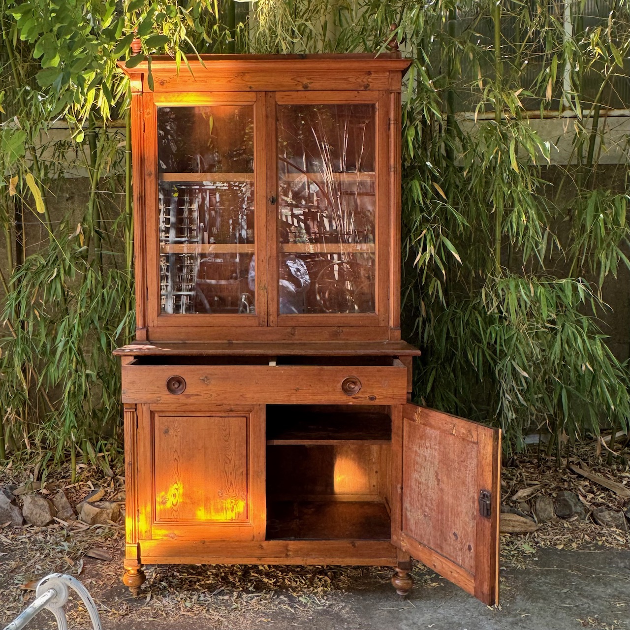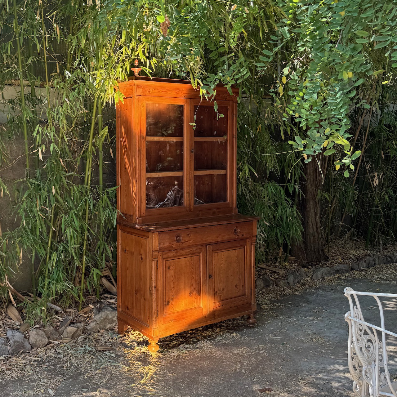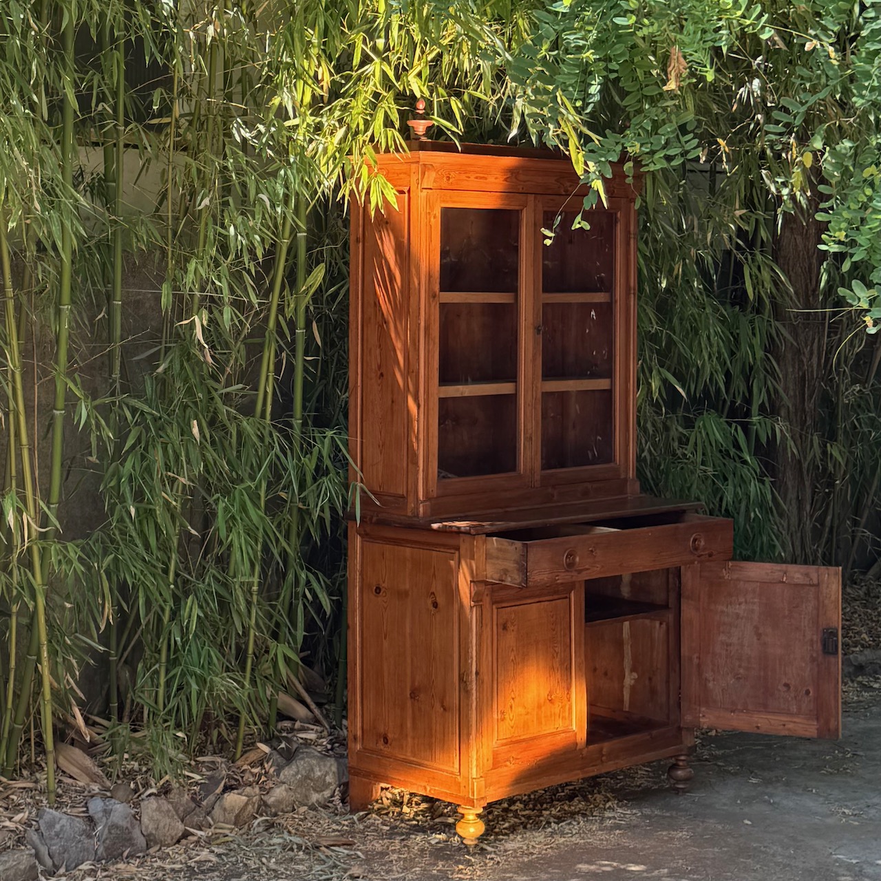 Credenza vetrina in legno di larice, doppio corpo, parte inferiore a due sportelli ed un cassetto, parte superiore a due sportelli a vetri. Toscana, metà XIX sec.