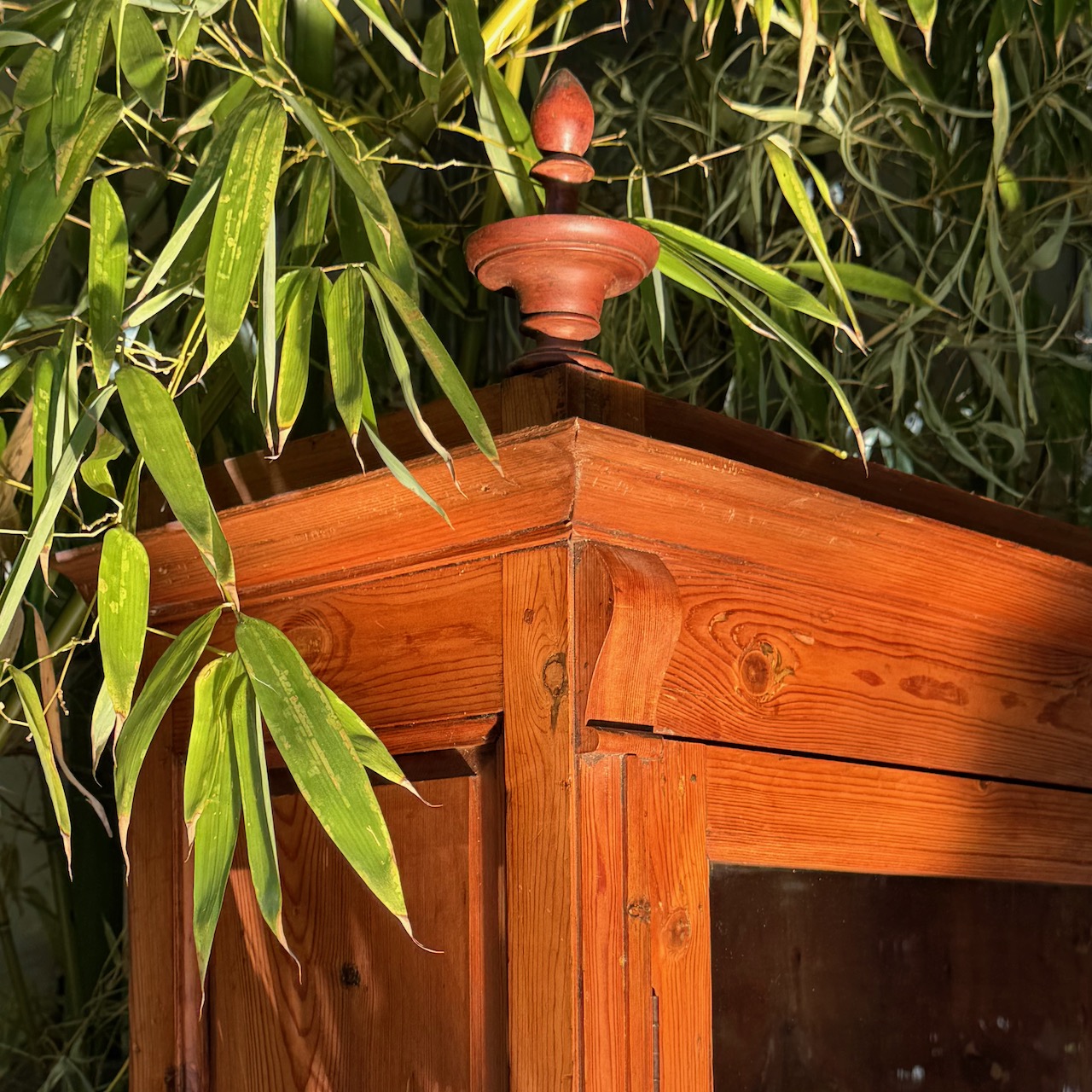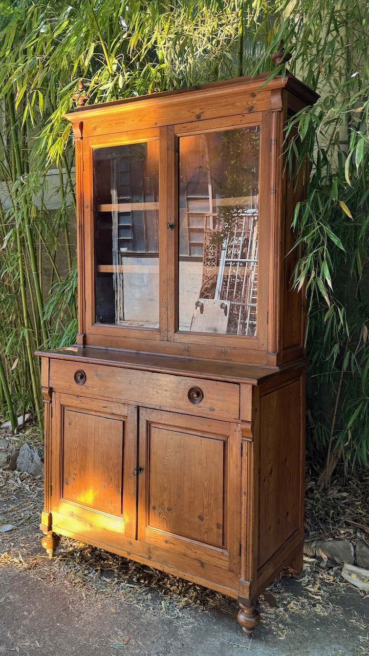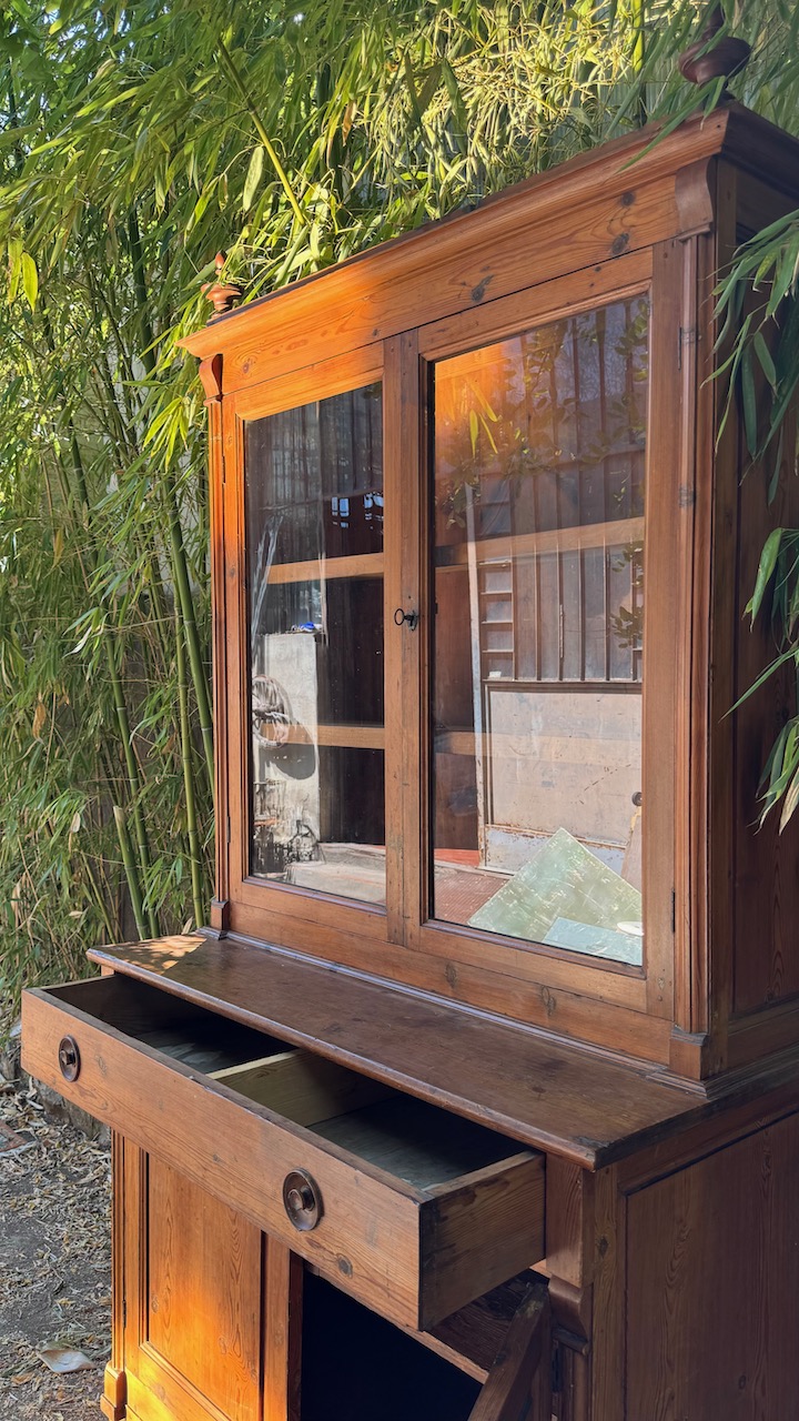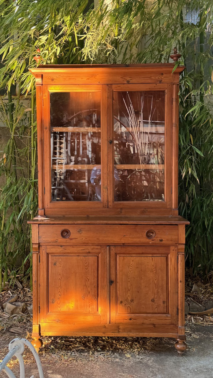 Credenza vetrina in legno di larice, doppio corpo, parte inferiore a due sportelli ed un cassetto, parte superiore a due sportelli a vetri. Toscana, metà XIX sec.