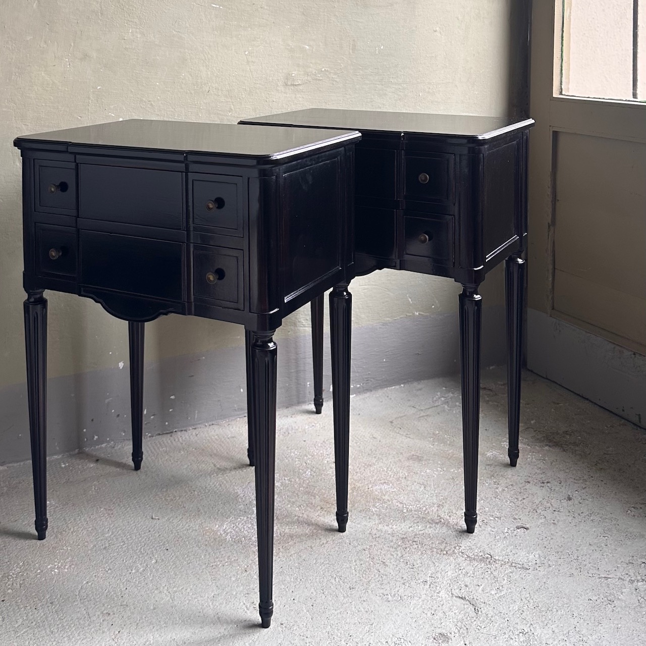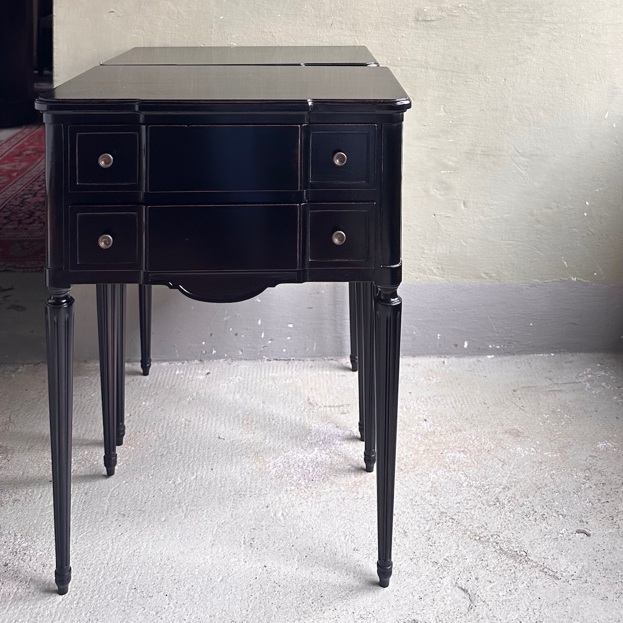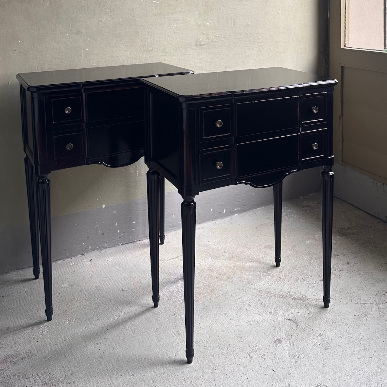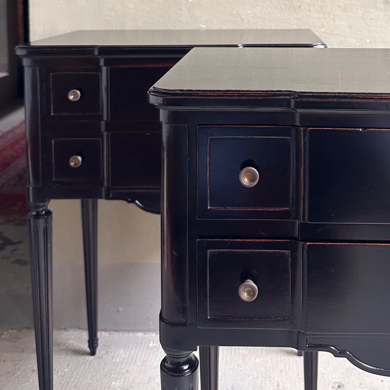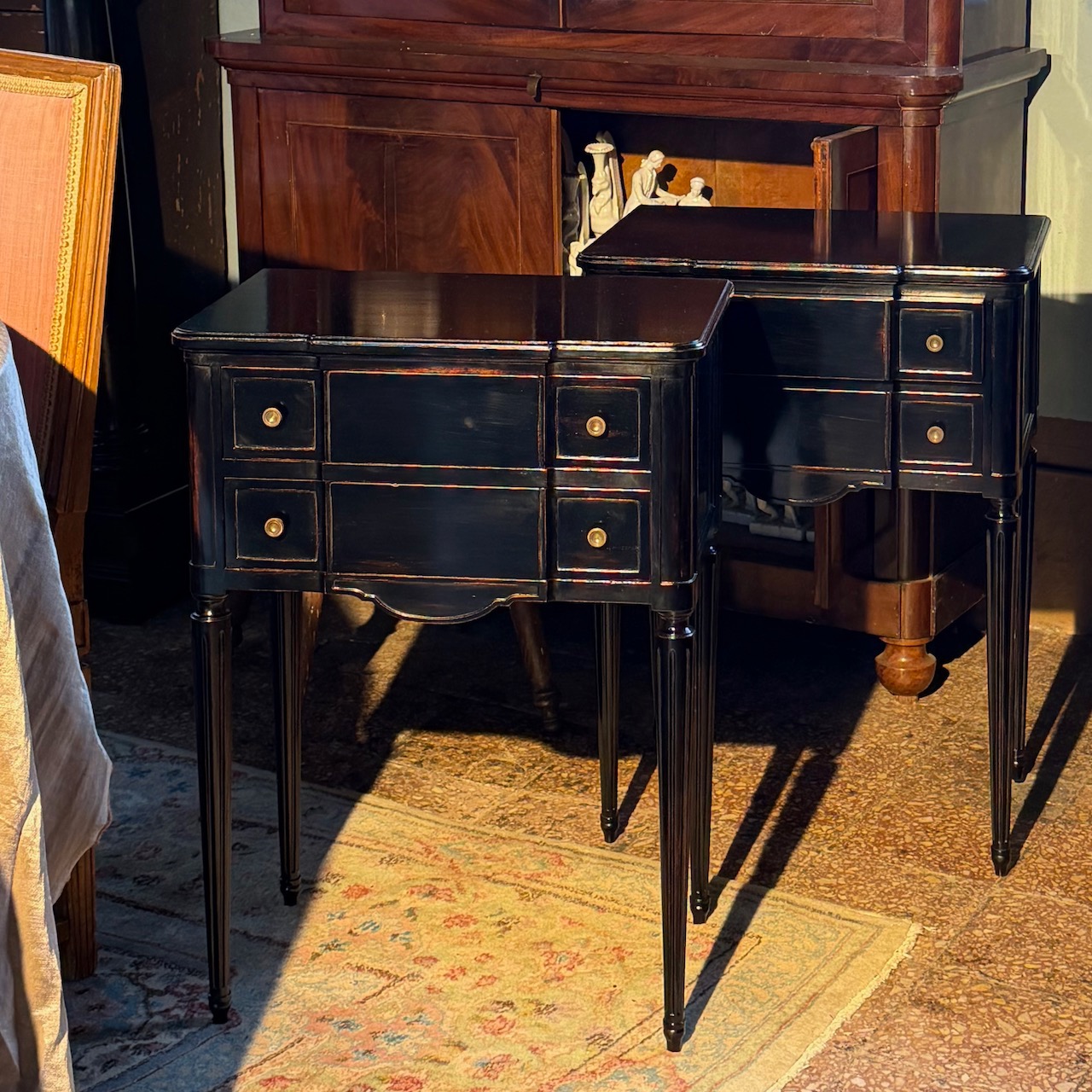 Coppia di comodini cassettiere in legno di mogano. Svizzera, inizi sec. XX