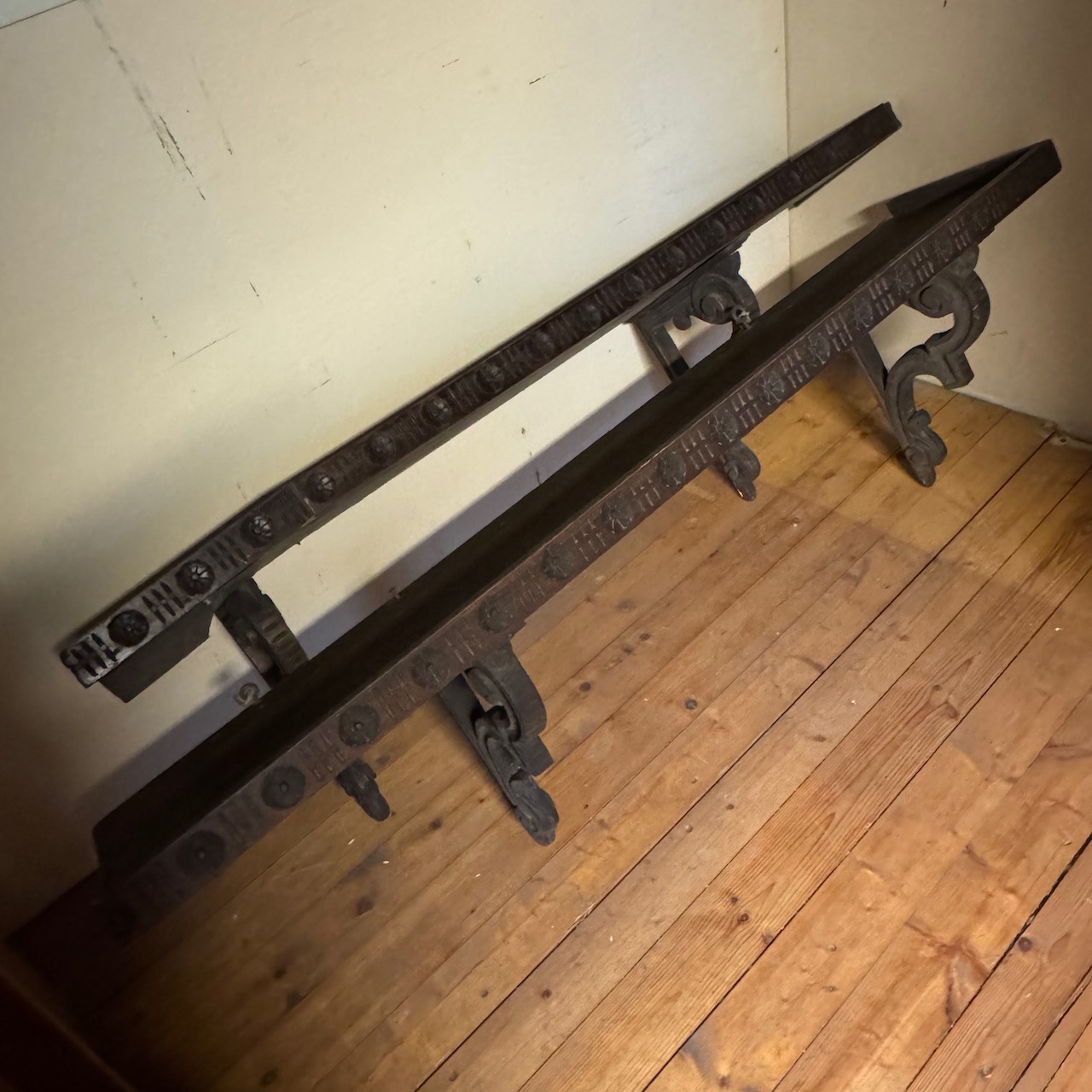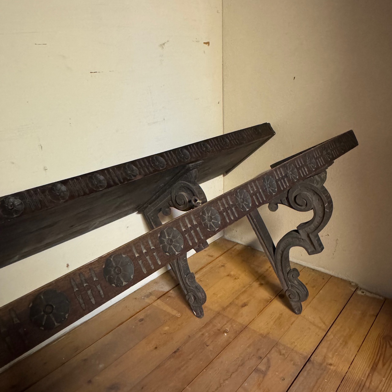 Coppia di Mensole in legno a patina bruna intagliato e sagomato. Italia, sec. XIX