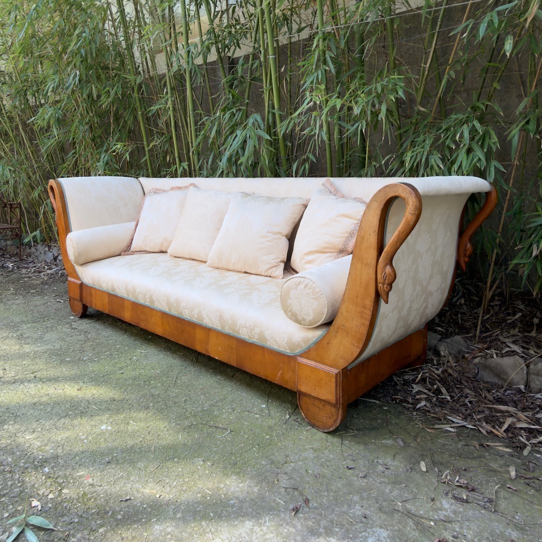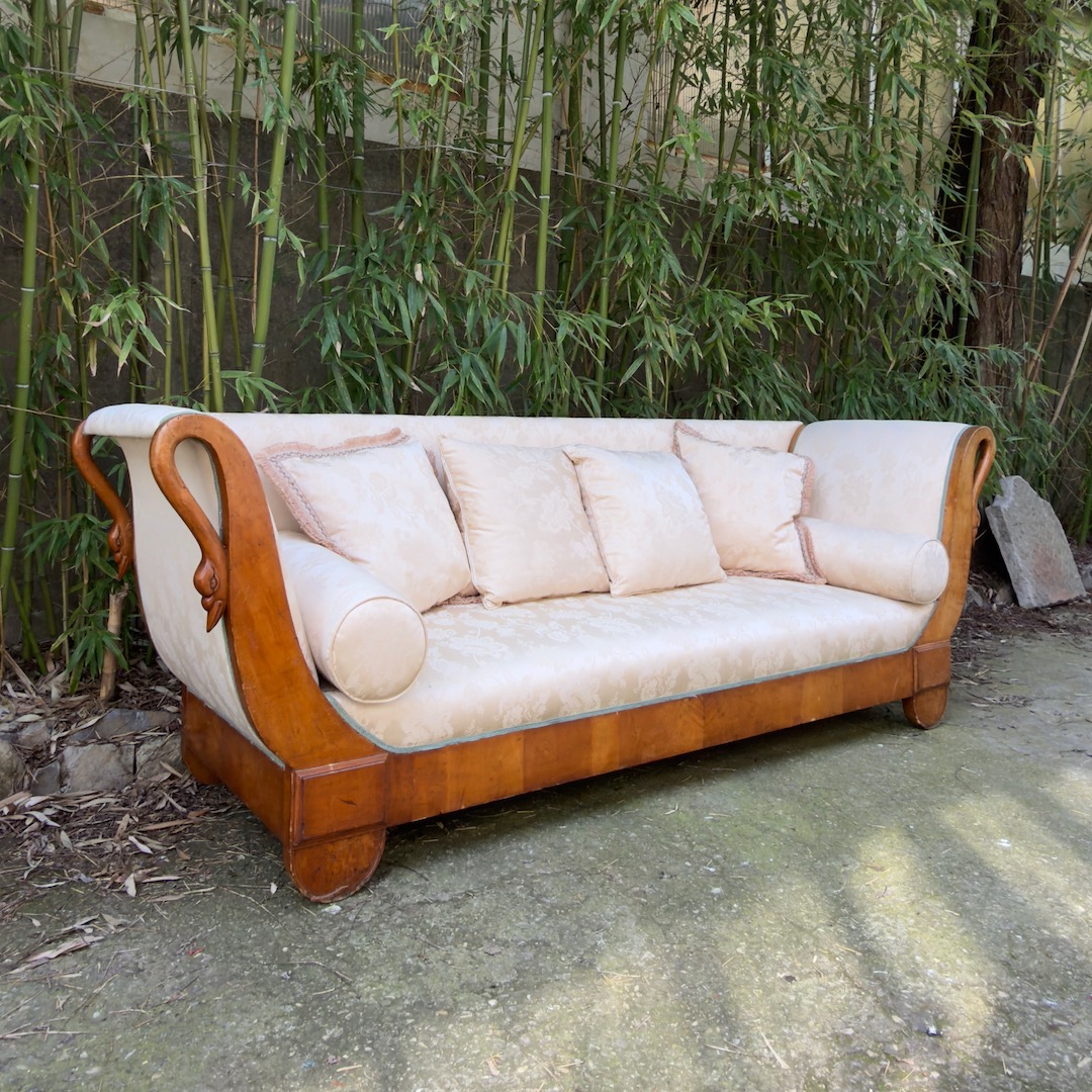 Divano letto a barca Impero nude look in ciliegio e piuma di ciliegio, braccioli a voluta scolpiti a collo di cigno. Italia, inizio sec. XIX