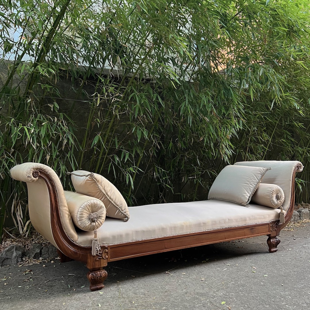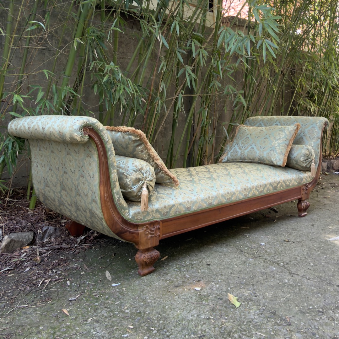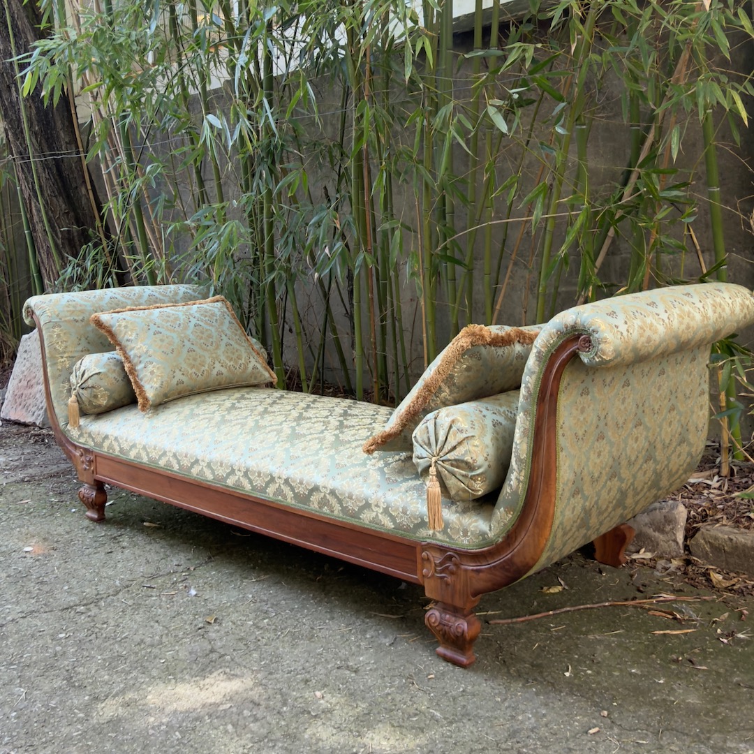 Grande Divano Dormeuse Neoclassico lit de jour in noce, da centro stanza, braccioli a ventaglio, piedi a vaso, imbottito e rivestito in damasco di seta verde giada con quattro cuscini en suite. Italia, inizio sec. XX