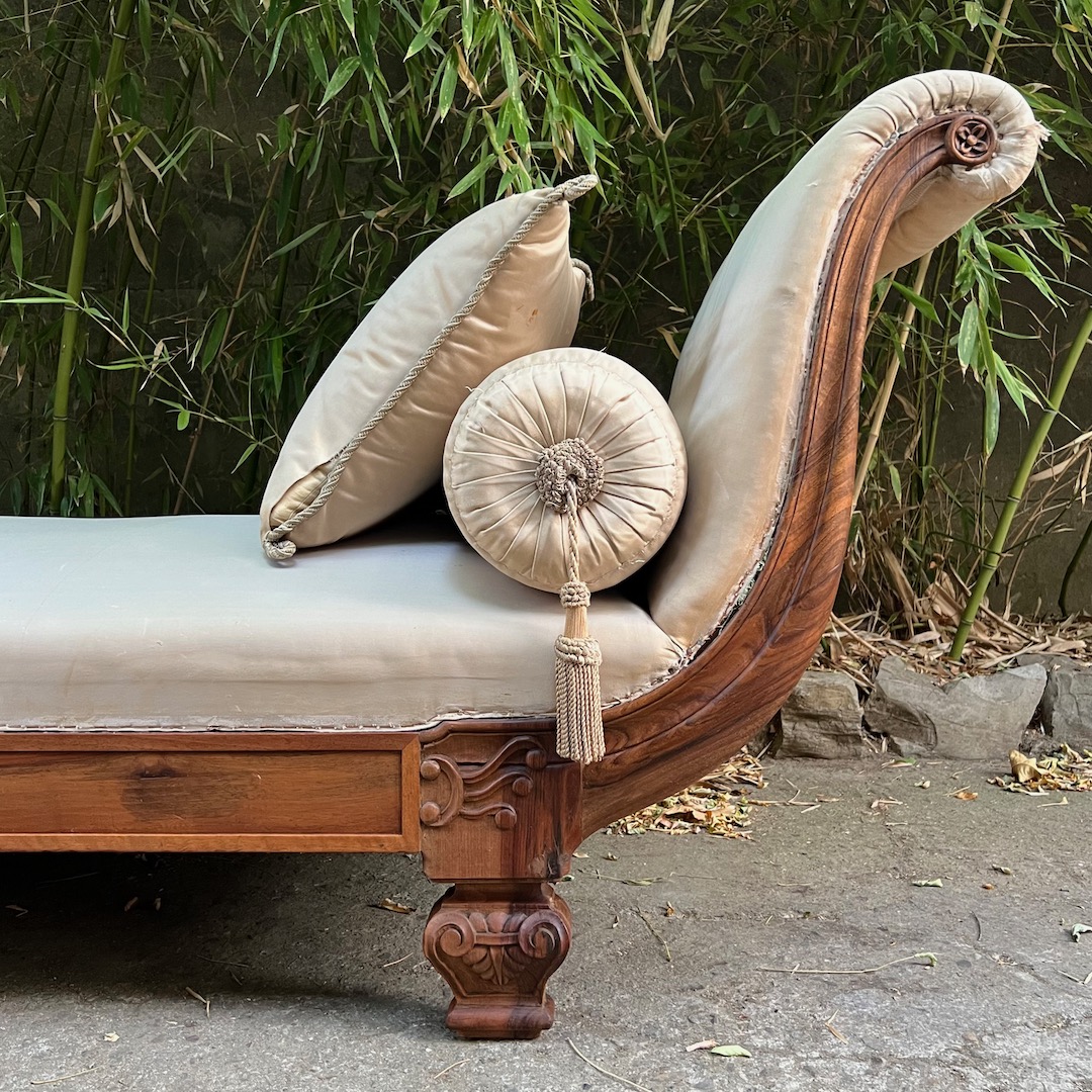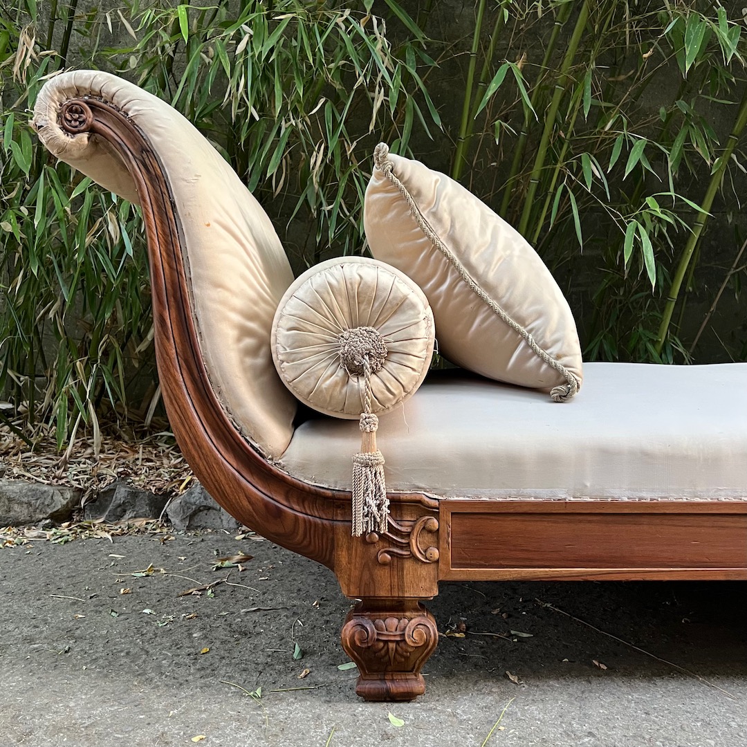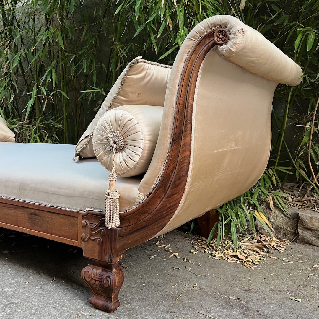 Grande Divano Dormeuse Neoclassico lit de jour in noce, da centro stanza, braccioli a ventaglio, piedi a vaso, imbottito e rivestito in damasco di seta verde giada con quattro cuscini en suite. Italia, inizio sec. XX