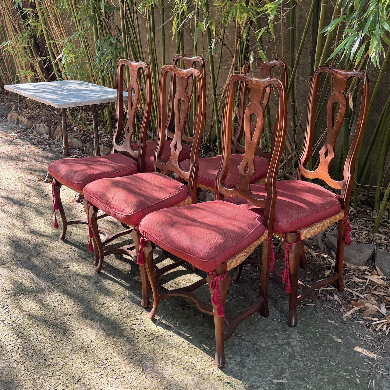 Sei sedie Queen Anne in noce, seduta impagliata, cuscino in lino lampone con nappe. Italia, sec. XX