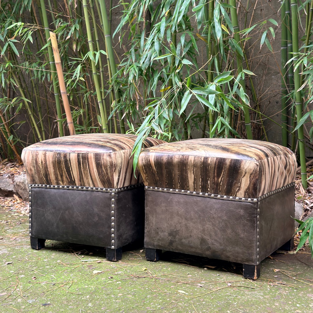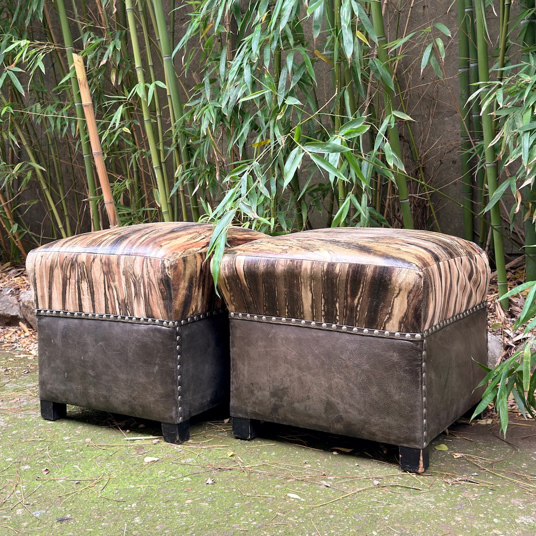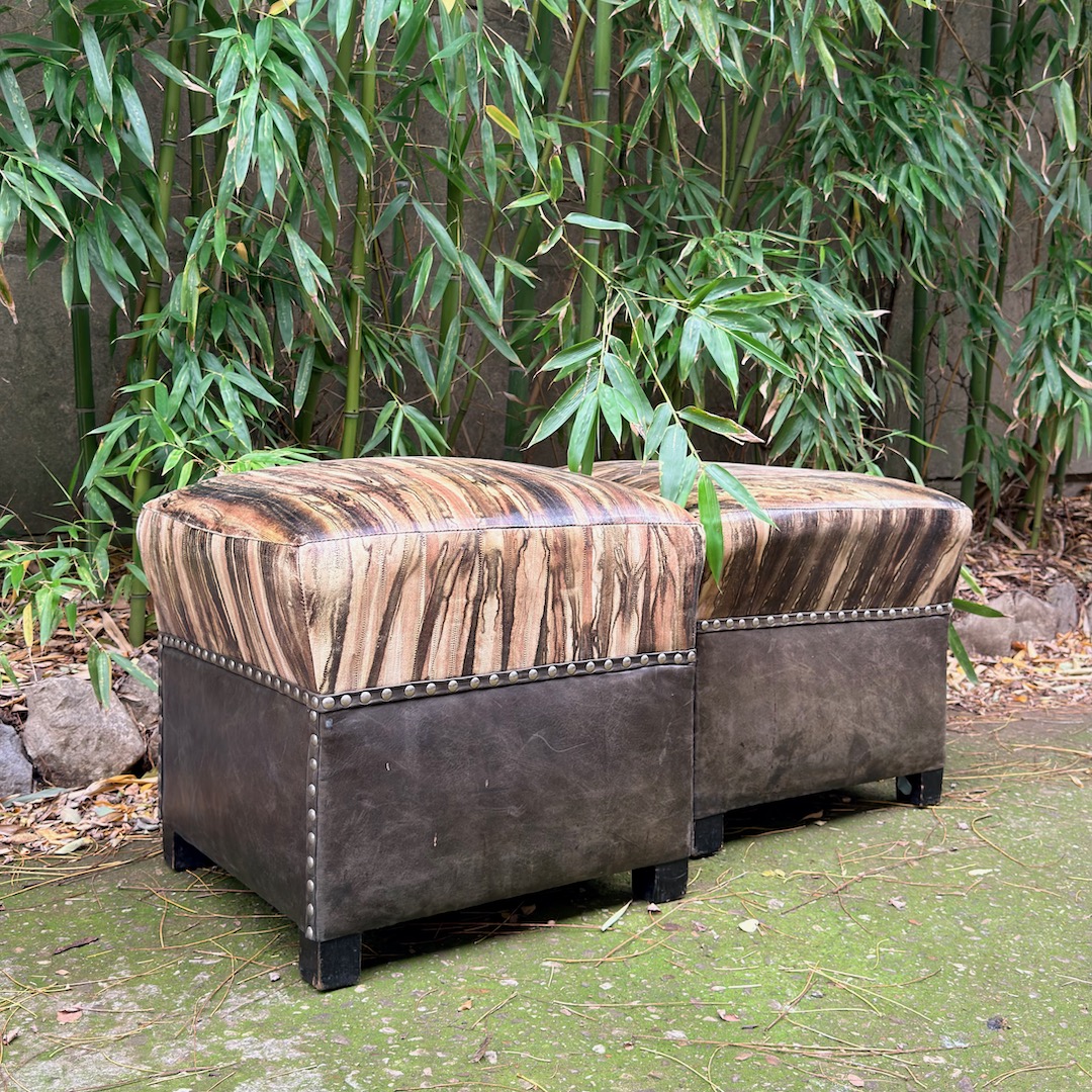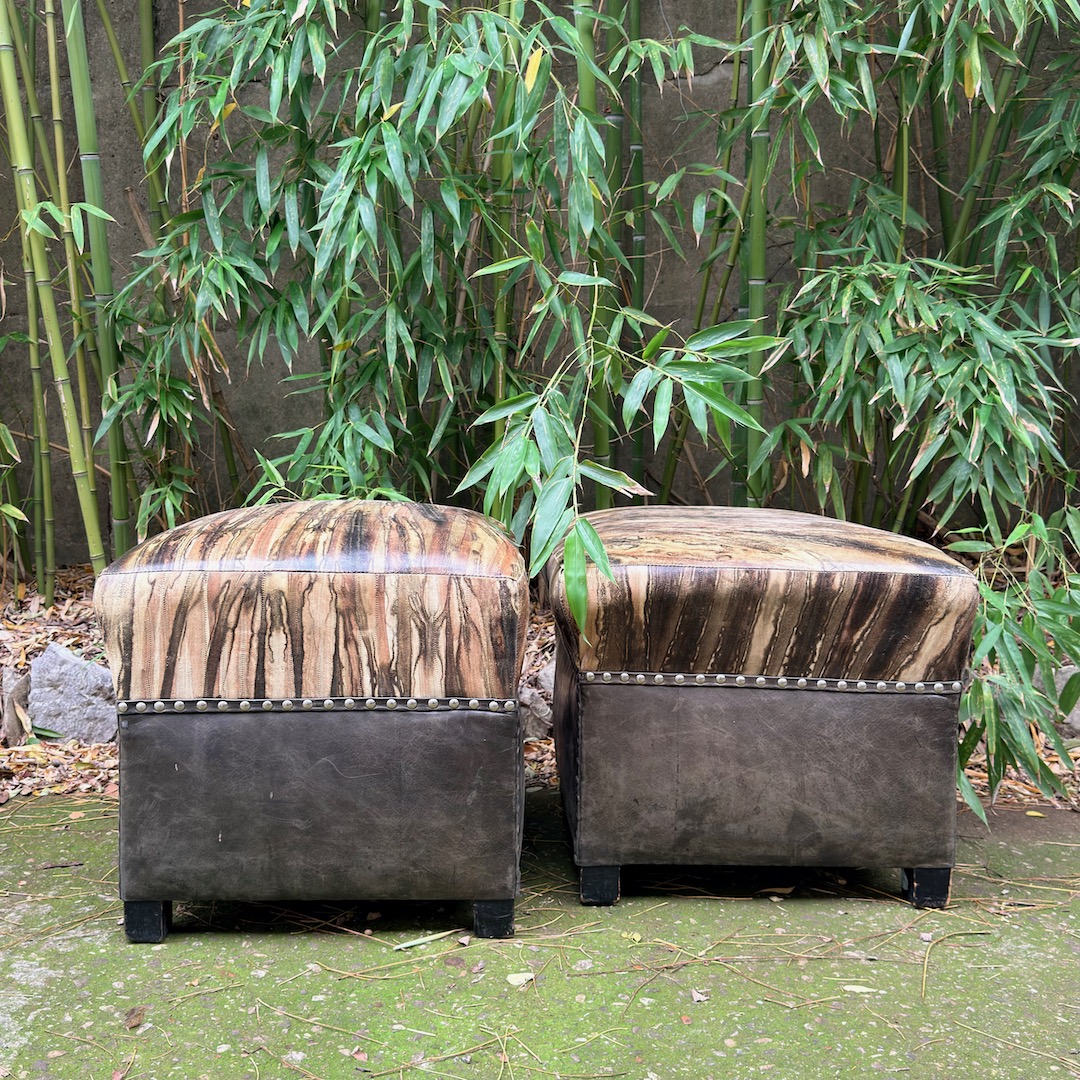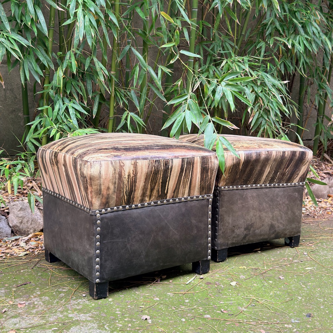 Coppia di pouf decò in pelle, rivestiti in agnello stampa lucertola con colorazione tye-dye e base in nappa plongée nera. Toscana, 1930 circa