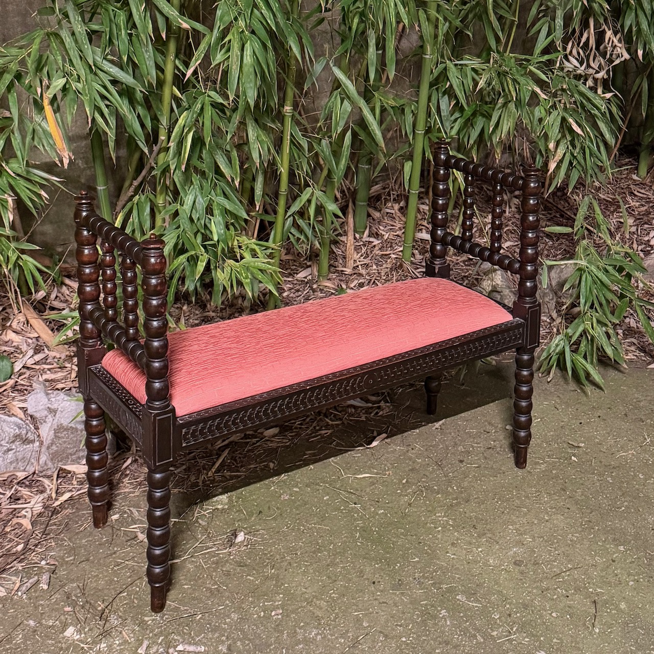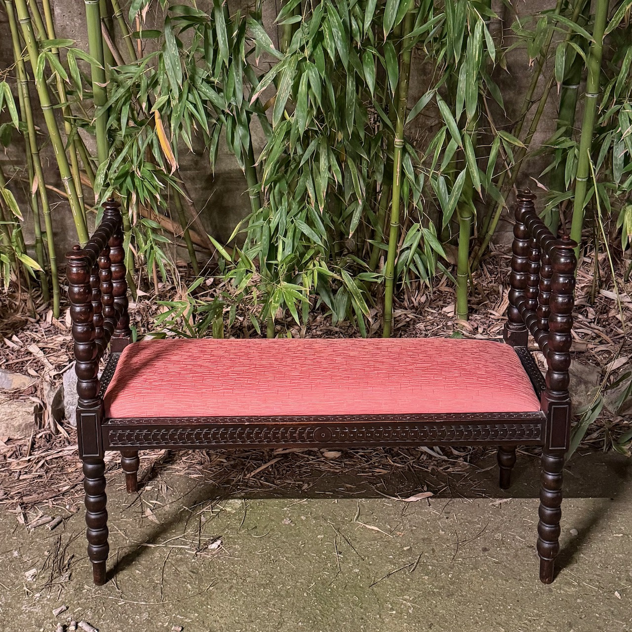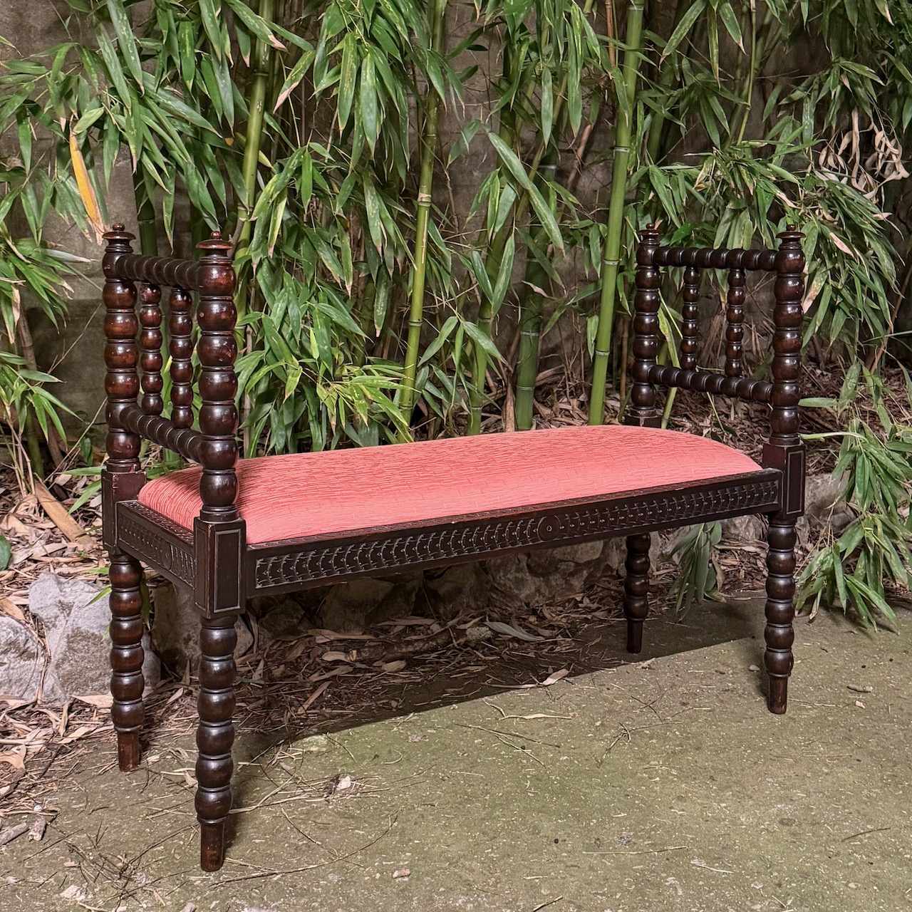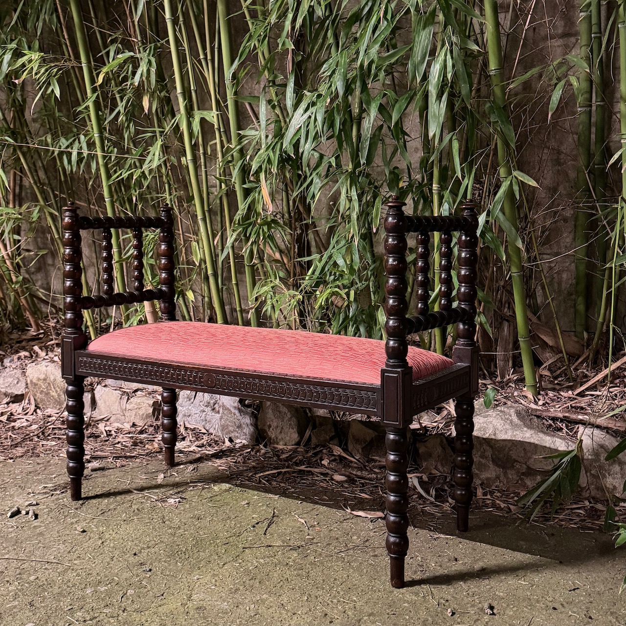 Panca in legno ebanizzato, sostegni torniti, seduta imbottita e rivestita in tela rosa salmone, pendaglio intagliata. Italia, sec. XX