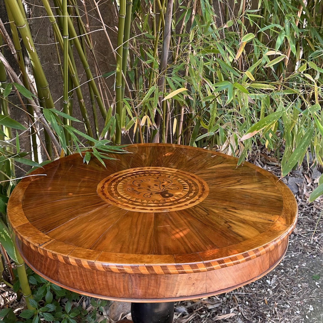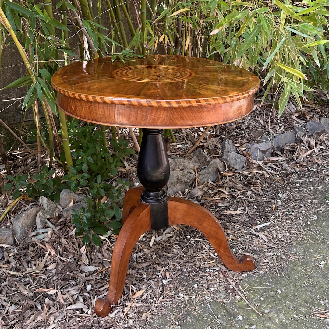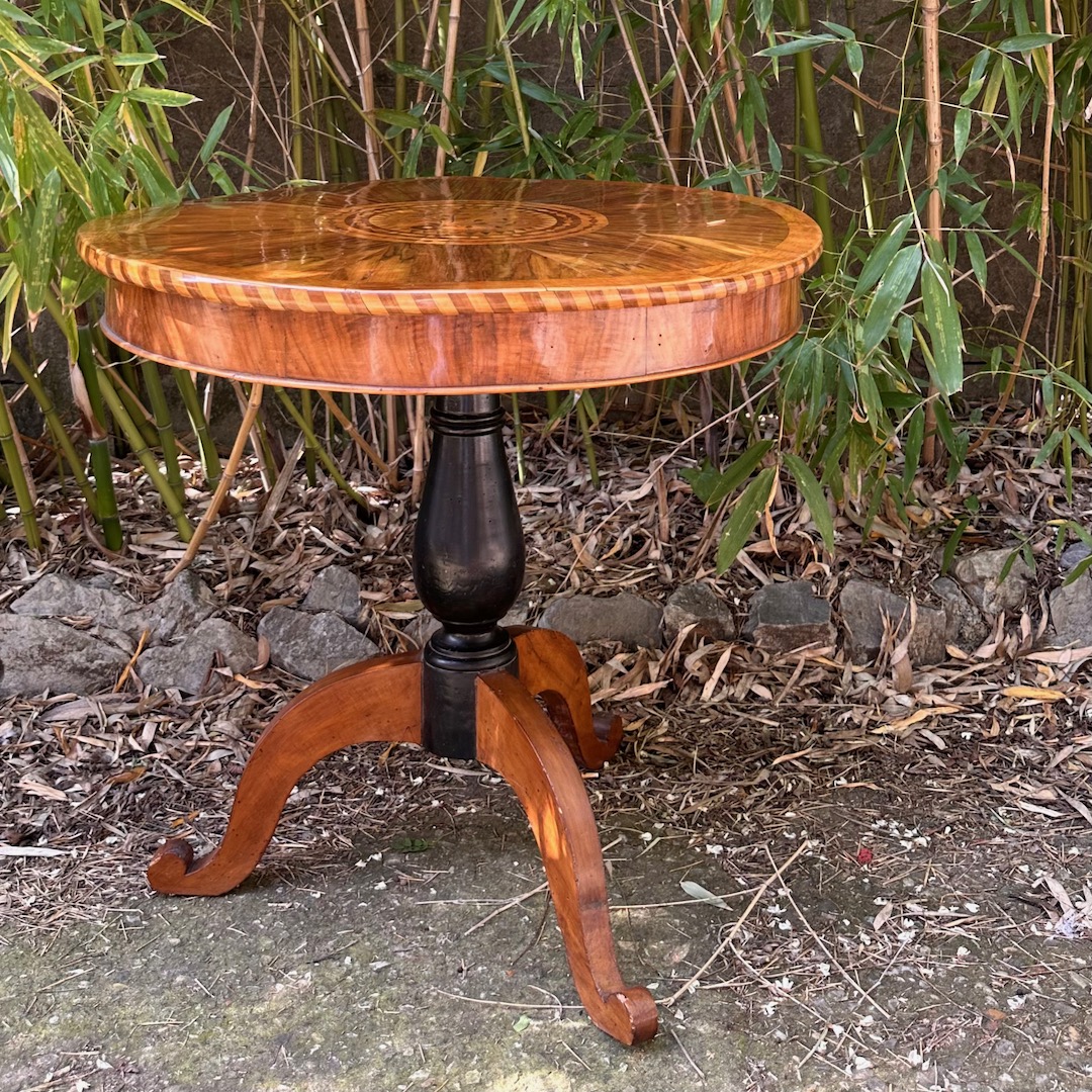 Tavolo da caffè a intarsio in piuma di ciliegio, fusto parzialmente ebanizato, piedi a tripode . Sorrento, Italia, 1950 circa