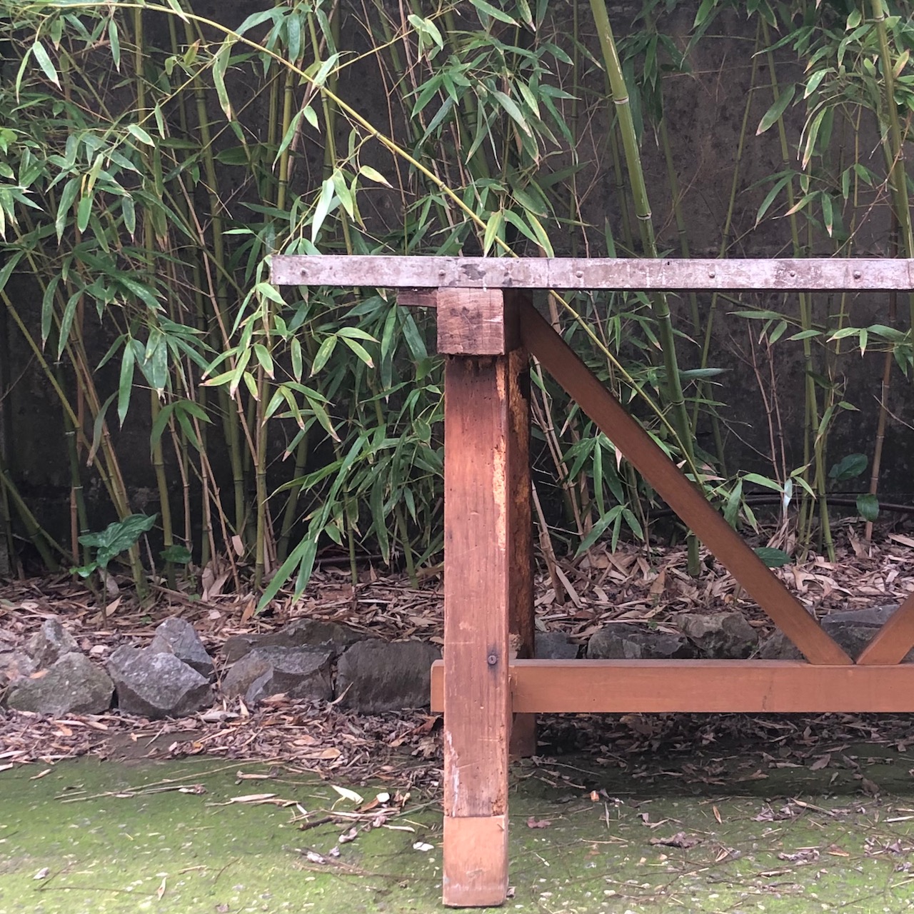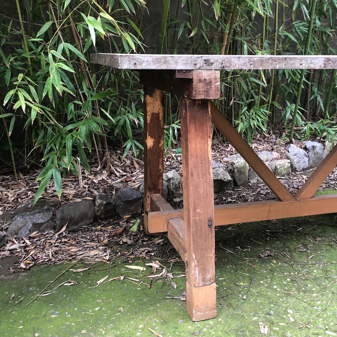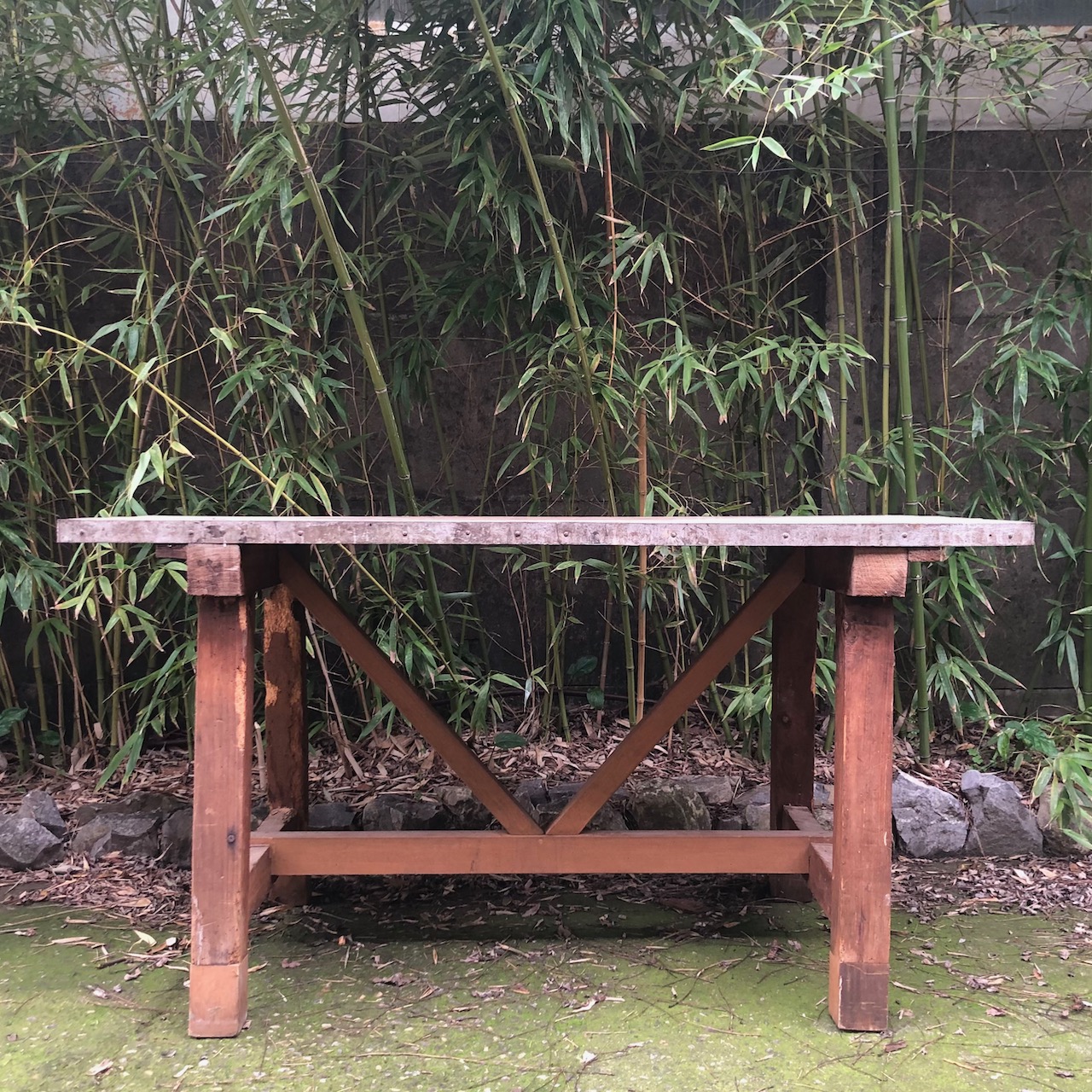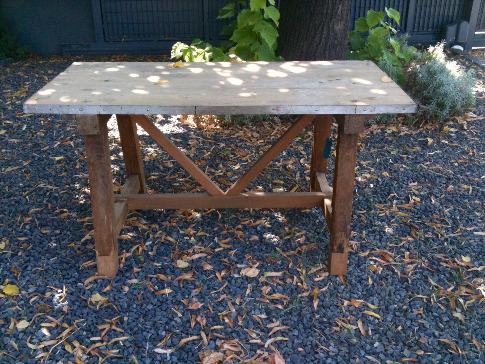Tavolo rettangolare da fonderia in legno naturale con gambe a capra. Toscana inizio sec. XX