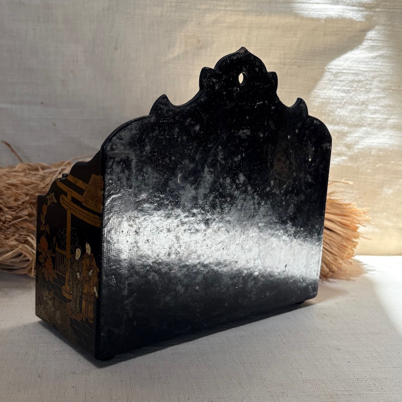 Portadocumenti in papier machè laccata ebano, tre scomparti, dipinto con scene di vita quotidiana. Cina, sec. XIX