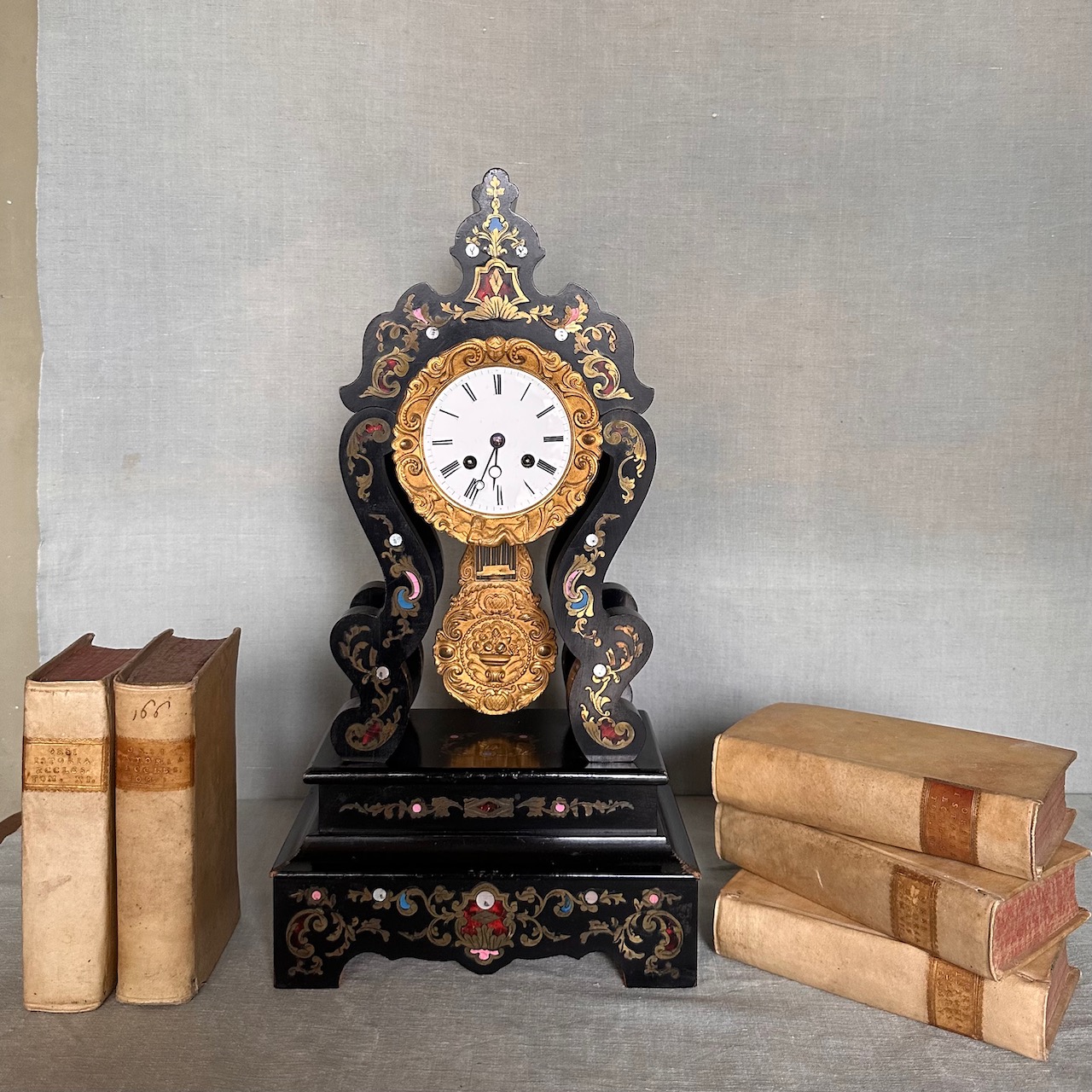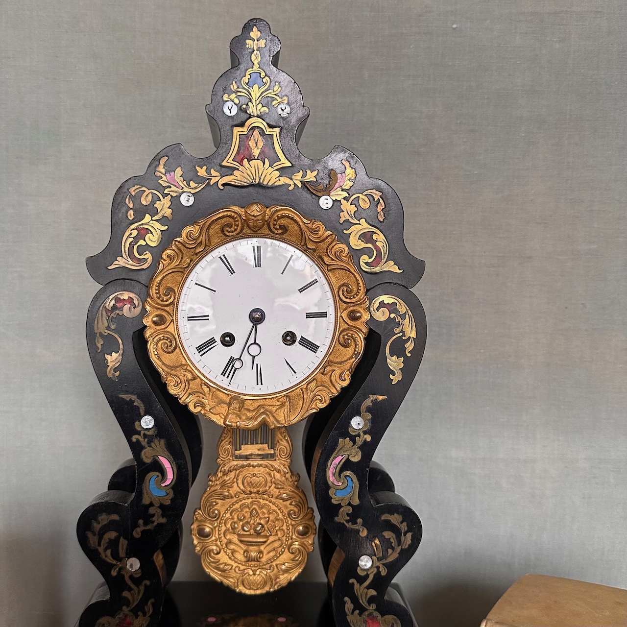 Orologio a pendolo in legno ebanizato, decorato con intarsio boulle in bronzo e madreperla, quadrante in smalto bianco e cornice in bronzo dorato. Francia, sec. XIX