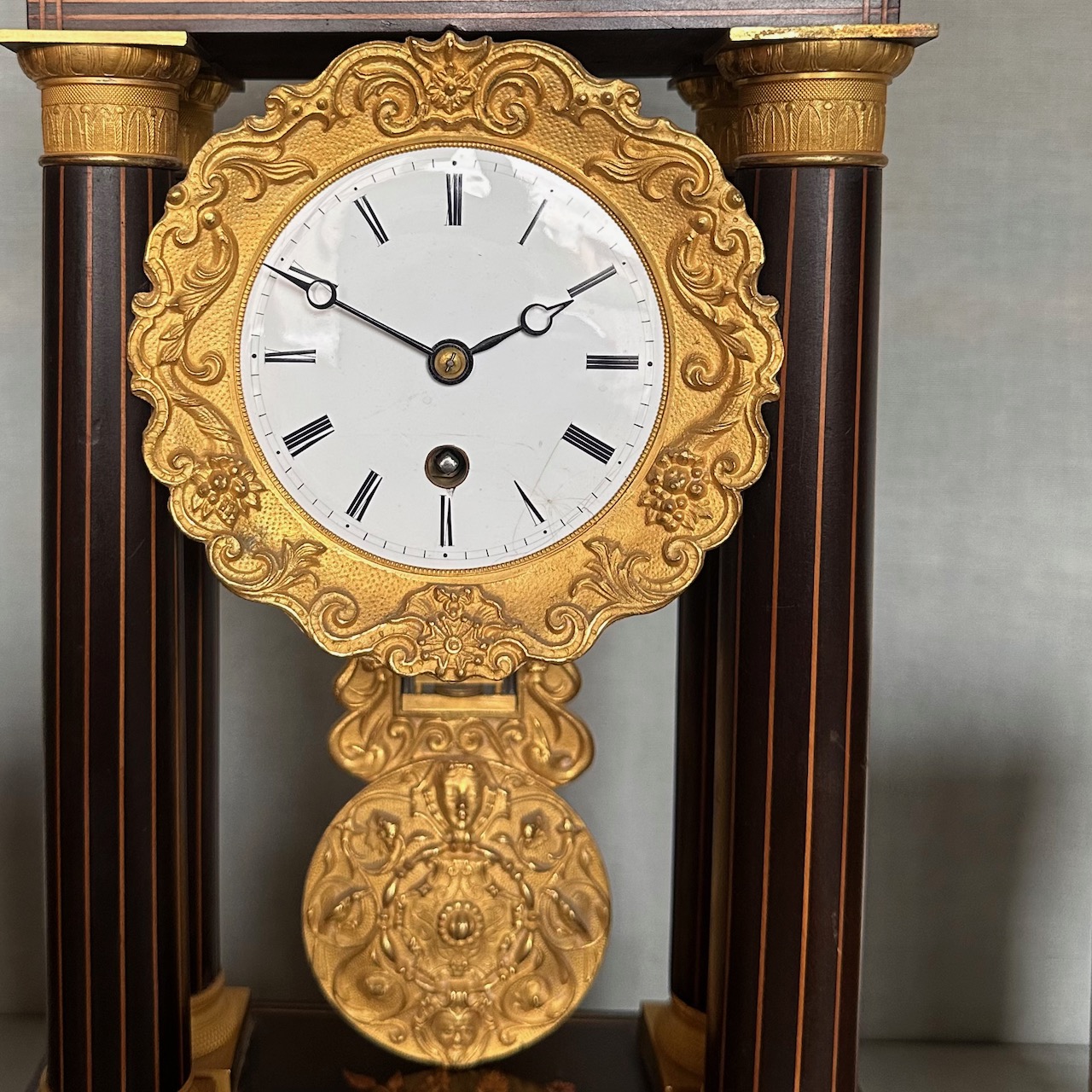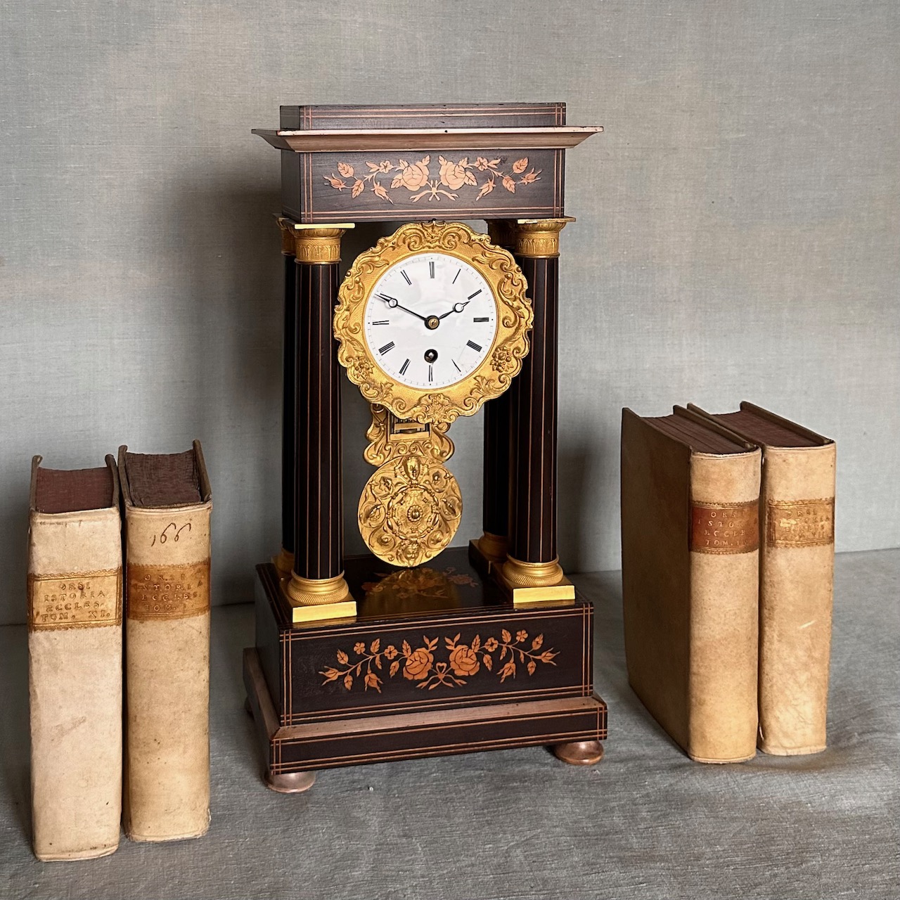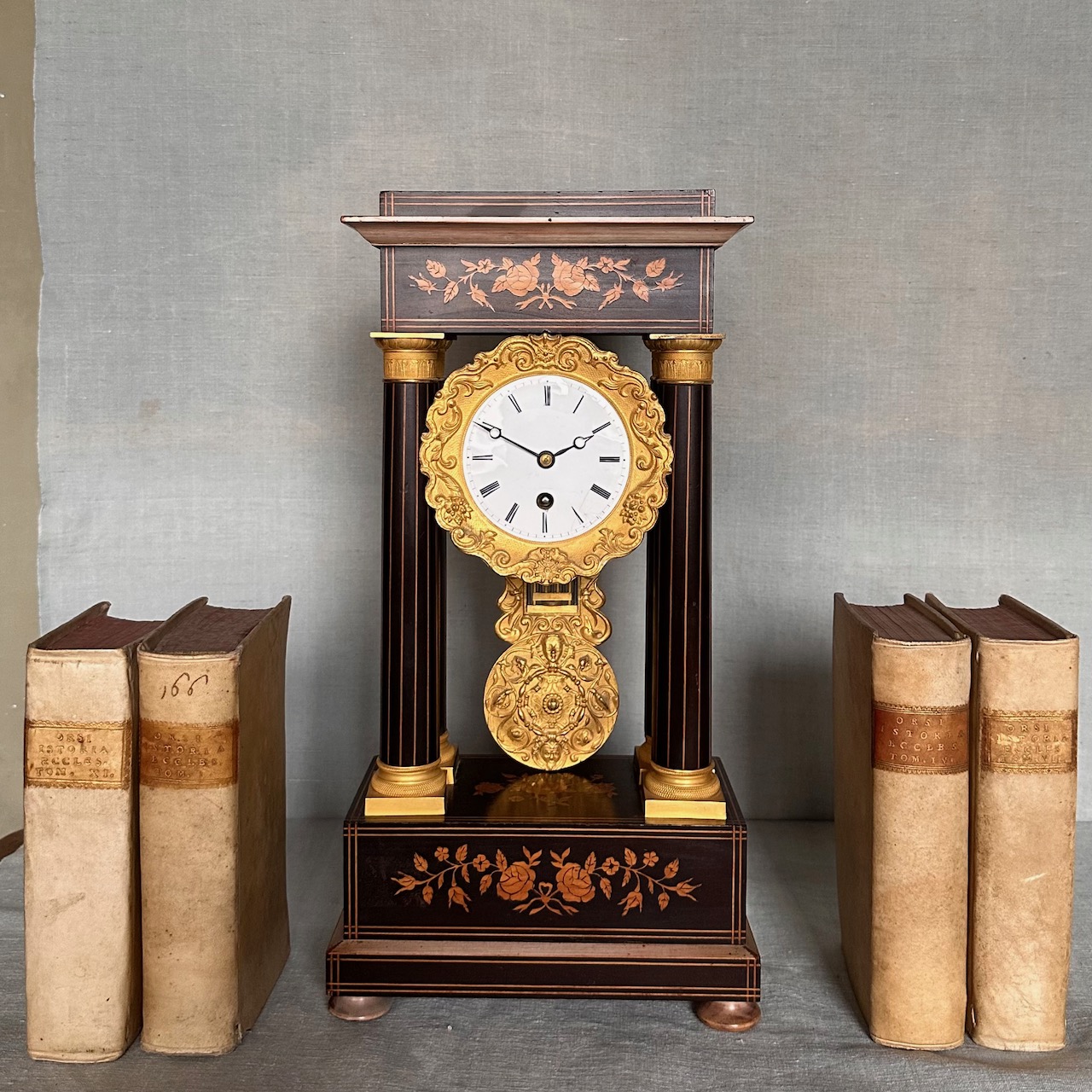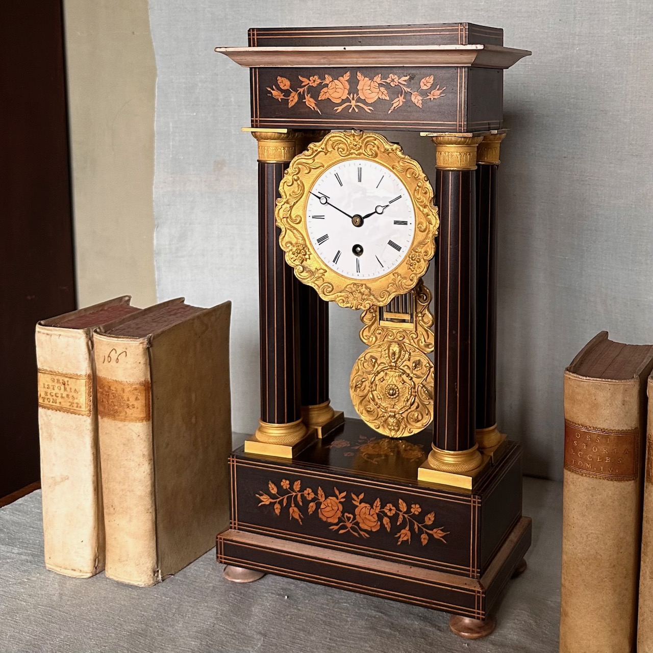 Orologio da mensola a baldacchino, parigina Carlo X in palissandro a intarsio di bosso, con guarnizioni in bronzo. Francia metà sec. XIX