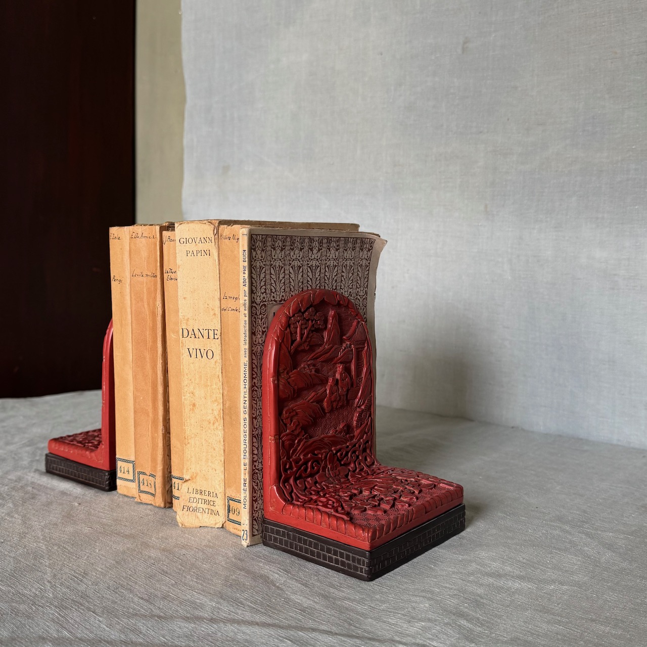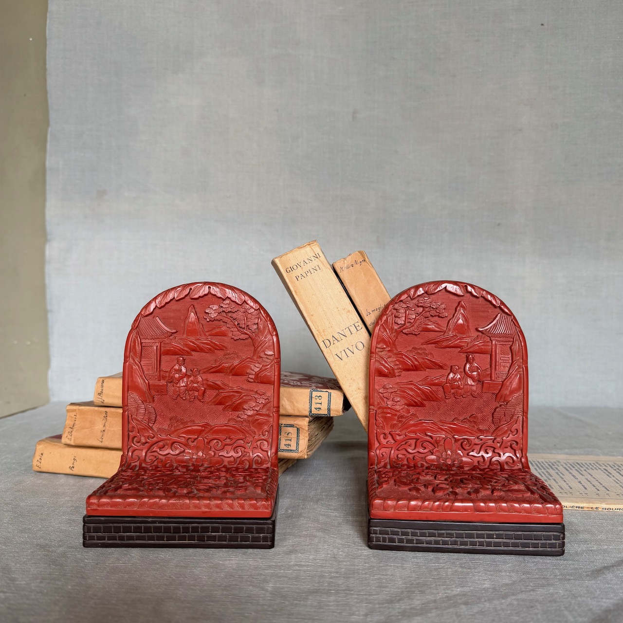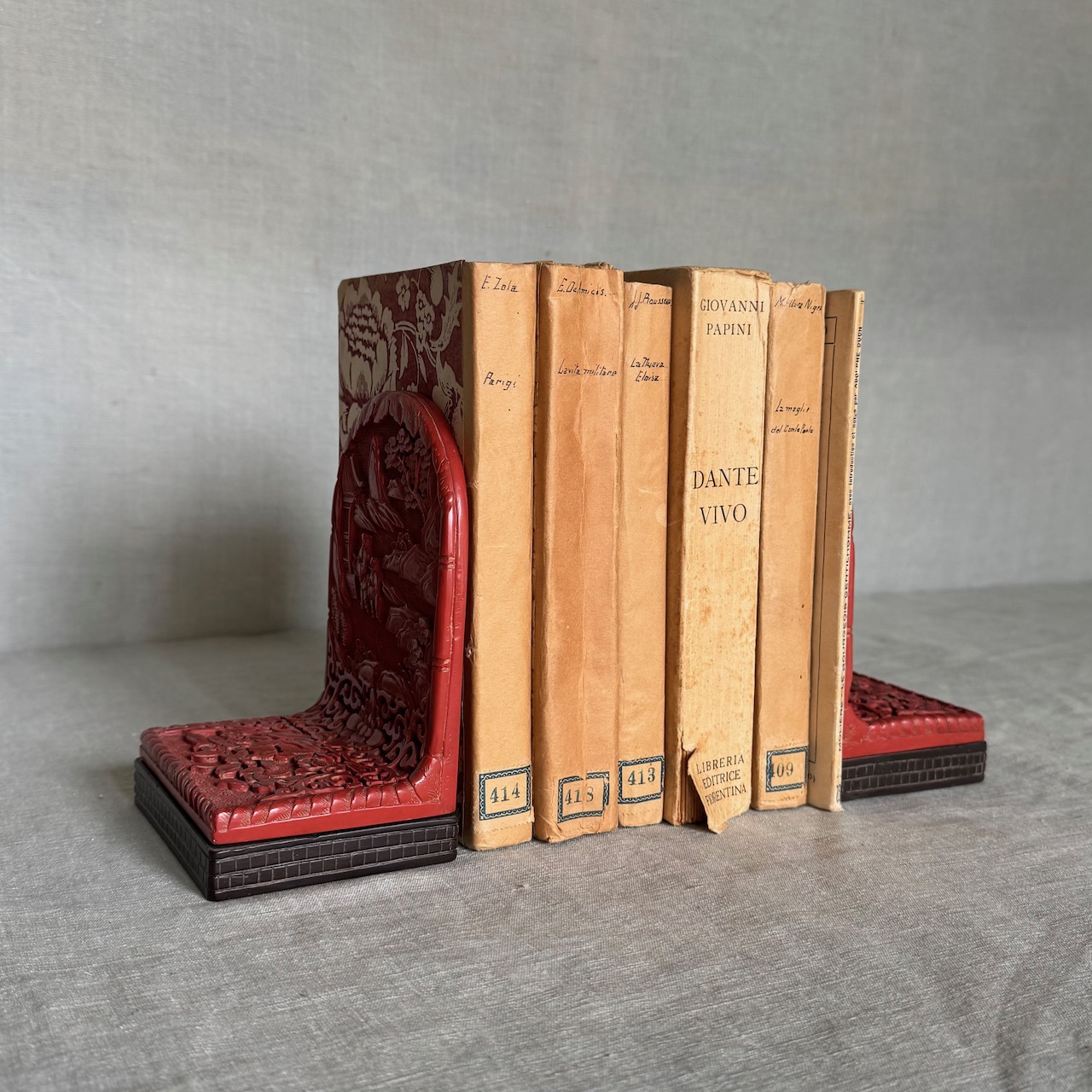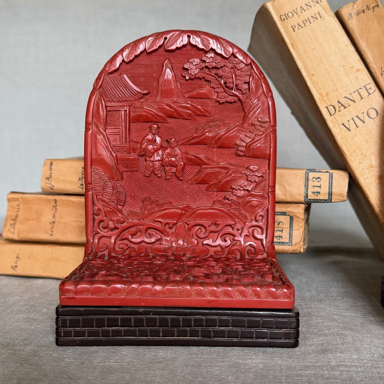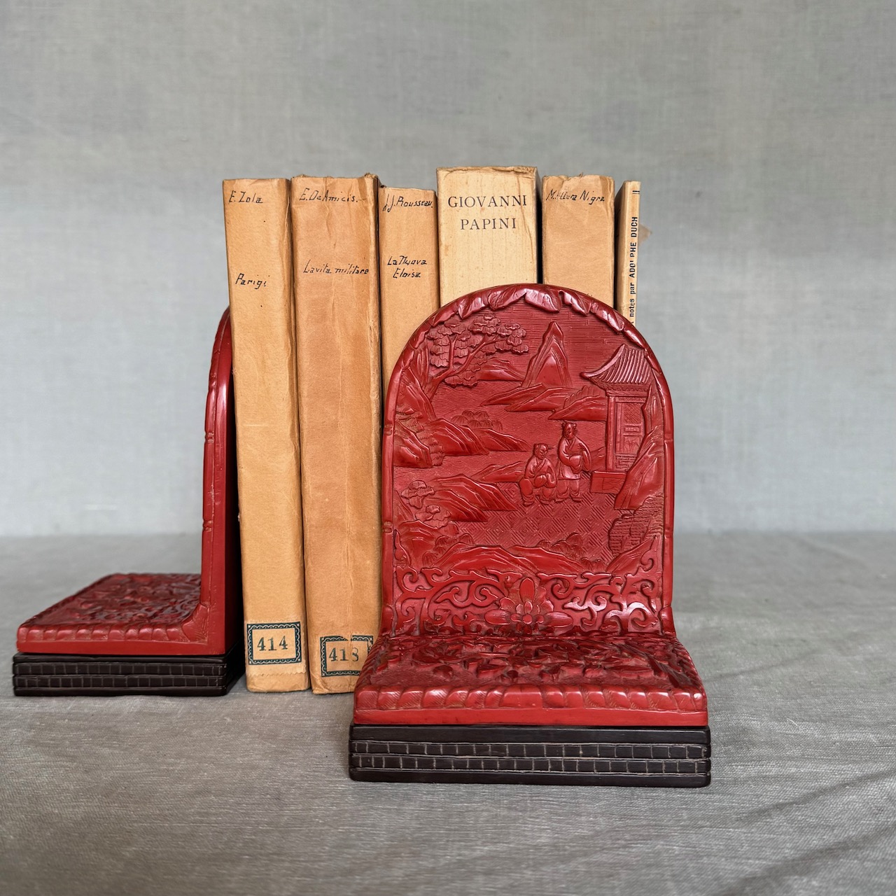 Coppia fermalibri in legno intagliato laccato rosso. Cina, sec. XX
