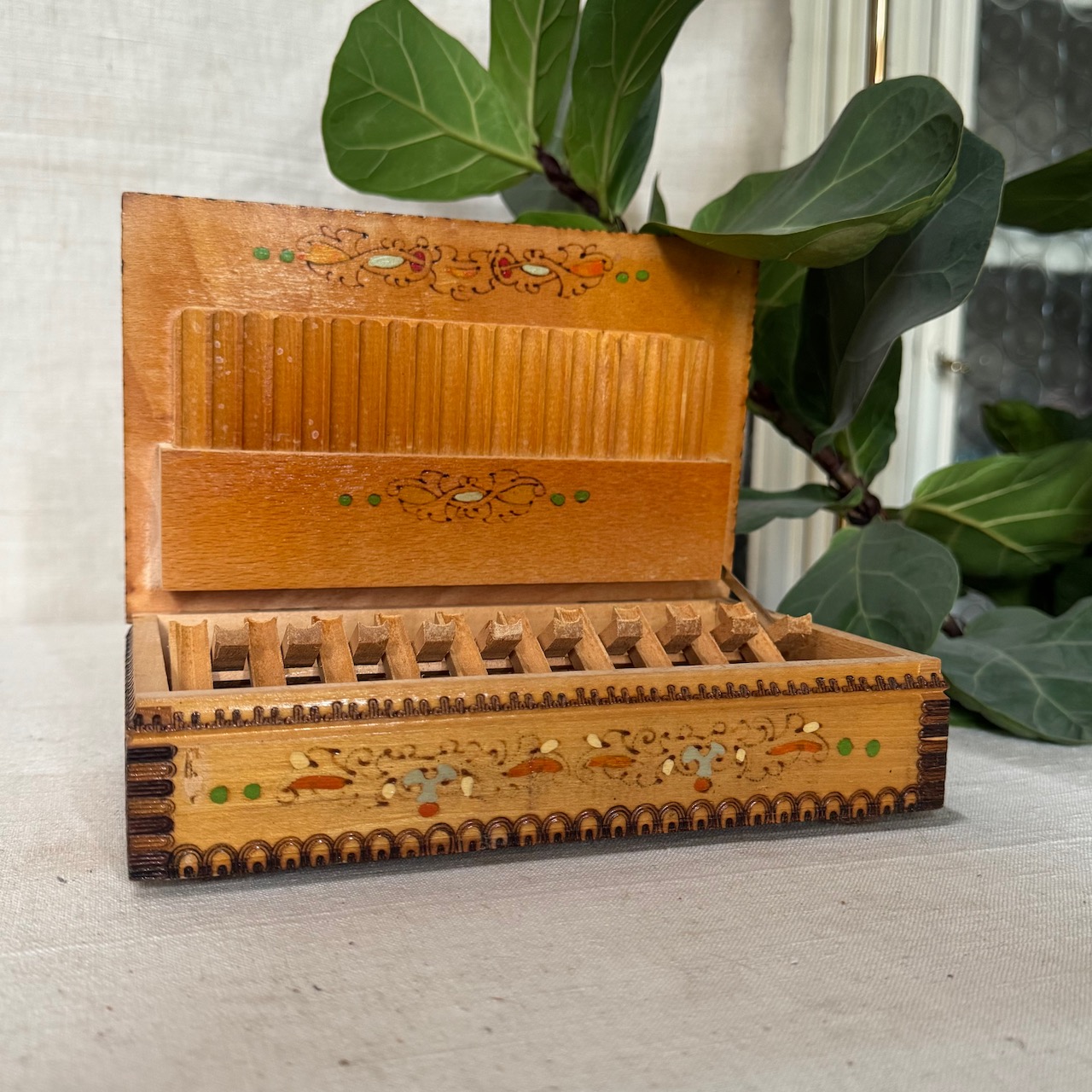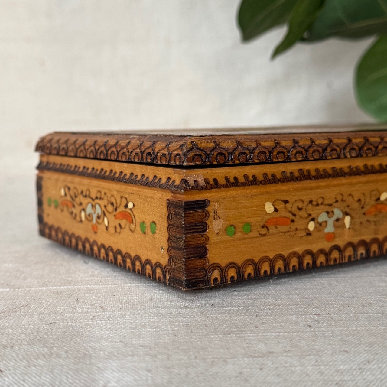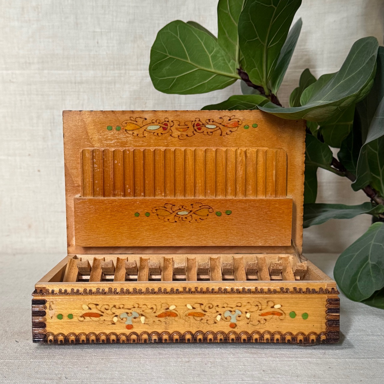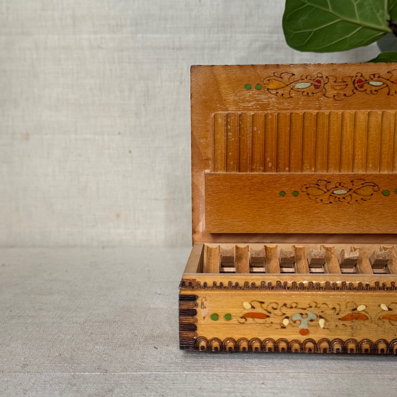 Scatola portasigarette Bulgara, in legno decorato a pirografia e dipinto a mano. Bulgaria, 1970 ca