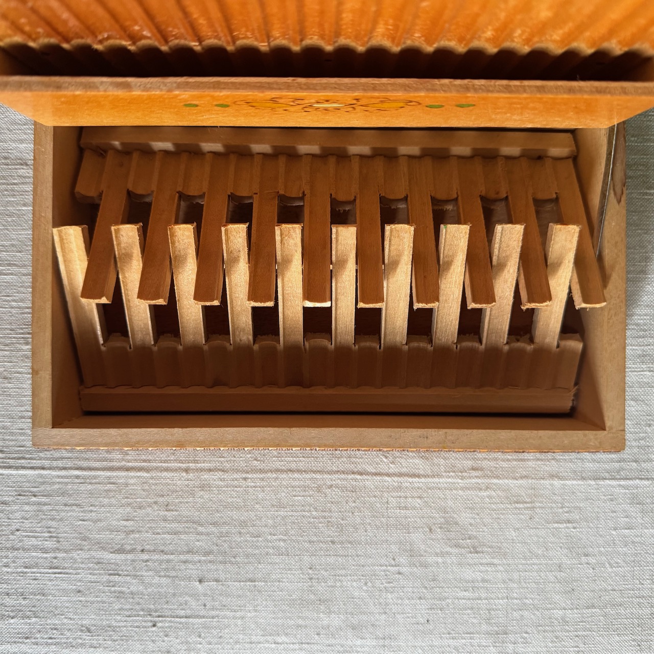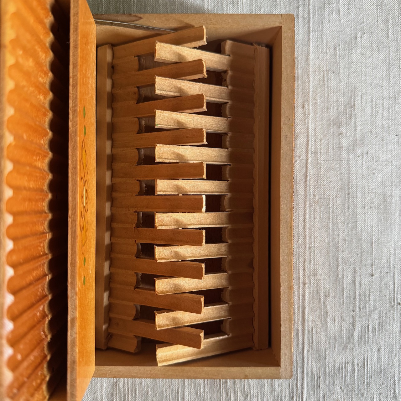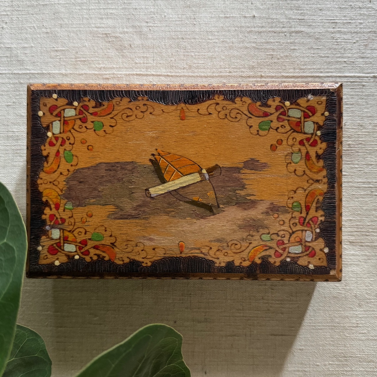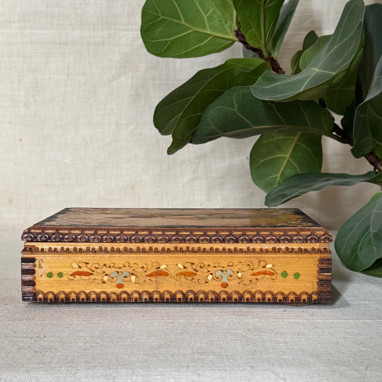 Scatola portasigarette Bulgara, in legno decorato a pirografia e dipinto a mano. Bulgaria, 1970 ca