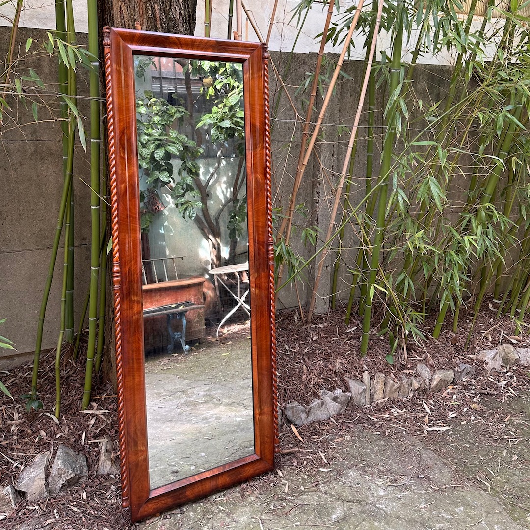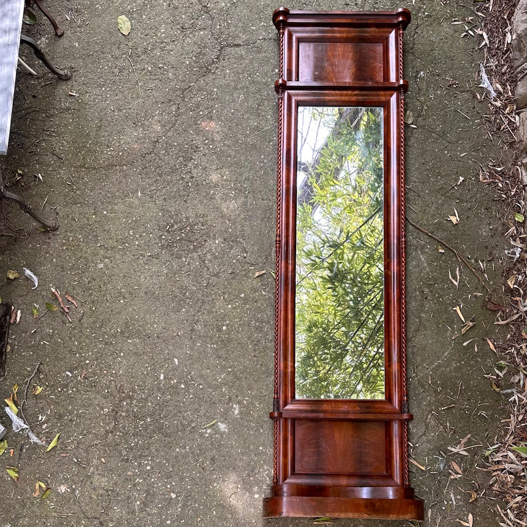 Specchiera Impero in piuma di mogano con laterali scolpiti colonna torchon. Italia, prima metà sec. XIX