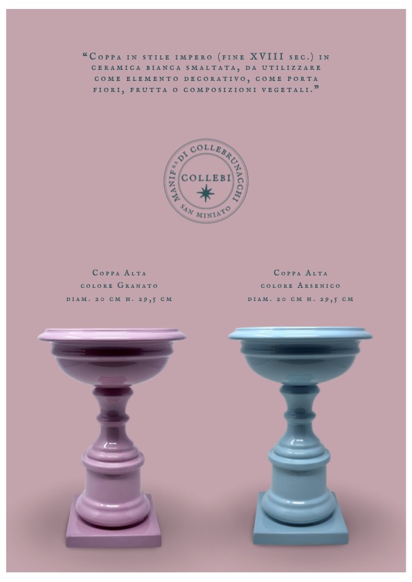 Collezione Coppe Alte in maiolica a policromia pastello, disponibile in sette colori. Collebi, Toscana