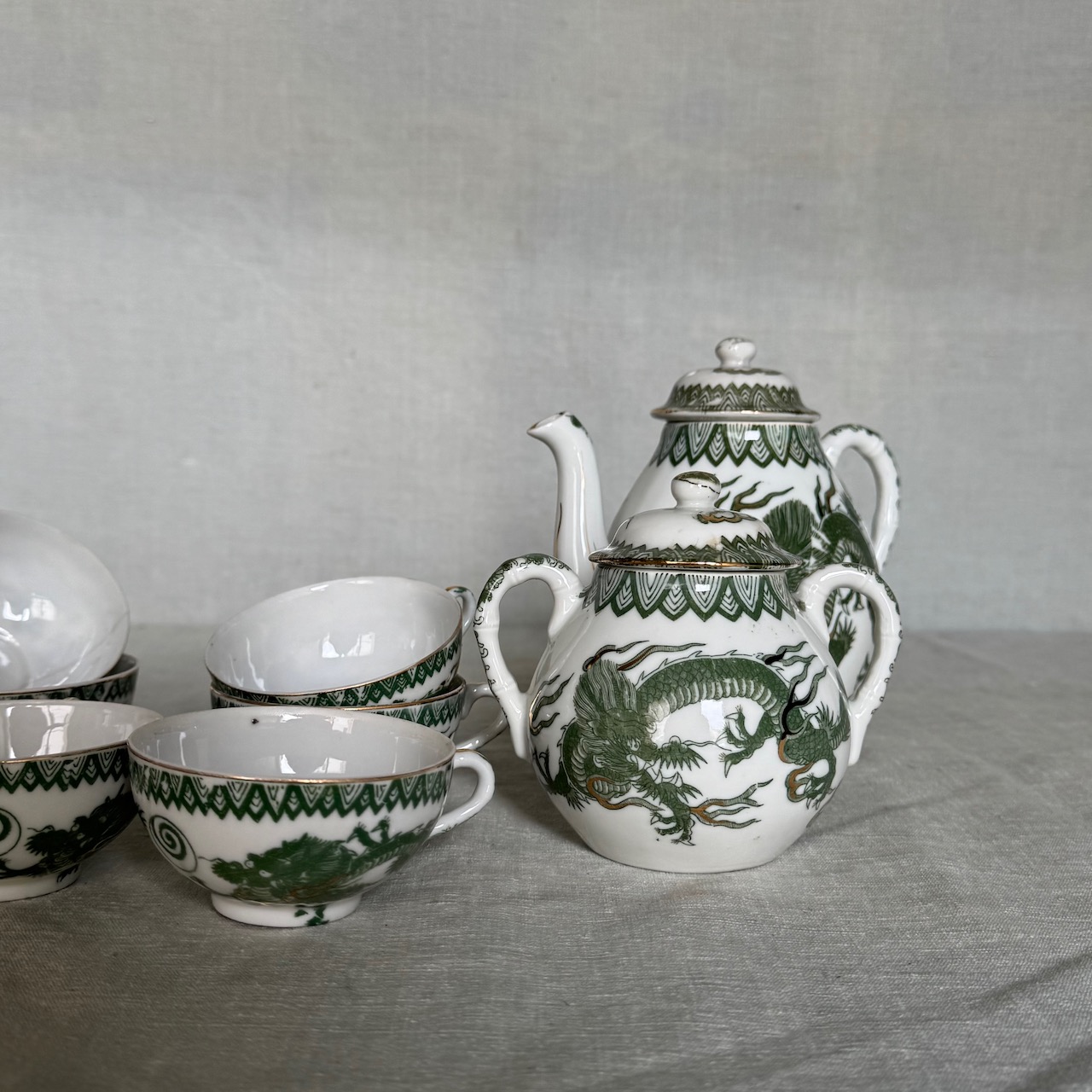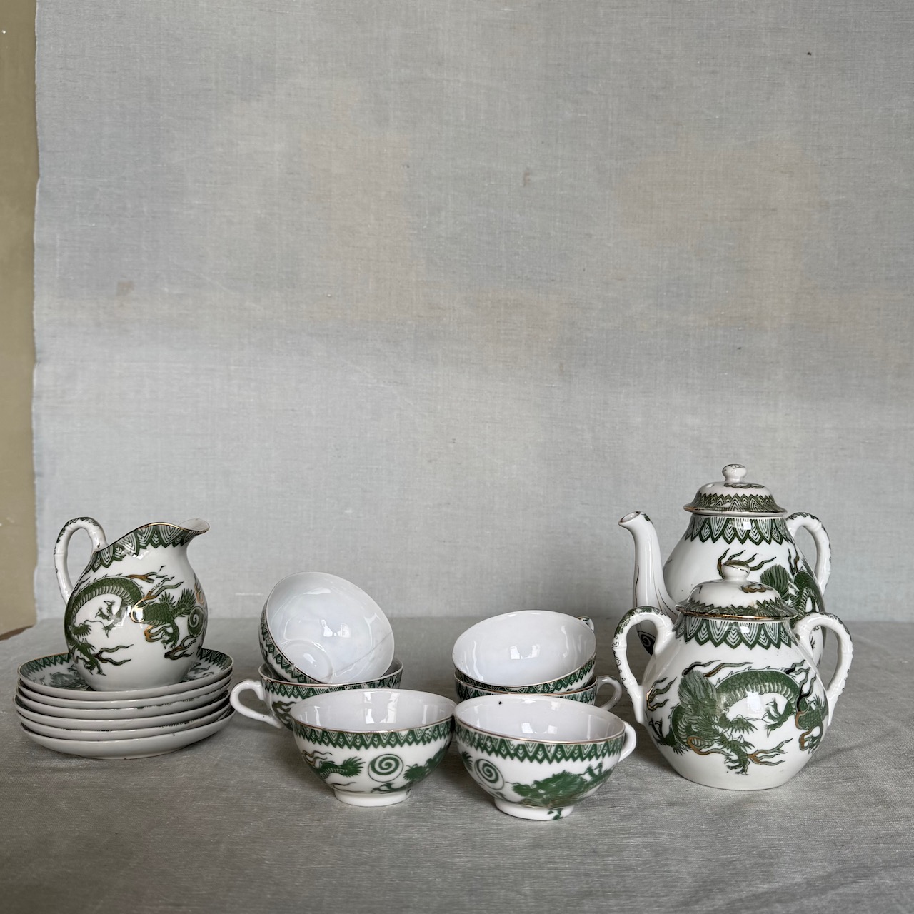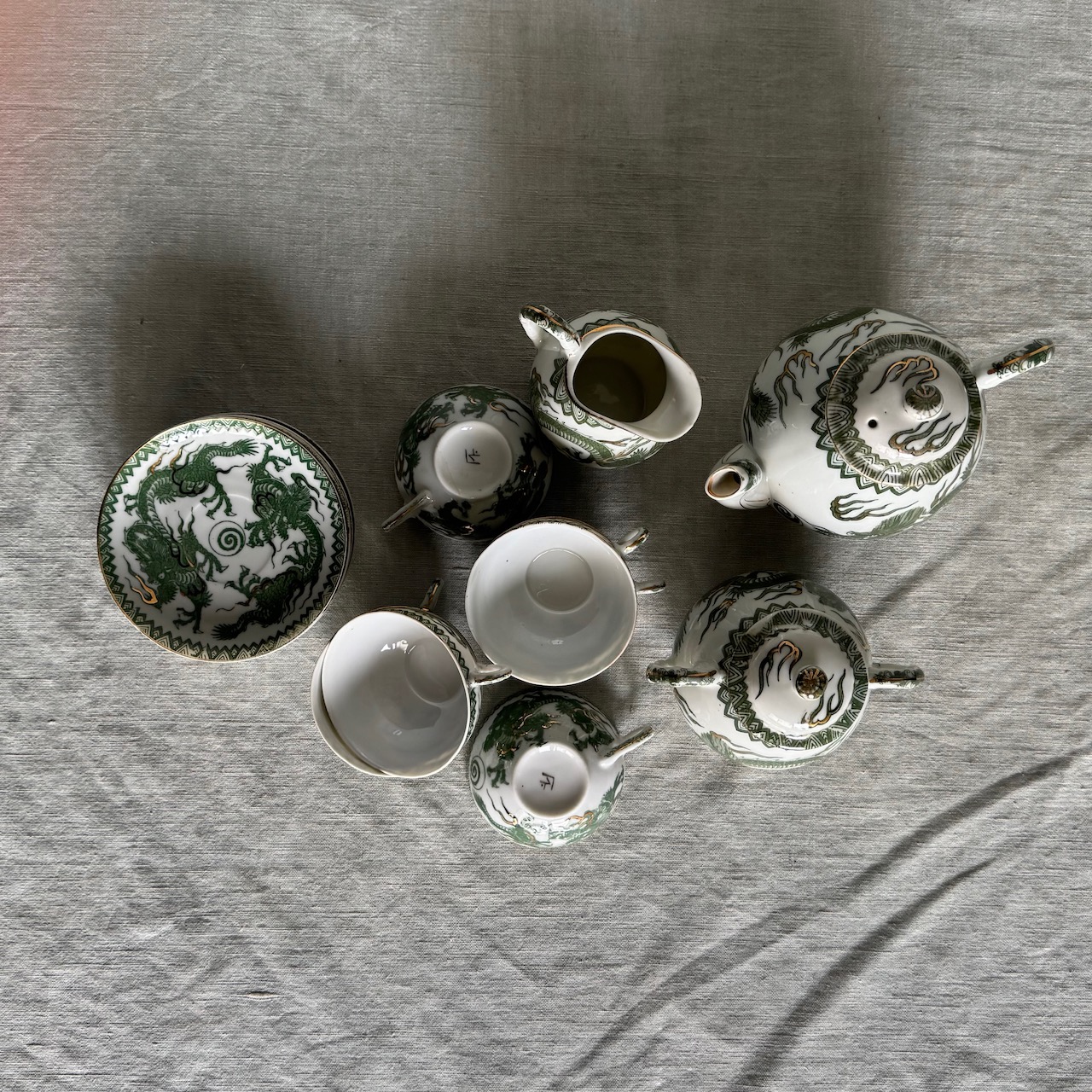 Servito da tè Giapponese in porcellana smaltata, decorata con draghi imperiali verde giada e dettagli dorati applicati a mano, sei tazze con piattini, una teiera, una zuccheriera, una lattiera. Giappone, 1950 ca