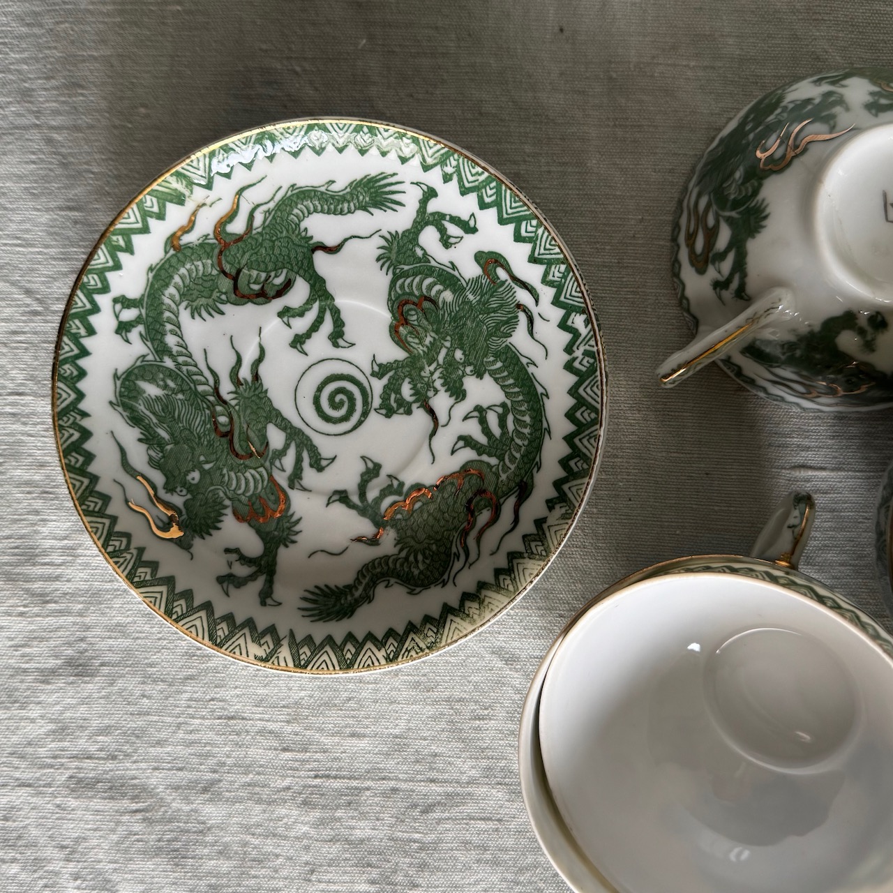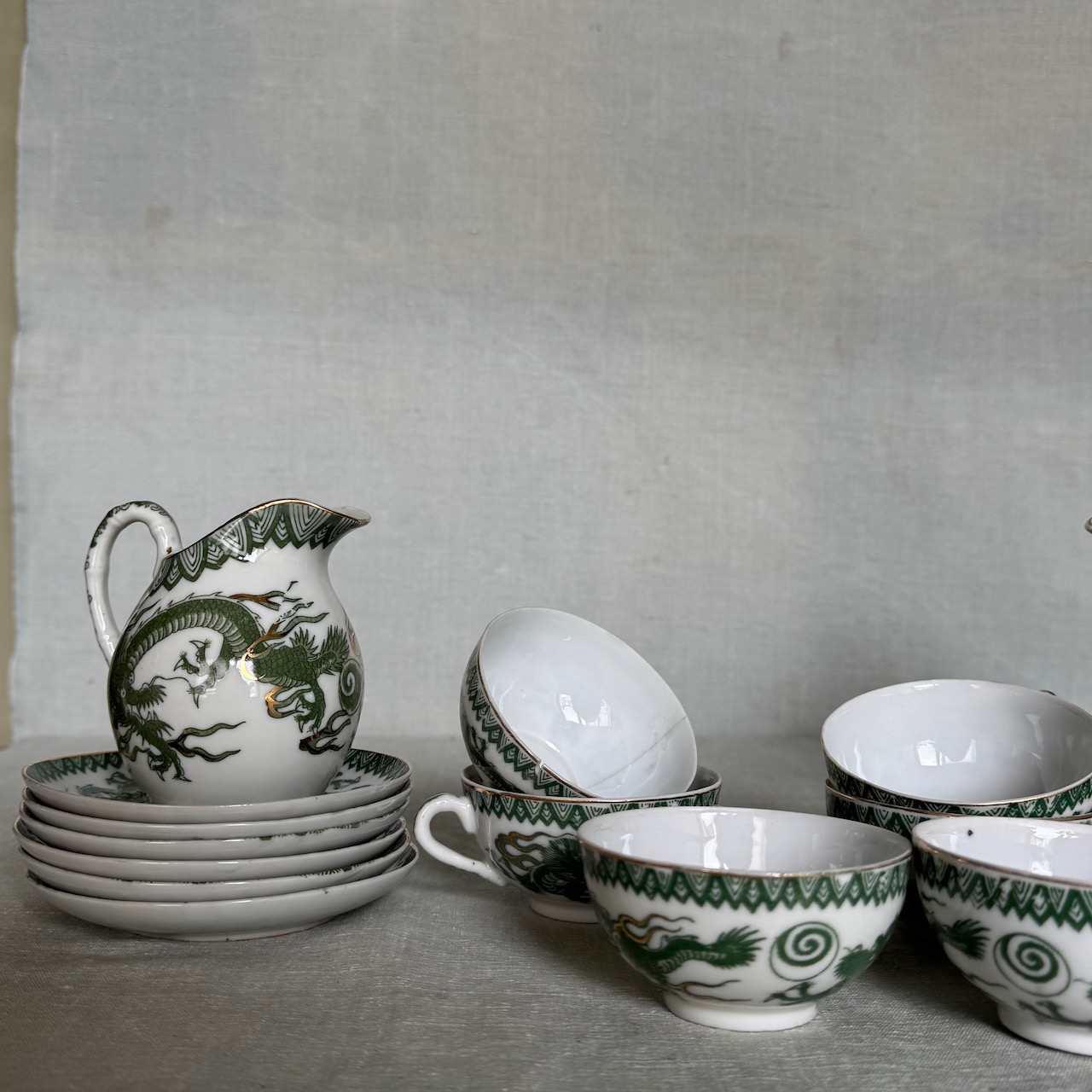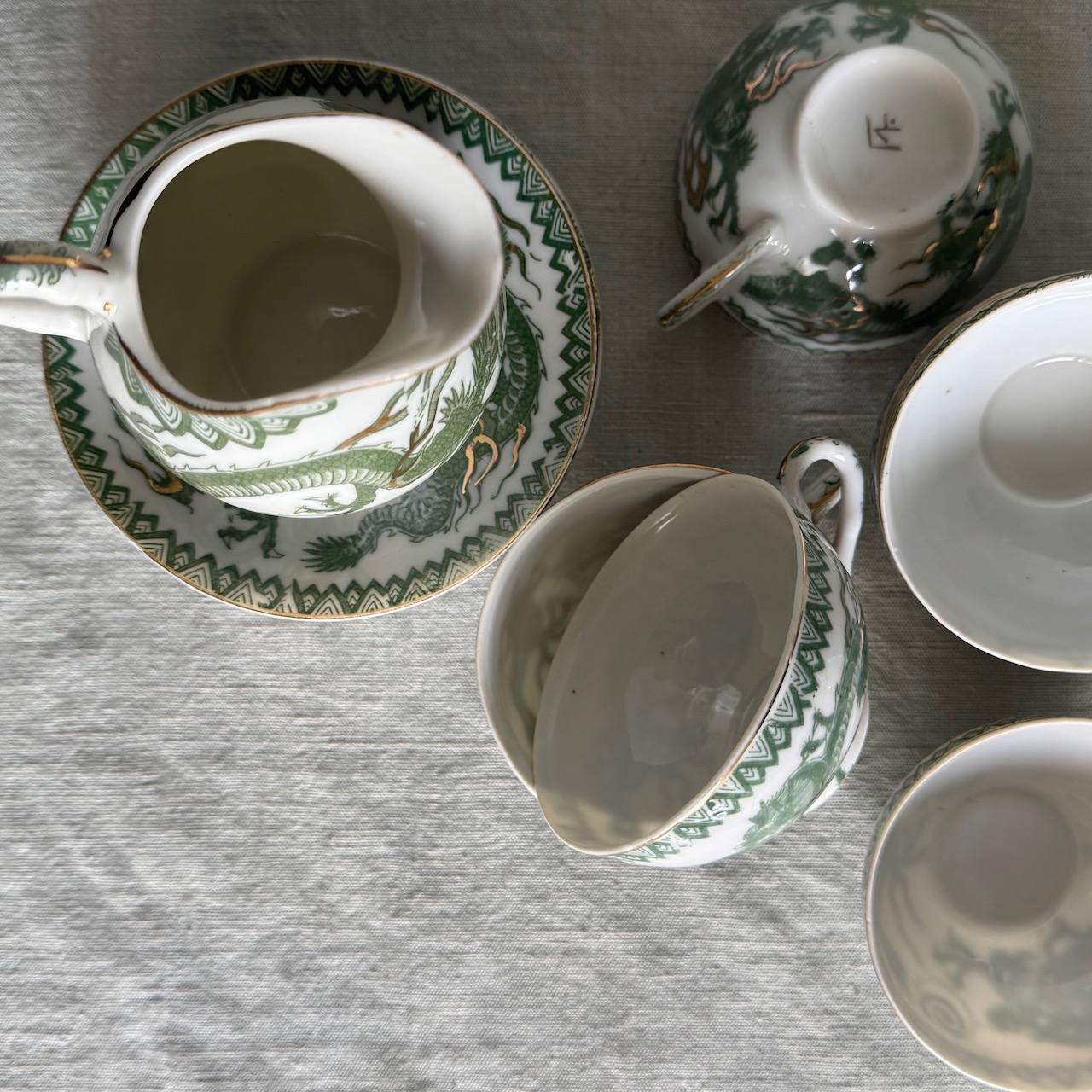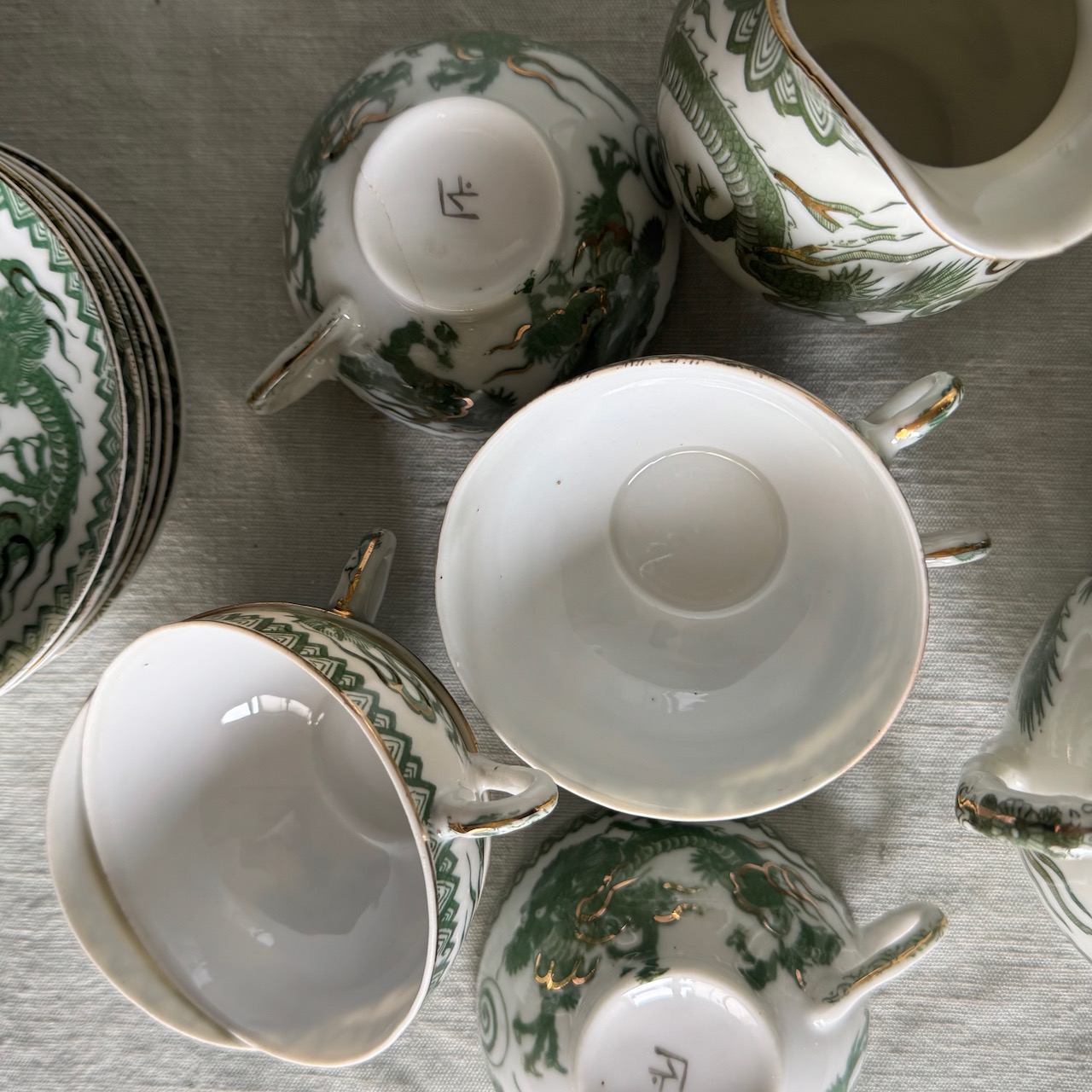 Servito da tè Giapponese in porcellana smaltata, decorata con draghi imperiali verde giada e dettagli dorati applicati a mano, sei tazze con piattini, una teiera, una zuccheriera, una lattiera. Giappone, 1950 ca