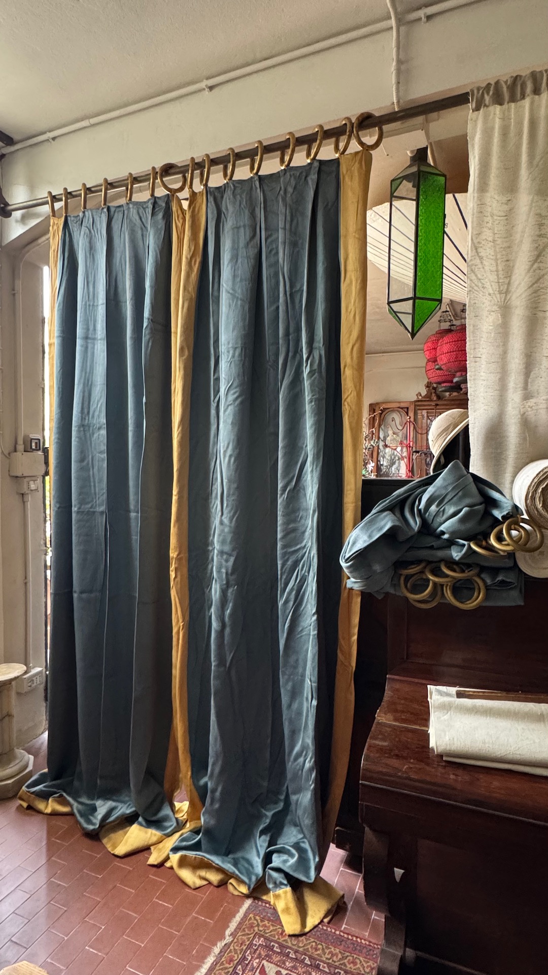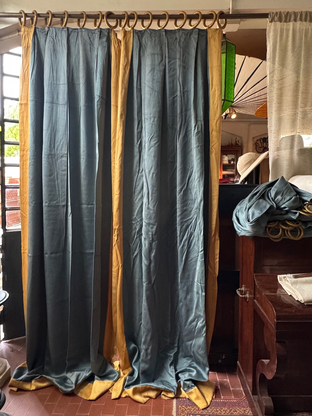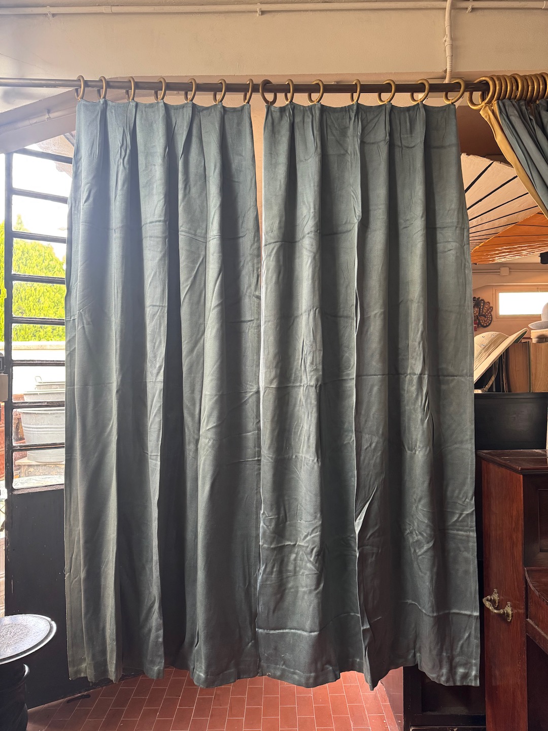 Coppia di tende in seta grigio azzurro, con grandi campanelle in legno dorato. Toscana inizio sec. XX