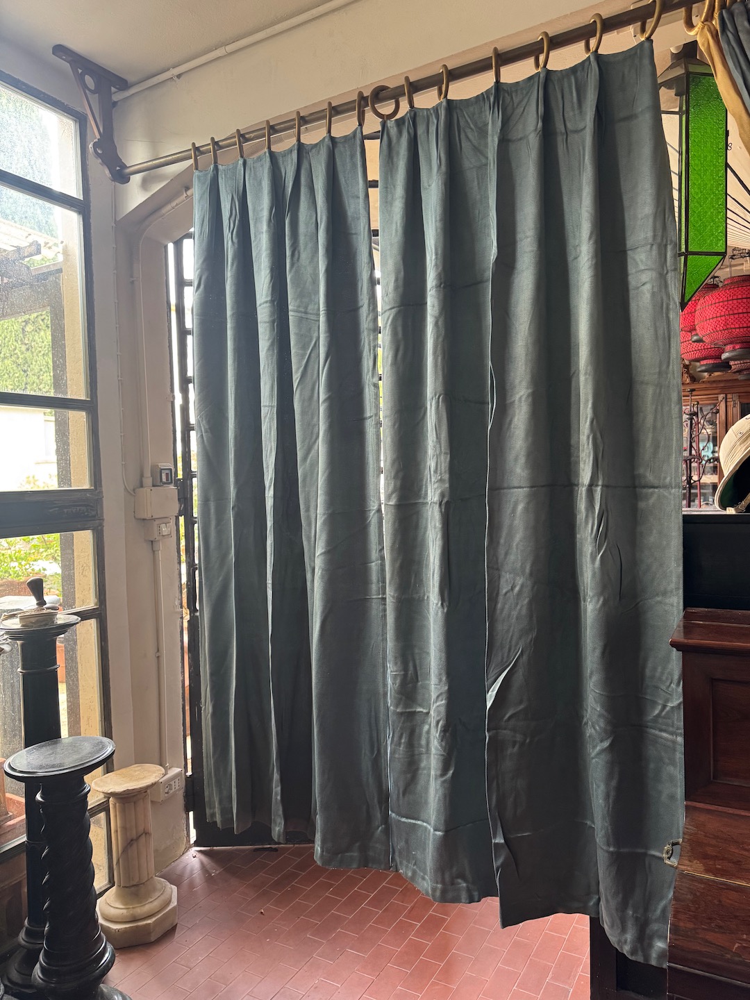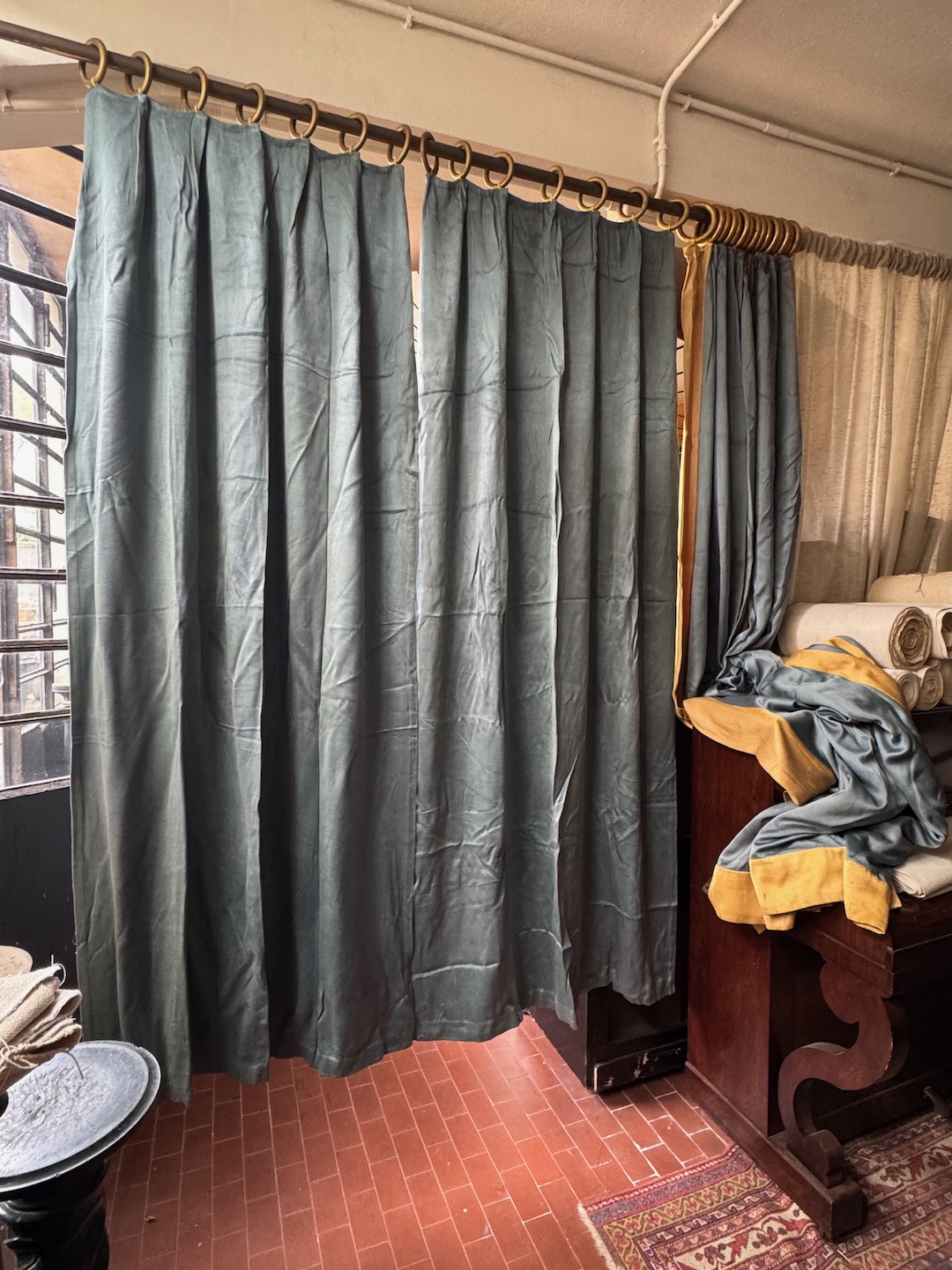 Coppia di tende in seta grigio azzurro, con grandi campanelle in legno dorato. Toscana inizio sec. XX