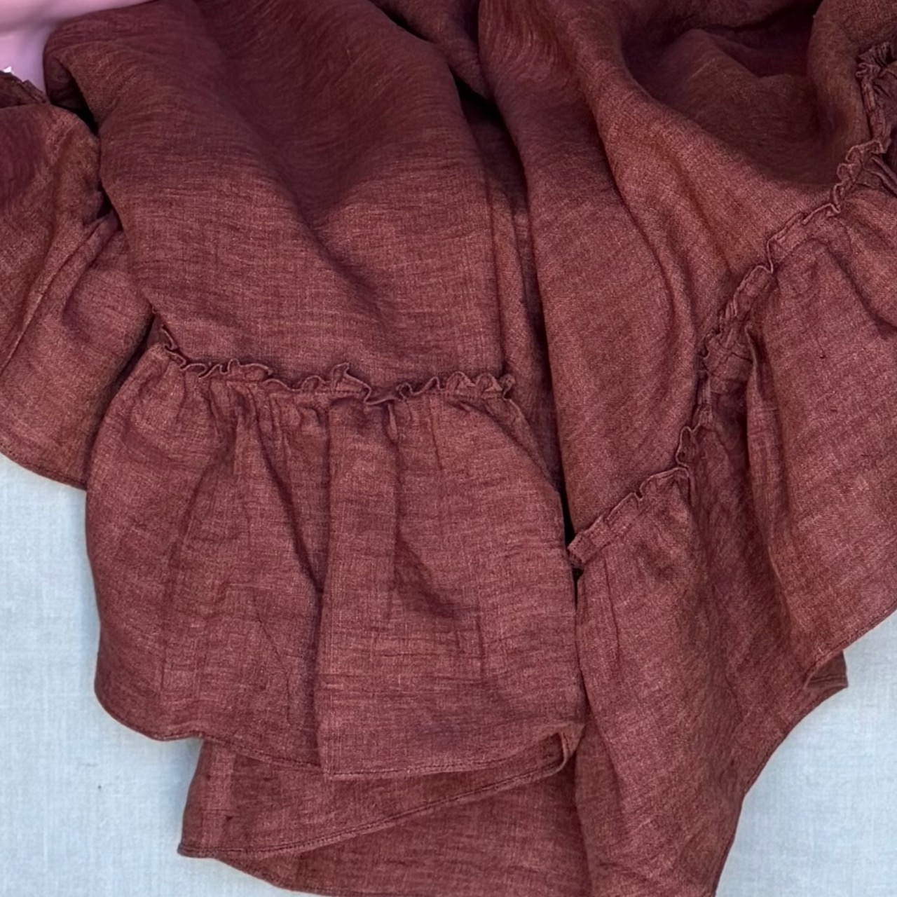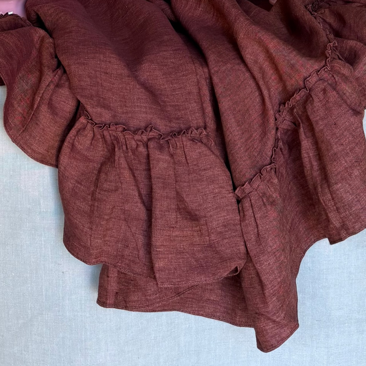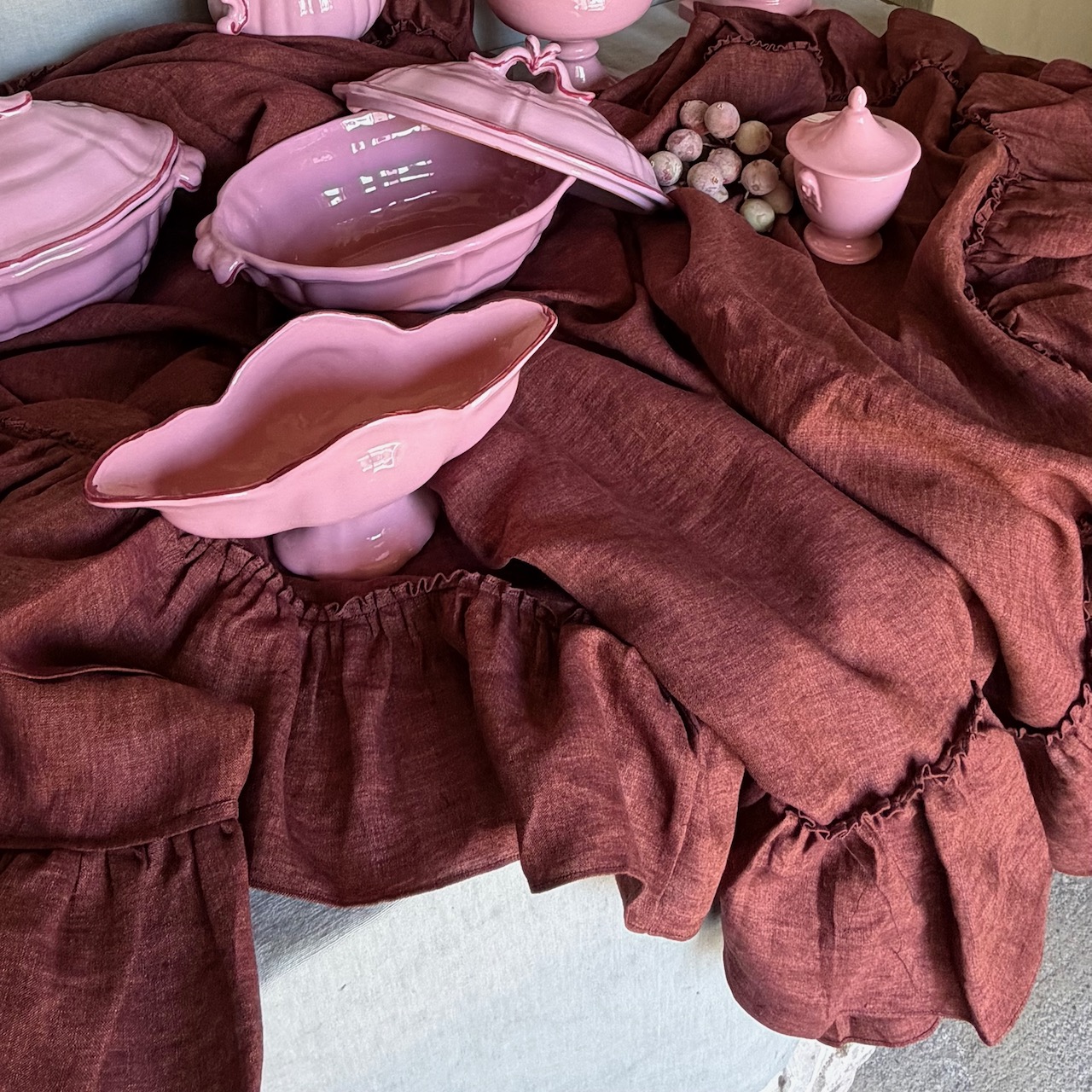 Tovaglia lino borgogna, rettangolare, balza a ruches. Italia