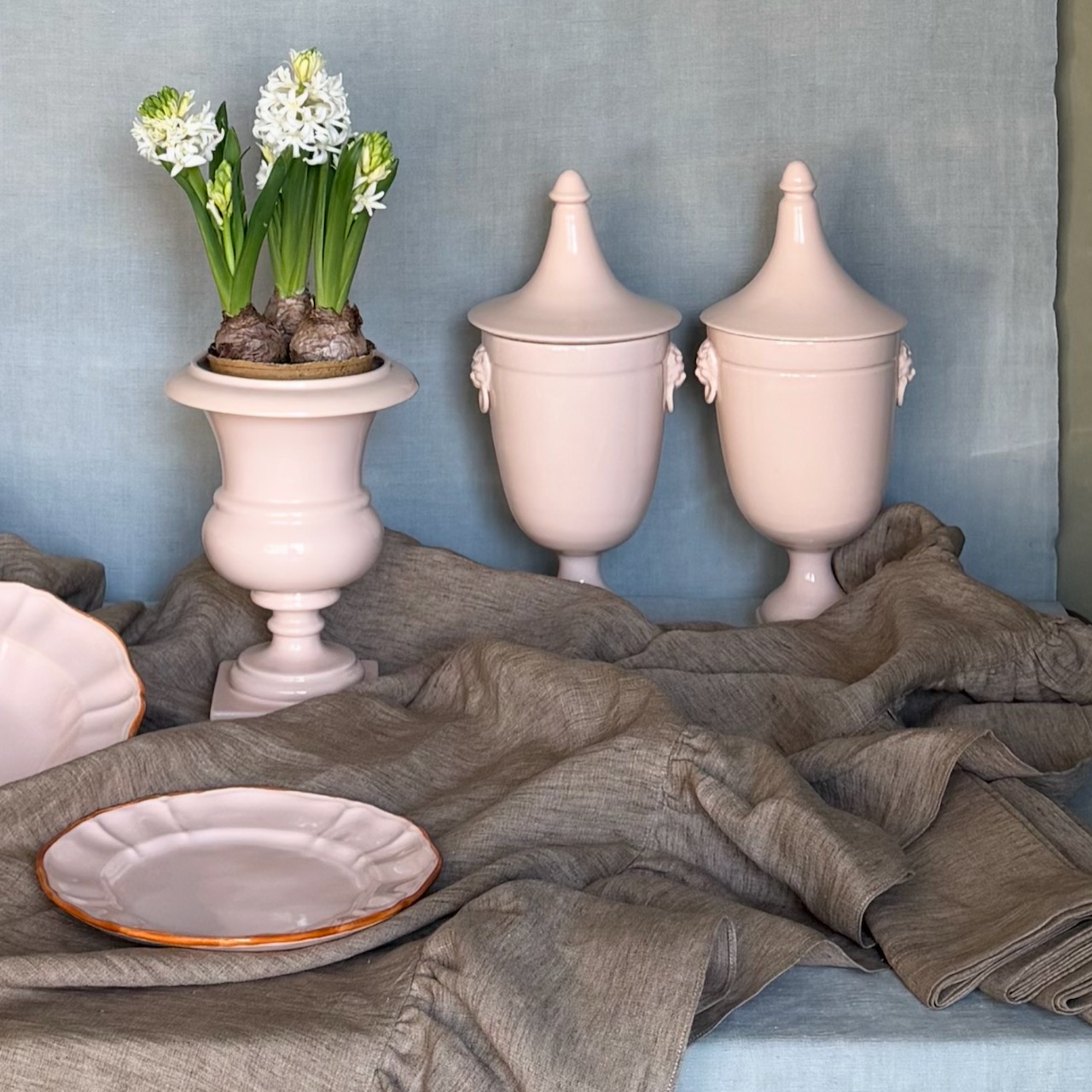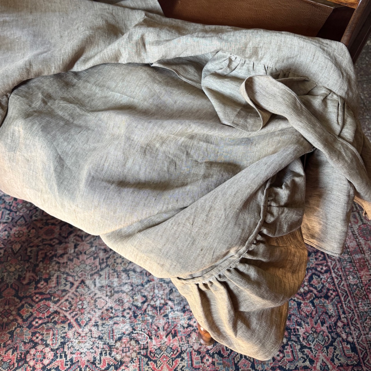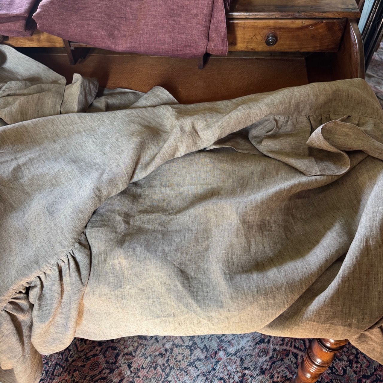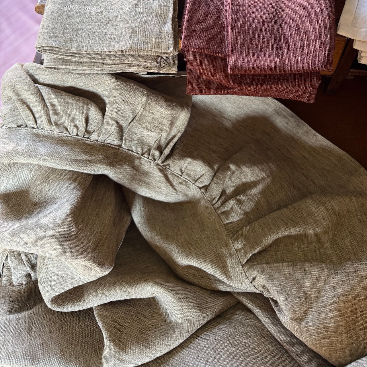 Tovaglia in lino color corda, rettangolare, con balza a ruches. Italia